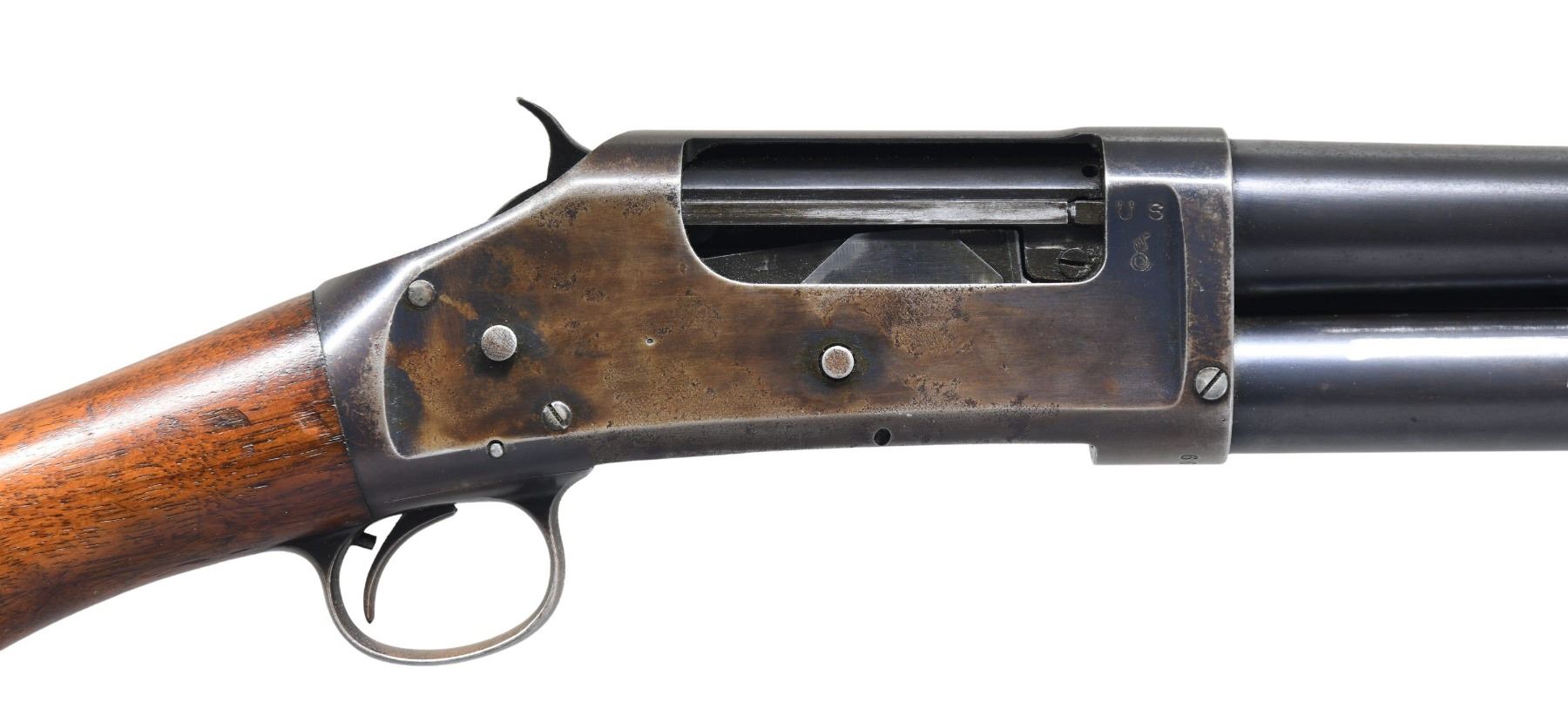 Cal. 12 ga. 2 3/4". S# E669849. Bbl. 20" cyl. bore. Bayonet lug w/ 6 row handguard. Solid frame action. Blue finish. Right side of receiver is stamped "US" over "flaming bomb" ordnance mark. Grooved round forearm & pistol grip stock w/ two screw inletted sling swivel & original buttplate. UNATTACHED ACCESSORIES: scarce M1917 Winchester bayonet marked "1917" over "W" in circle on left side. Right side marked with eagle head, flaming bomb & 2 "X"'s. bayonet housed in green leather scabbard & frog marked "JEWELL / 1917". Bayonet in good condition with age related patina appearing on small parts. Blade displays evidence of sharpening. CONDITION: bbl., mag. tube & handguard retain over 80% original blue showing slide wear w/ areas of freckling. Left side of receiver retains 90% lightly faded blue showing edge & carry wear. Right side of receiver has cold blue finish over areas of substantial pitting. Original wood finish shows numerous dents, scratches & marks. Sound action. Bore is generally bright showing scattered spots of pitting. (25-1659/DS). CURIO. $5,000-8,000.