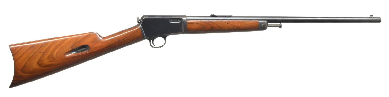 1) MODEL 1903. Cal. 22 Win. Auto. S# 28958. Bbl. 20" w/ original sporting sights. Walnut forearm & straight grip stock w/ crescent steel buttplate. Mag. tube loads through the stock. 1907 Mfg. CONDITION: 80% lightly faded blue showing spots of surface corrosion. Original wood finish shows wear w/ numerous dents & scratches. Dark lightly pitted bore. (20-3531/DS). 2) MODEL 63. Cal. 22 LR. S# 90673A. Bbl. 23" w/ original sporting sights. Walnut forearm & pistol grip stock w/ stamped steel buttplate. Mag. tube loads through the stock. CONDITION: 80% dull blue showing scattered corrosion & cold blue touch up. Sanded & refinished wood showing light marks. Bore retains sound rifling. (20-3532/DS). ALL CURIO. $700-1,000.