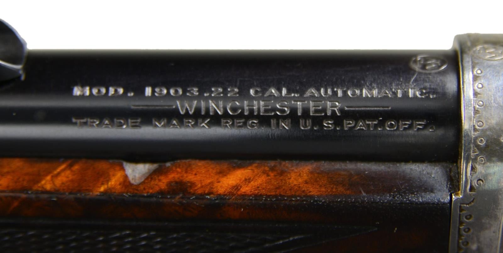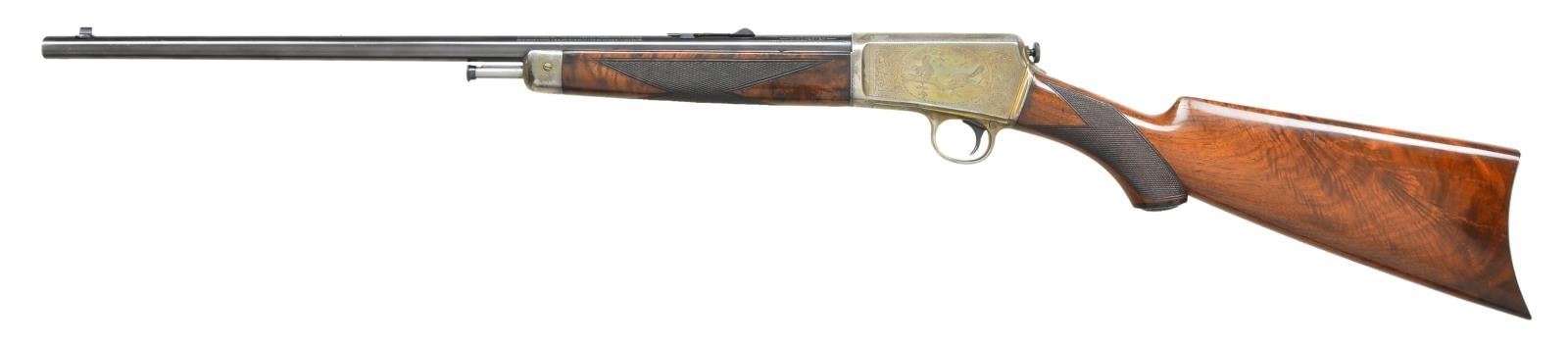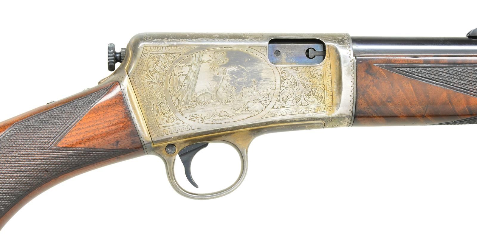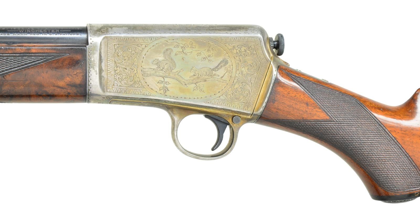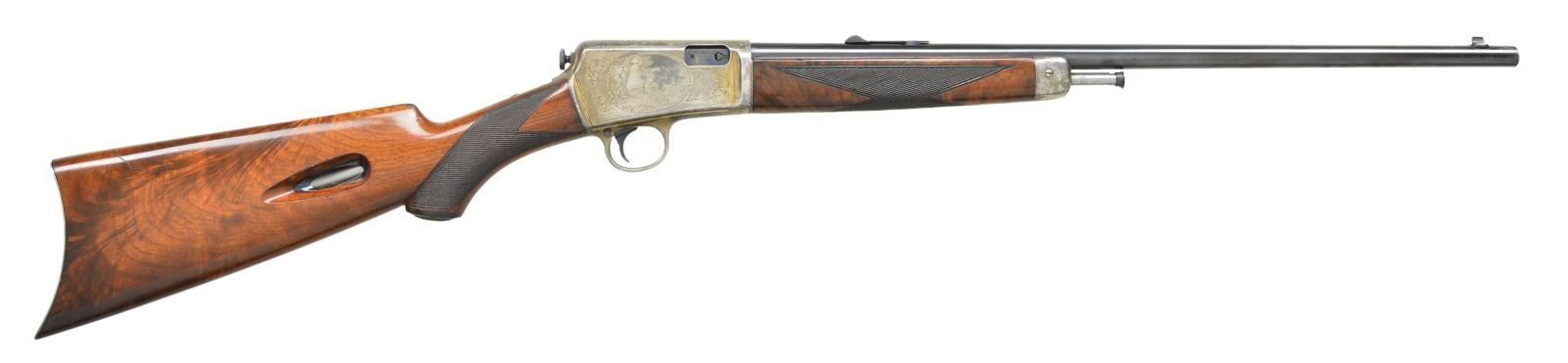 DELUXE SELF LOADING RIFLE. Cal. 22 Win. auto. S#82993. This beautiful rifle was factory engraved by Alden George Ulrich. George Ulrich was an in house engraved until his sudden death in 1949. Left side has the familiar squirrel scene with the rabbit scene on the right. The surrounding borders and scroll are indicative of Ulrich's work and extend to top and bottom areas as well as the forend cap. The action, forend cap and crescent steel buttplate are silver finished. The 20" barrel has blue finish with original bead front and No. 40A rear sights. The forearm and fancy walnut deluxe pistol grip stock feature style "H" checkering and a small hard rubber grip cap. Between 1903 and 1936 an estimated 126,000 M1903's were produced. The serial number of this rifle indicates 1915 mfg. CONDITION: The silver finished parts show a natural dark tarnish that is consistent with a rifle of this age that has not seen extensive cleaning. The bbl. retains over 95% lightly faded blue showing slight muzzle wear and scratches. The original wood finish and checkering show light crazing and have scattered scratches and marks. The bore is bright with strong rifling. (22-4802/DS). CURIO. $12,000-18,000.