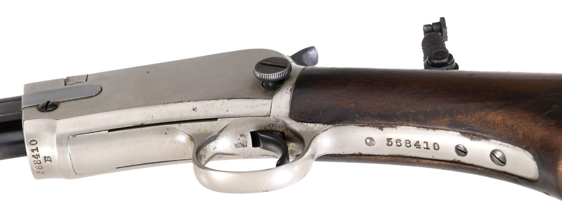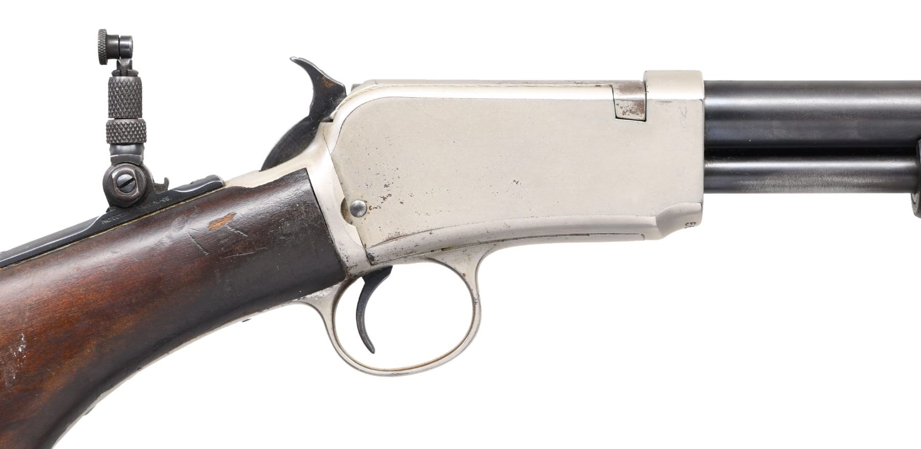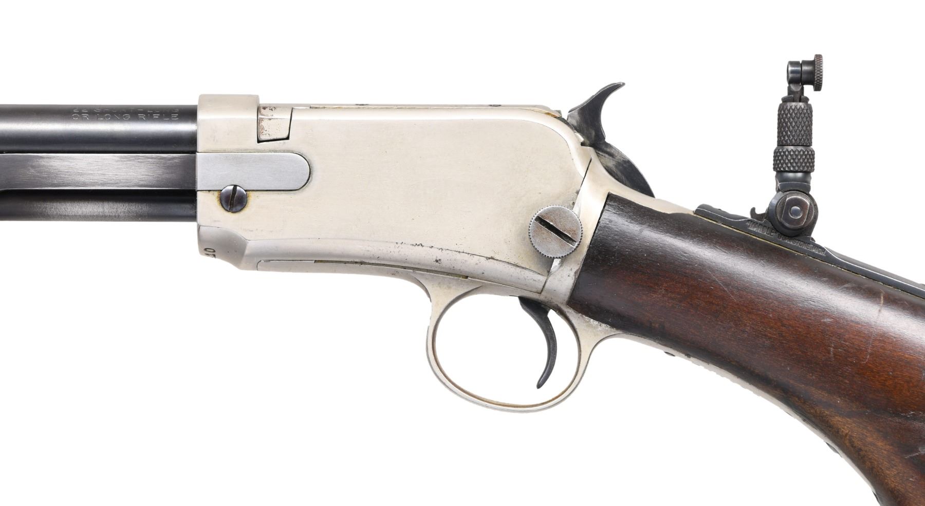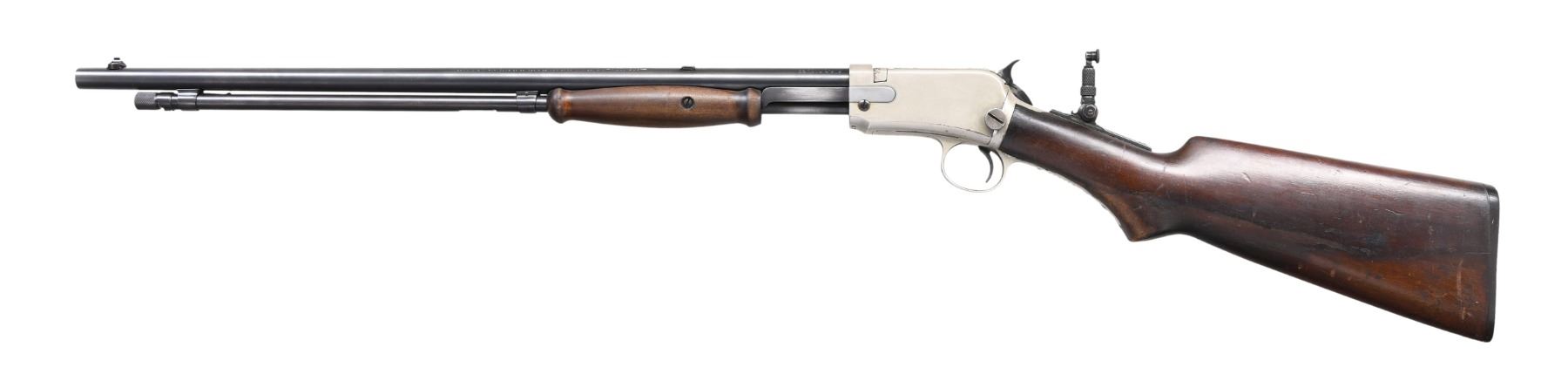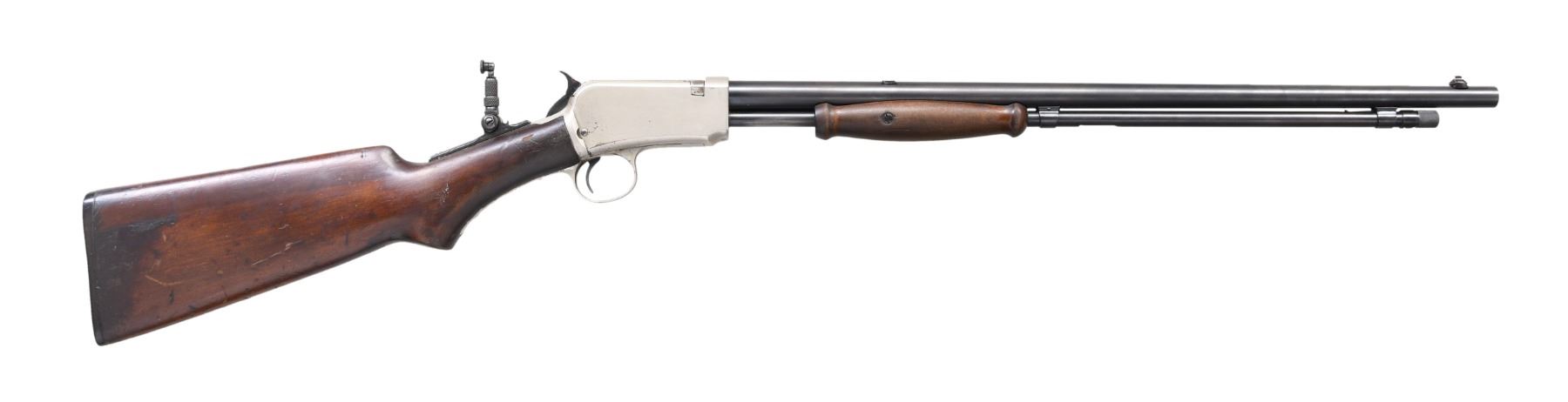 Cal. 22 SLLR. S# 568410B. Bbl. 20" round. King patent triple bead front sight, filler in rear dovetail w/ Marble combination tang sight. Tubular mag. Gumwood pistol grip stock w/ wagon wheel buttplate & milk pail style slide handle. Serial number indicates 1920 mfg. CONDITION: bbl. & mag. tube have 90% dull reblued finish. Action retains 90% original nickel finish having a dull appearance w/ scattered spots of finish loss. Unsanded stocks have spots of added finish over scratches, handling marks & small dents. Bright bore retains very good rifling. (24-944/DS). CURIO. $1,200-1,800.