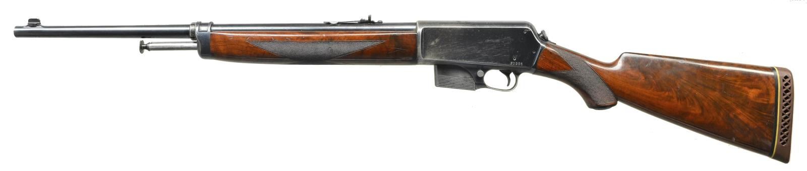 Cal. 351 SL. S# 20906. Bbl. 20". Replacement blade front sight with replacement Marbles flat top sporting rear sight. Left side of receiver has 3 open holes from receiver sight attachment. Forearms & small hard rubber capped fancy walnut have factory style "H" hand checkering. LOP 14" over aftermarket Pachmayr pad. Mfg. 1910. MAGS: 1-5 rd. mag. CONDITION: 70% lightly faded blue showing spots of freckling, scratches & carry wear. Original wood finish shows wear & handling marks. Bore is slightly dark with worn rifling. (22-5212/DS). CURIO. $900-1400.