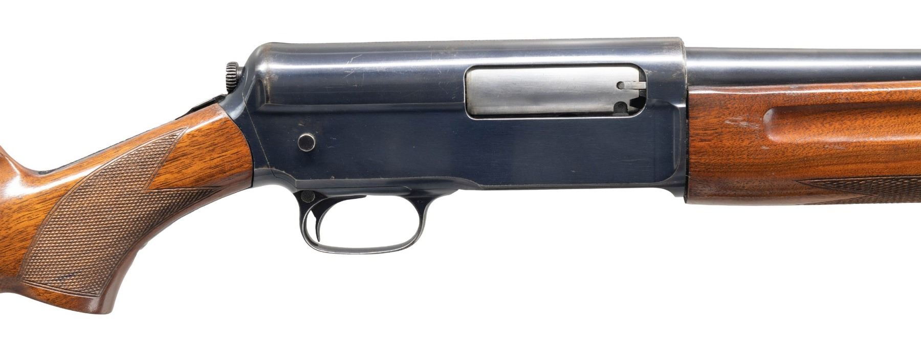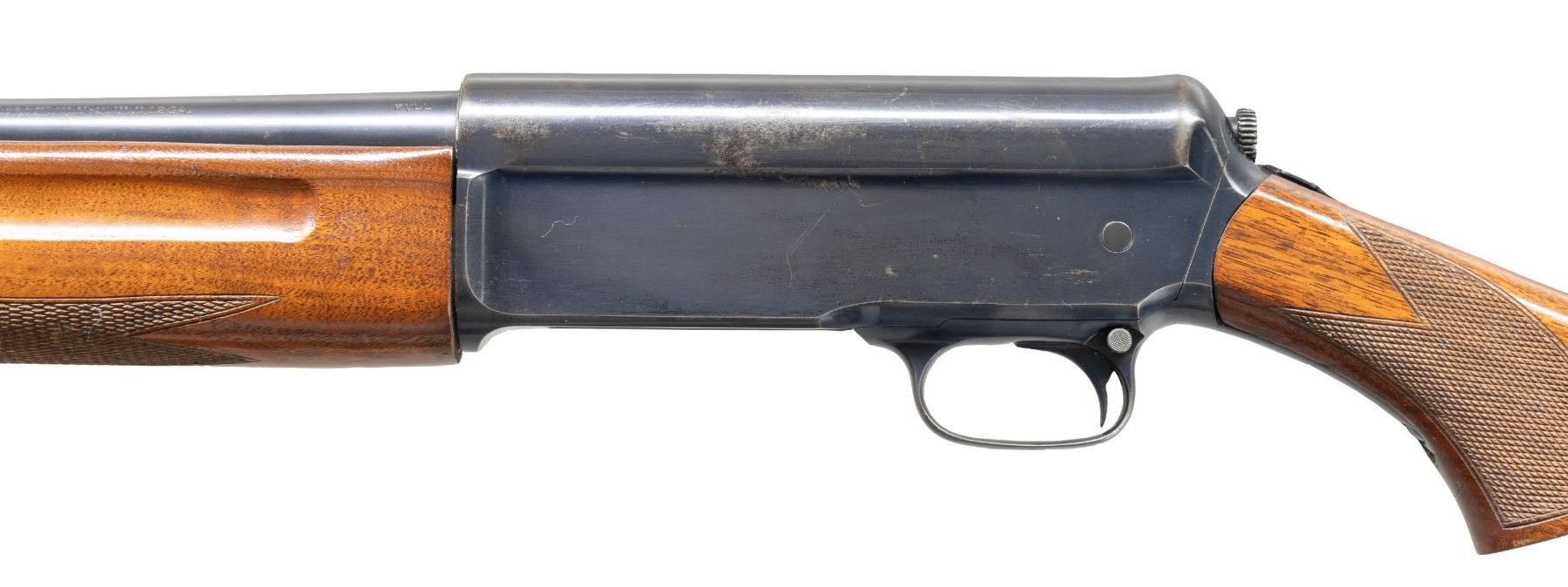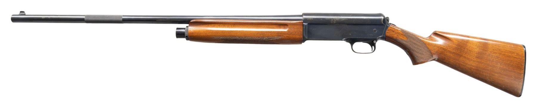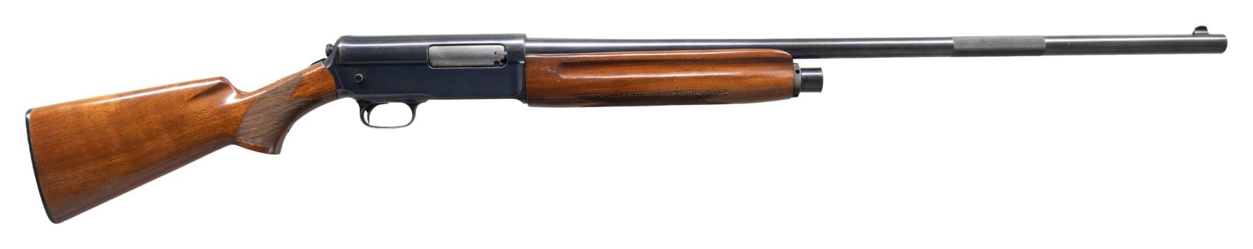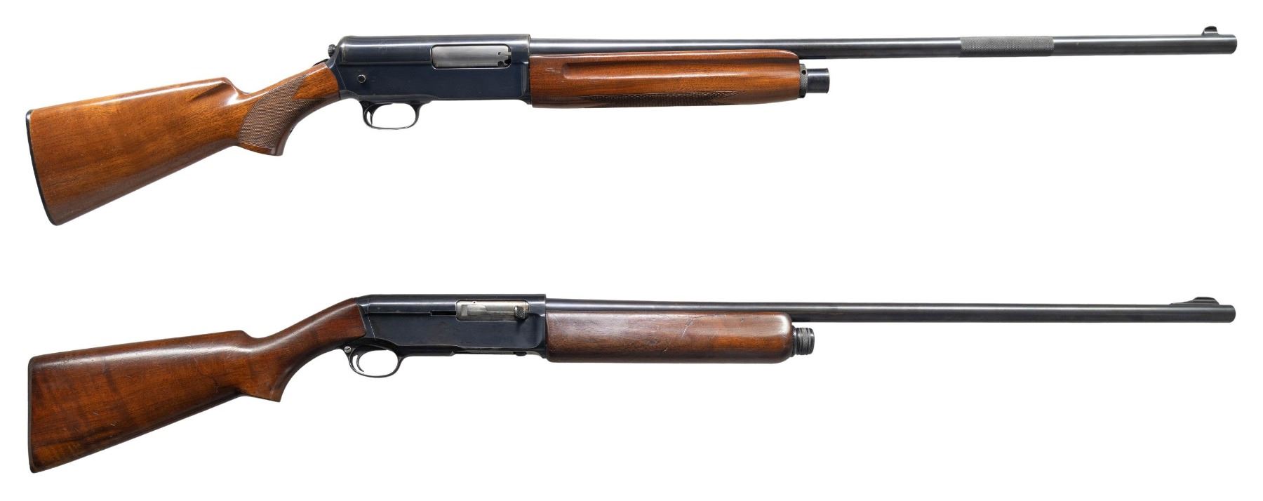 1) MODEL 1911 "WIDOWMAKER" SELF-LOADING. Cal. 12 GA. S# 16039. Bbl. 28 1/8". Model 1911 self-loading shotgun mfg. by Winchester in 1912 (second year of production). Left side of the bbl. exhibits standard markings denoting Winchester's mfg. and patent information, followed by the cal. designation and a "FULL" choke marking. Model designation present on the upper receiver tang. Metal components exhibit a blue finish overall, save for on the bolt, which is polished in-the-white. Replacement checkered wood finger groove forearm and checkered pistol grip buttstock with checkered black synthetic Winchester buttplate. Blade front sight. CONDITION: metal components retain the majority of their original blue finish, showing light to mild edge wear, some scattered spots of light surface oxidation / pitting, as well as areas of mild pitting on the receiver. Bore is relatively bright, exhibiting scattered spots and patches of light to mild pitting. Proper manual mechanics. Wood furniture shows some scattered scratches and marks from handling and storage, but otherwise remains sound. (25-4464/MLW). 2) MODEL 40. Cal. 12 GA, 2 3/4". S# 6480. Bbl. 30 1/8". Model 40 semi-automatic shotgun mfg. by Winchester in 1940 (second year of production). Standard markings on left side of bbl. denoting Winchester's mfg. information, followed by the model and cal. designations above "FULL". Metal components exhibit a blue finish overall, save for on the bolt assembly, which is polished in-the-white. Plain wood forearm and pistol grip stock with checkered brown hard rubber Winchester buttplate. Blade front sight. CONDITION: metal components retain large amounts of their original blue finish, showing some light to mild wear, with scattered spots and patches of light to mild pitting present primarily on the left side. Mirror bore. Proper manual mechanics. Wood furniture shows scattered marks, scratches, and impressions from handling and storage. Left side of forearm exhibits a crack stemming from the left side of the receiver. Left side of stock exhibits a crack on the wrist, stemming from the receiver, with another crack on the comb that is stemming from the buttplate. (25-4513/MLW). ALL CURIO. $800-1,200.