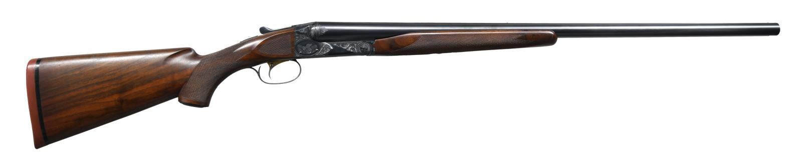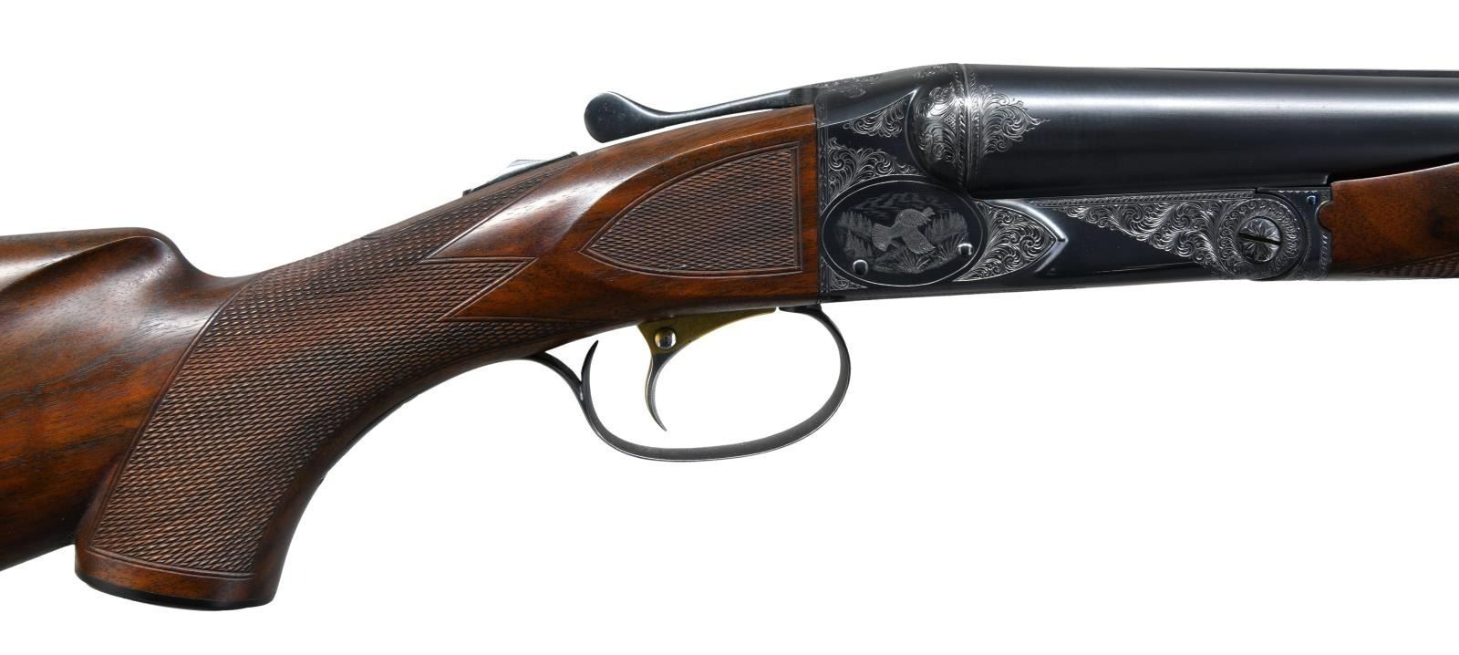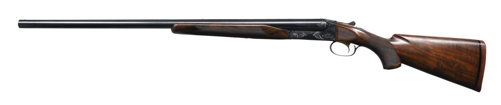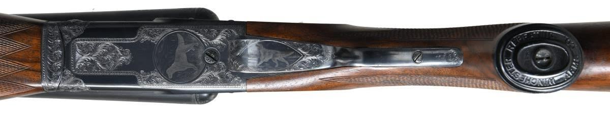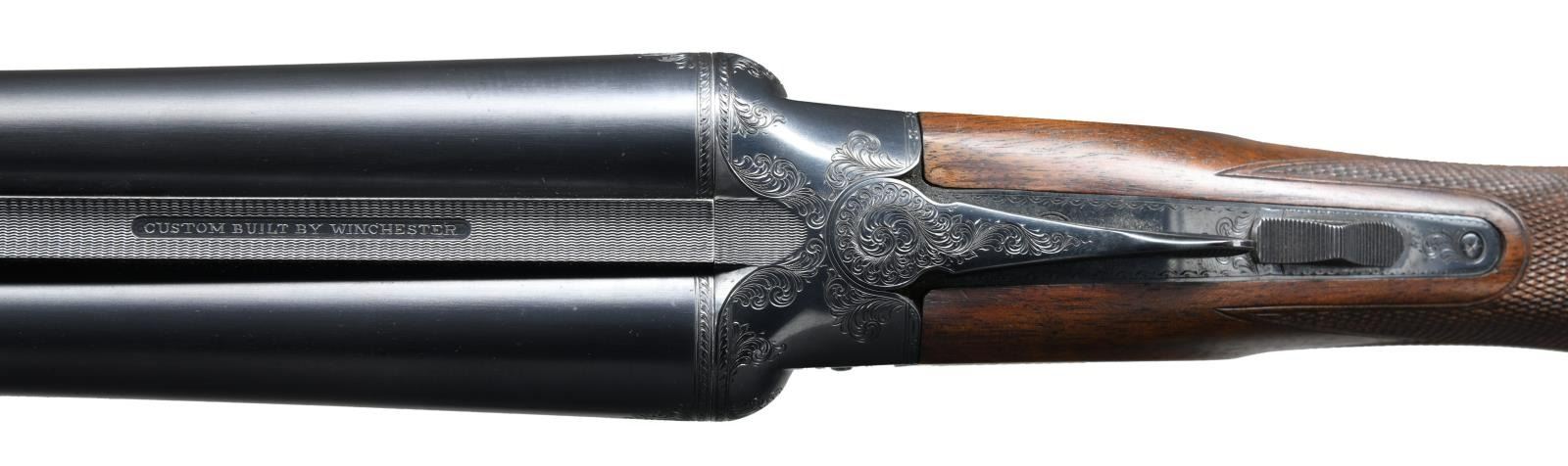 Cal. 12ga 2-3/4". S# 12059. Bbls. are 28", rib is engraved "CUSTOM BUILD BY WINCHESTER". White front bead & steel mid bead. Bbls. are fitted for Briley interchangeable chokes, no tubes included. Blued boxlock action has custom hand engraving similar to the factory no .5 style. Engraving features vignettes of pheasant of left side,& turkey on the right with setters on the floorplate & trigger guard bow. Balance of the action has moderate coverage w/ scroll engraving w. ornate borders that extends to forearm iron & breech end of bbls. Gold finished SST. Selective ejectors. Custom beavertail forearm & capped pistol grip stock of satin finished fancy walnut. Custom point pattern hand checkering w/ additional checkering on the stock ears. LOP: 14" over solid red Winchester pad. DAC: 1-5/8". DAH: 2-1/4". Neutral cast. WEIGHT: 7 lbs, 14 oz. UNATTACHED ACCESSORIES: Cody firearms record check lists this gun as "Standard Grade" and confirms the specifications. It was made for: Son, Kingsley, order number: 1413-62 item #1. Inspection Started: October 09, 1937. Inspection Finished: October 13, 1937. CONDITION: fine as refurbished. Over 98% custom reblued finish. Trigger retains 50% gold finish. Custom stocks have very good finish. Very good bright bores have very good forcing cones. (23-2184/DS) CURIO. $4,000-6,000.