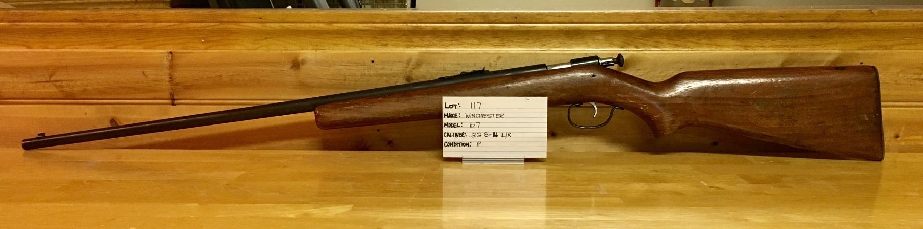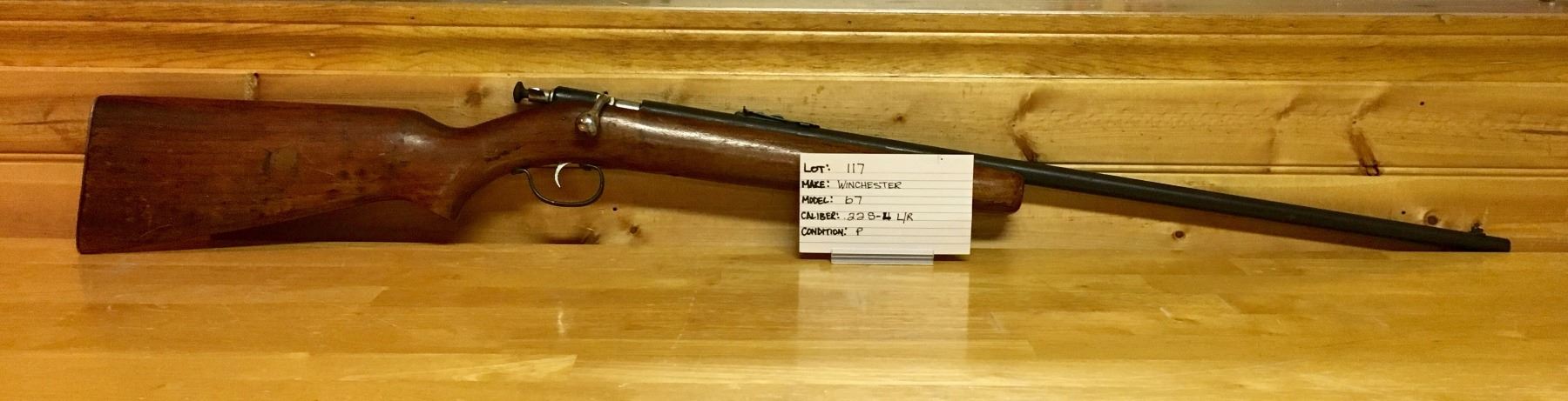 LOT: 117 MAKE: WINCHESTER MODEL: 67 CALIBER: .22 S - L L/R CONDITION: P S/N: 64139