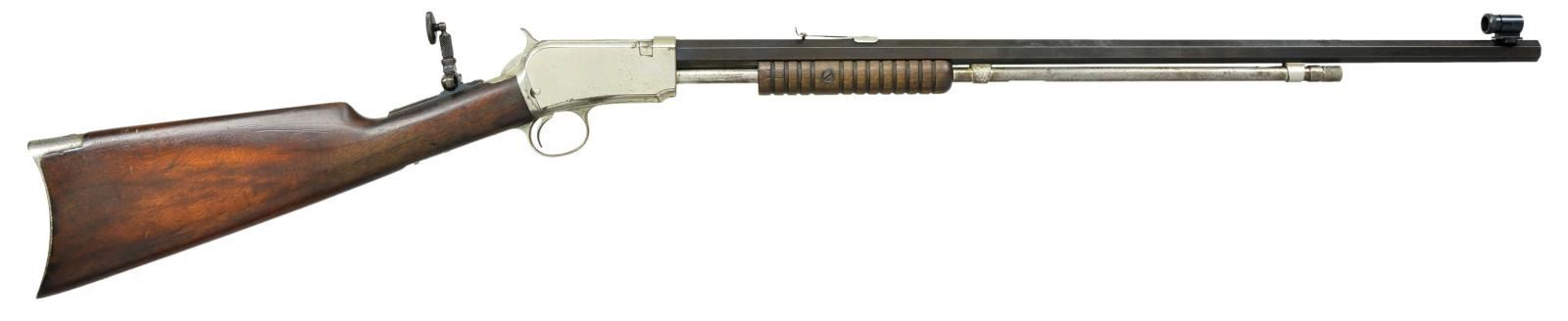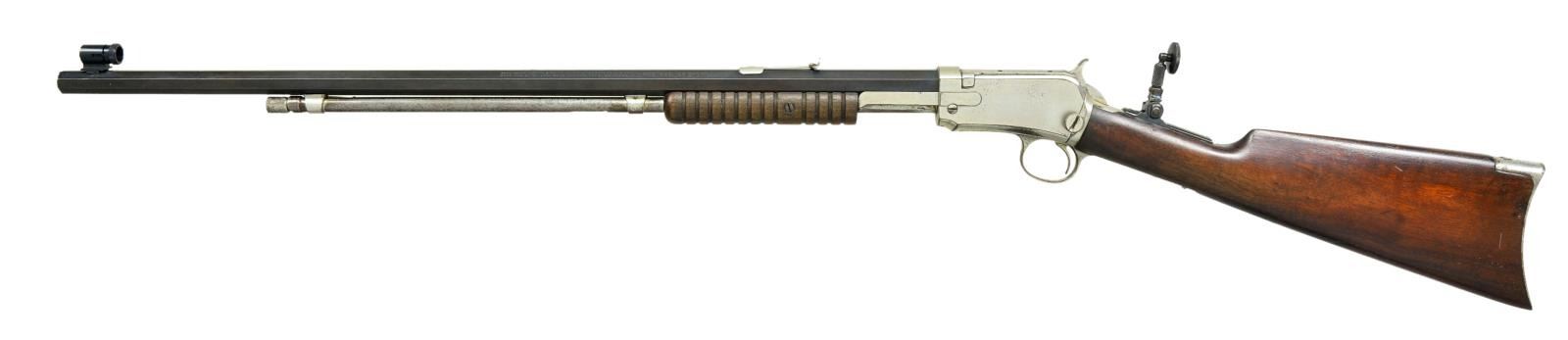 Cal. 22 Short. S# 567448A. BBL. 24" octagon. Combination tang sight, M90 sporting rear & replacement globe front sights. Rare rifle with entirely nickel finished action, mag tube, rear sight & crescent buttplate. Only the bbl. is blued. Grooved forend & straight grip walnut stock. "Winchester For Over a Century, Volume 1" page IV-7 by Bill West states "Nickel plated rifles with tang sights were used by exhibition shooters. Called "Expert" rifles". Mfg. 1916. CONDITION: