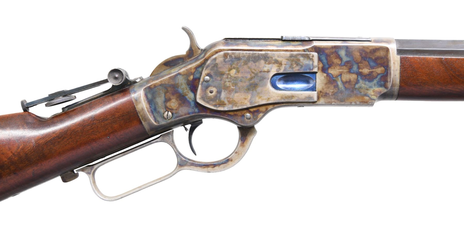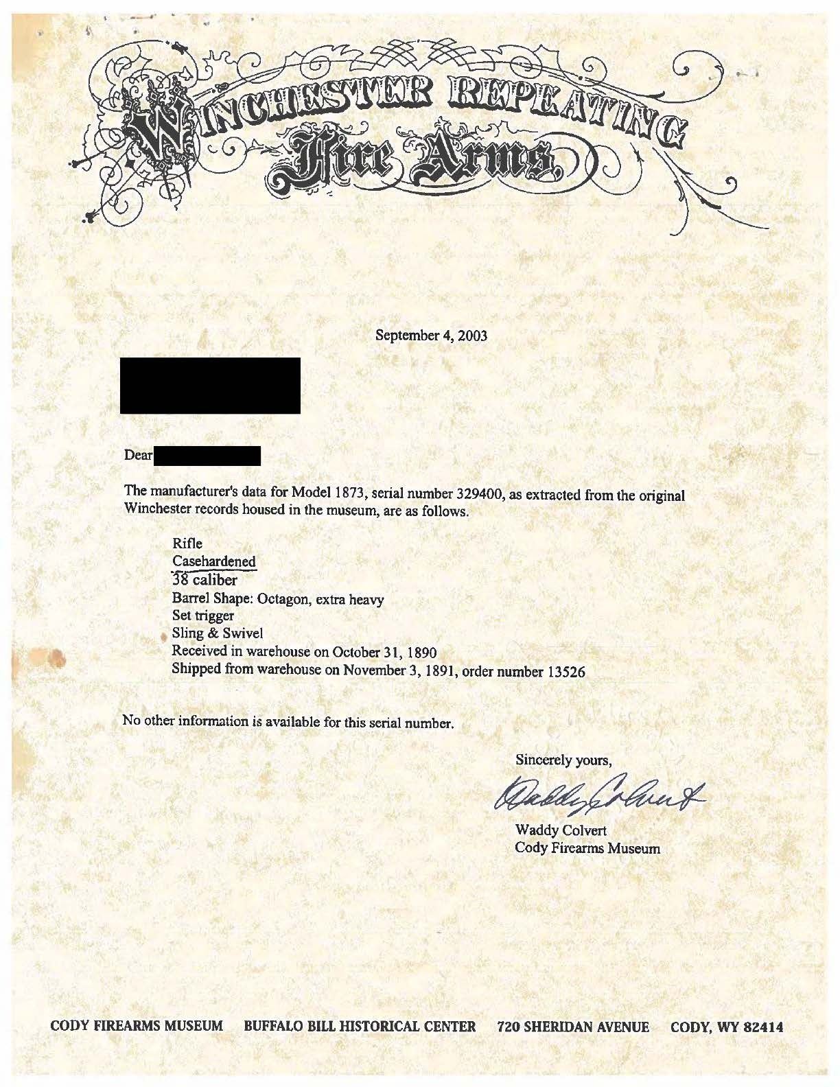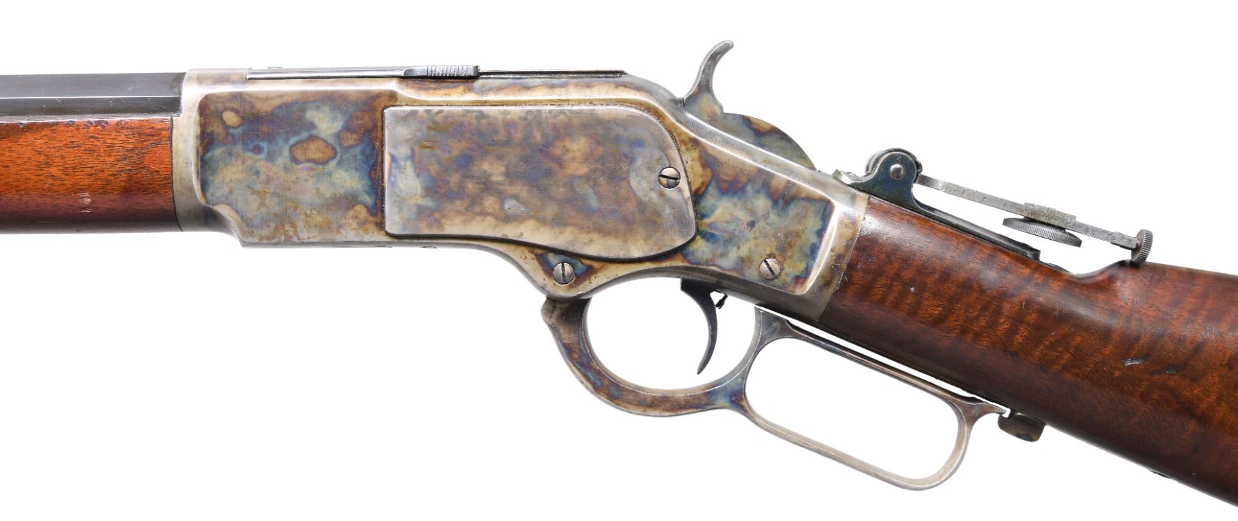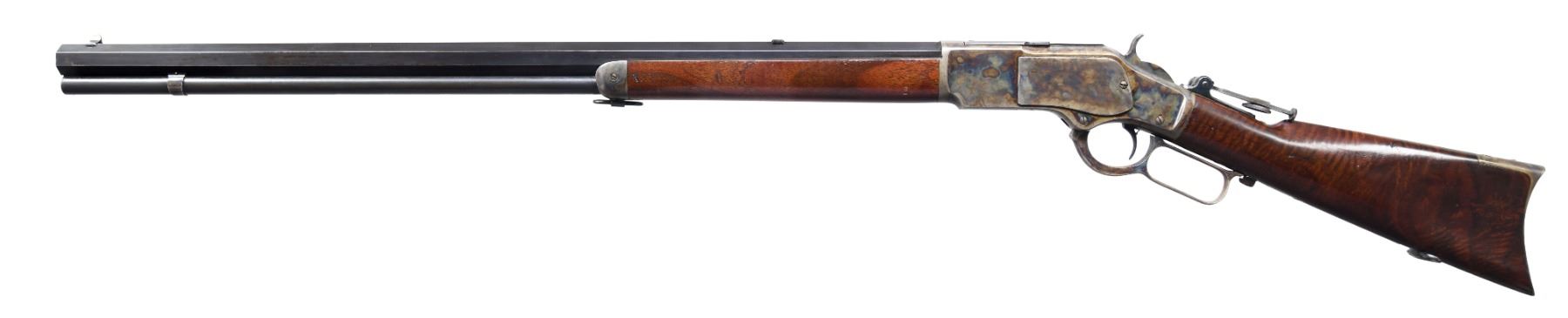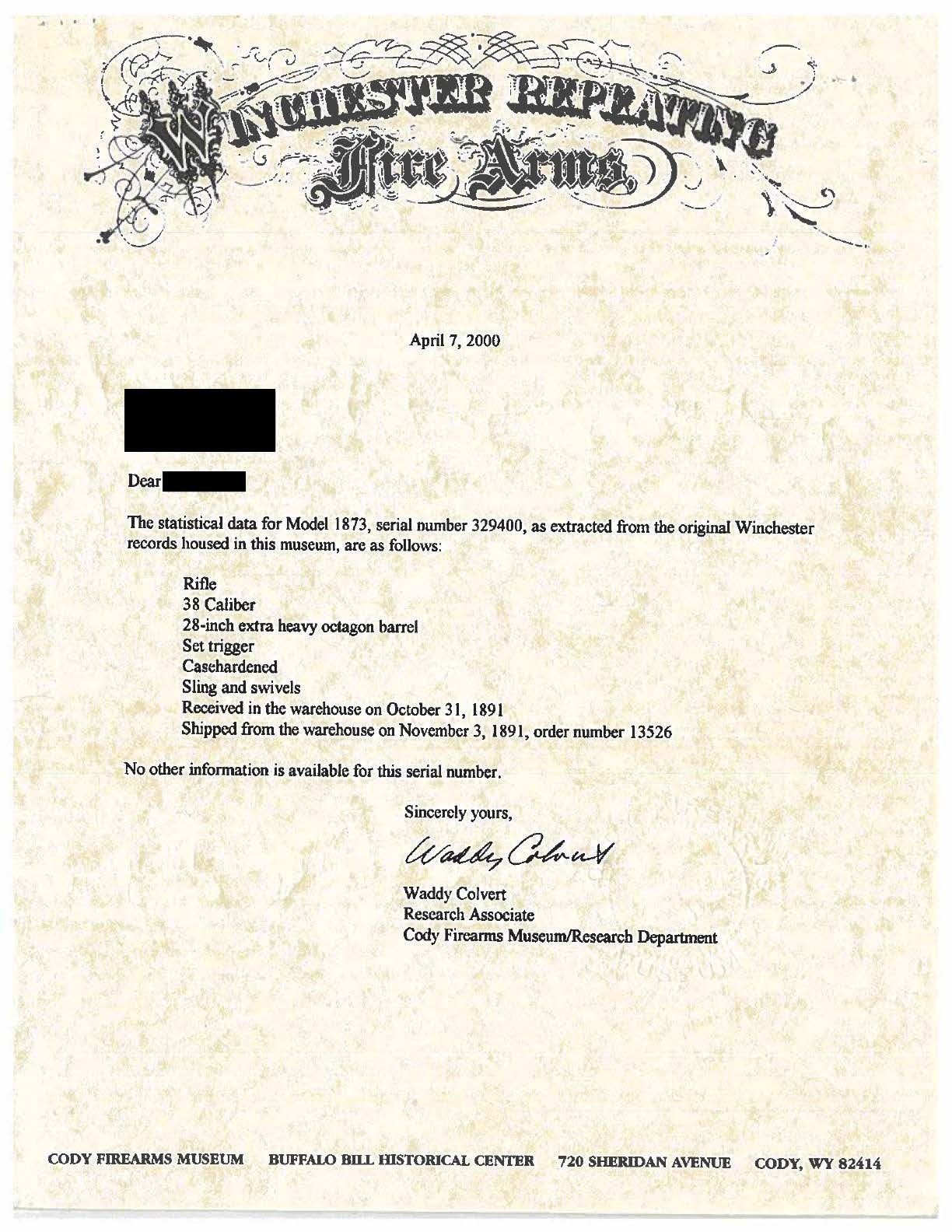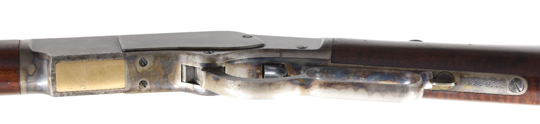 RIFLE. Cal. 38 WCF (38-40). S# 329400B. Bbl. 28" (4" longer than standard) extra heavy octagon measuring 1" across flats at muzzle. Sporting front sight, filler in rear dovetail w/ Vernier tang sight. Full length mag. Case colored action, forearm cap & crescent steel trapdoor buttplate. Set trigger. Forearm & straight grip stock w/ fancy walnut & sling swivels. Left inside of lower tang is stamped "OH", "SW", assembly number "34" & wood grade marking "X". Top tang channel of stock has matching assembly number "34". UNATTACHED ACCESSORIES: two Cody Firearms Museum letters detailing essentially the same information, "Rifle / 38 Caliber / 28-inch extra heavy octagon barrel / Set trigger / Casehardened / Sling and swivels / Received in the warehouse on October 31, 1891 / Shipped from the warehouse on November 3, 1891, order number 13526". CONDITION: fine. Bbl. & mag. tube retain 90% lightly faded blue, showing edge wear. Action has 90% case colors w/ light fading in carry areas. Original wood finish shows scattered scratches & marks. Crisp action w/ sound set trigger. Very good bright bore. (01-26402/DS). ANTIQUE. $8,000-12,000.