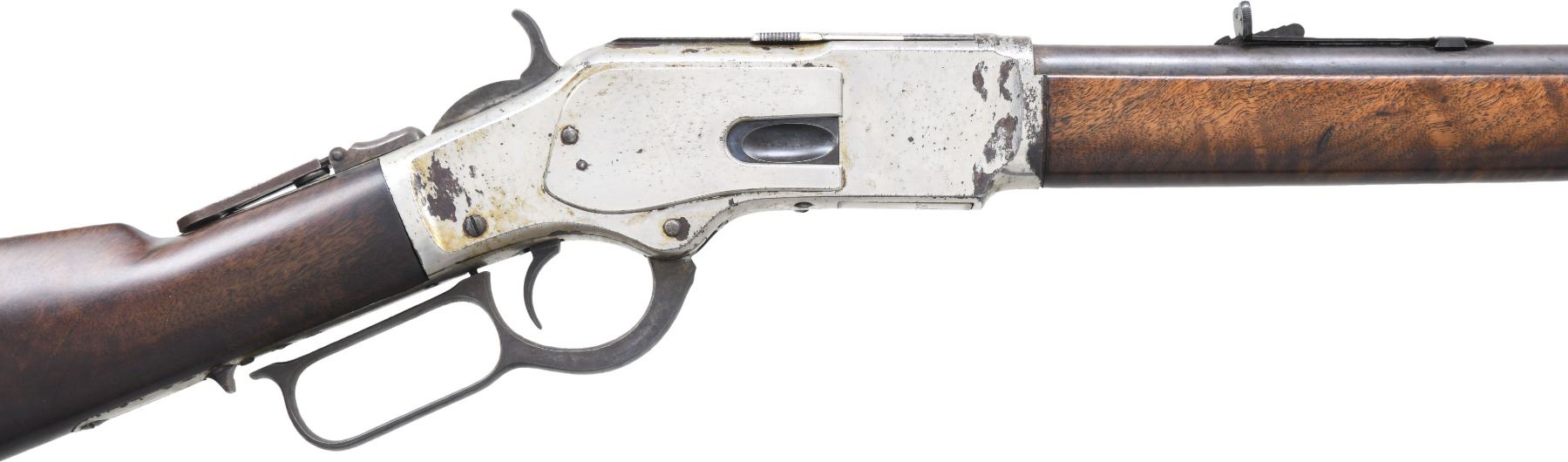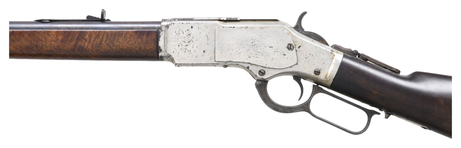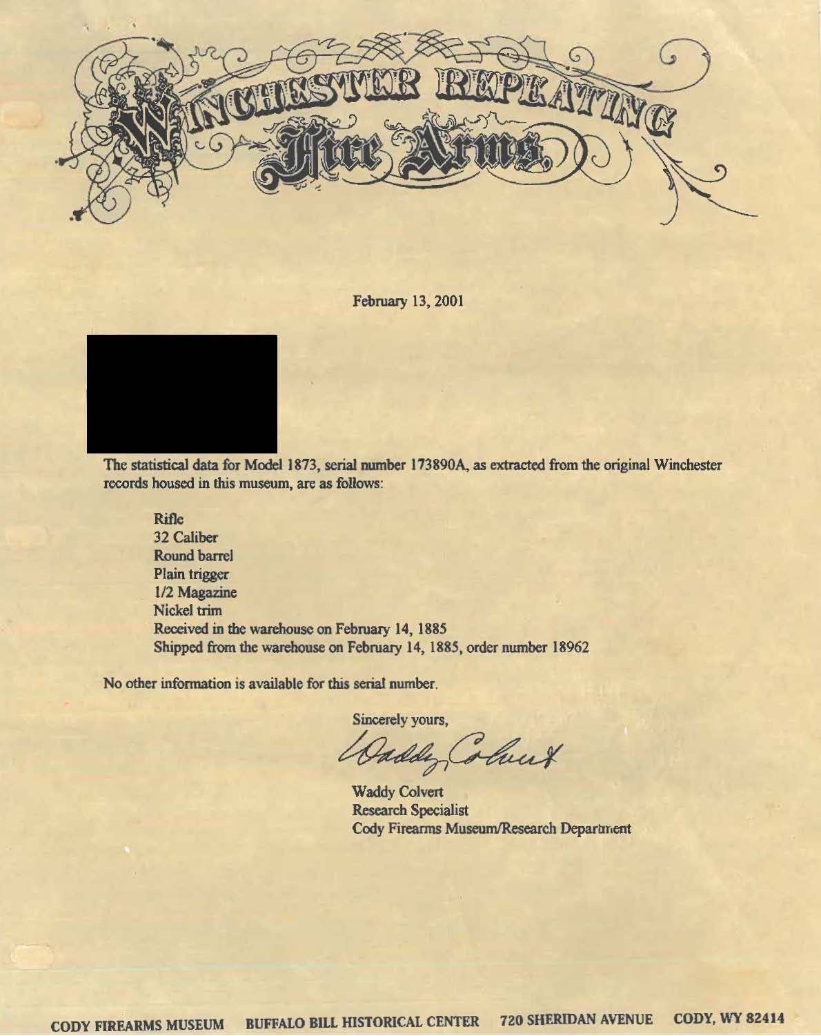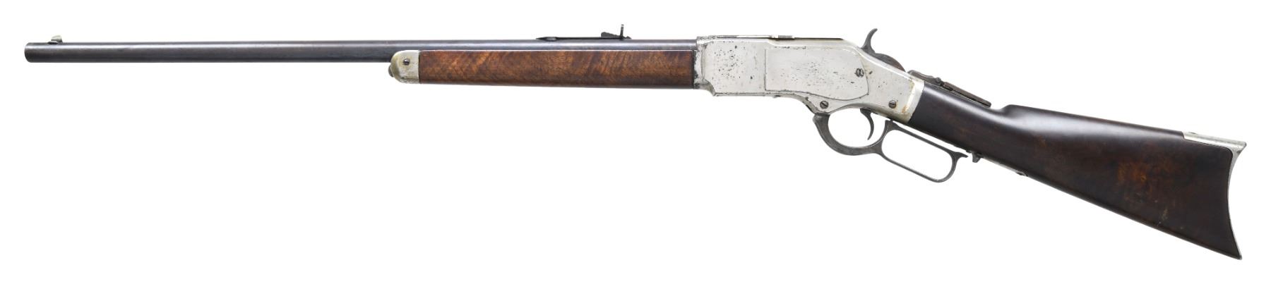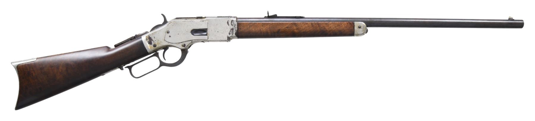 RIFLE. Cal. 32-20 (32 WCF). S# 173890A. Bbl. 24" round w/ sporting bbl. sights & w/ windage adj. folding peep sight specifically adapted for the Model 1873 rifle. Button mag. Action, forearm cap & crescent steel buttplate have nickel finish. Forearm & straight grip stock of fancy walnut. UNATTACHED ACCESSORIES: Winchester Repeating Fire Arms letter & Cody Firearms Museum Records Office show search form both detail, "Rifle / 32 Caliber / Round barrel / Plain trigger / 1/2 Magazine / Nickel trim / Received in warehouse on February 14, 1885 / Shipped from the warehouse on February 14, 1885, order number 18962". CONDITION: bbl. blue has faded to a mottled brown showing small spots of corrosion. Action & fittings retain 70% nickel finish showing spots of flaking & corrosion. Refinished wood shows dents & handling marks. Bore has a darkened appearance retaining sound rifling. (01-26439/DS). ANTIQUE. $4,000-6,000.