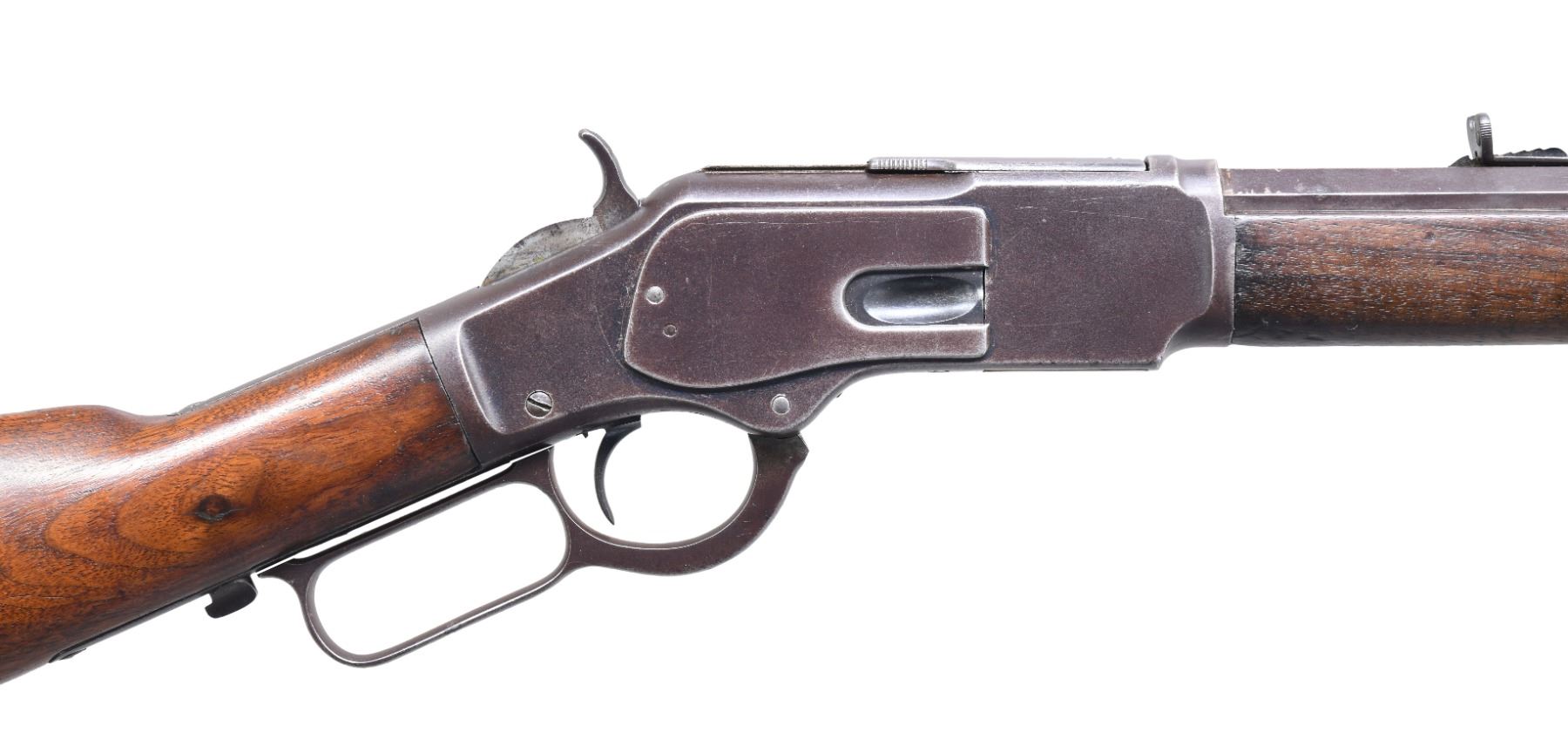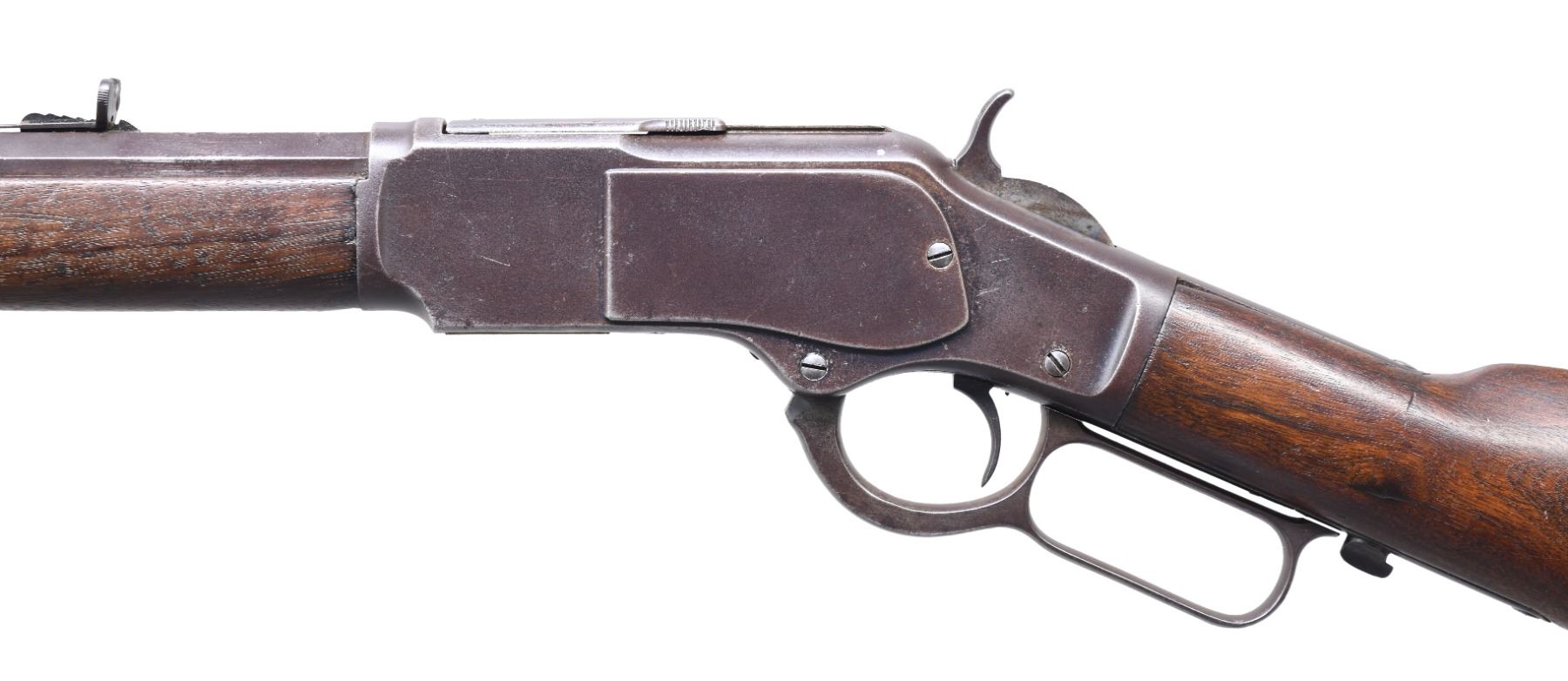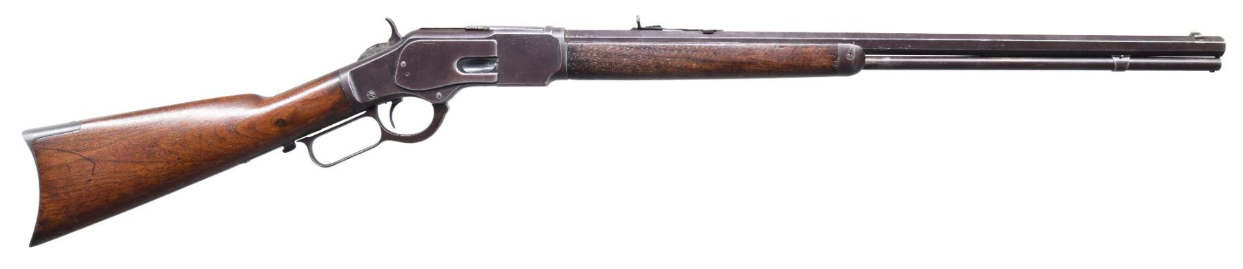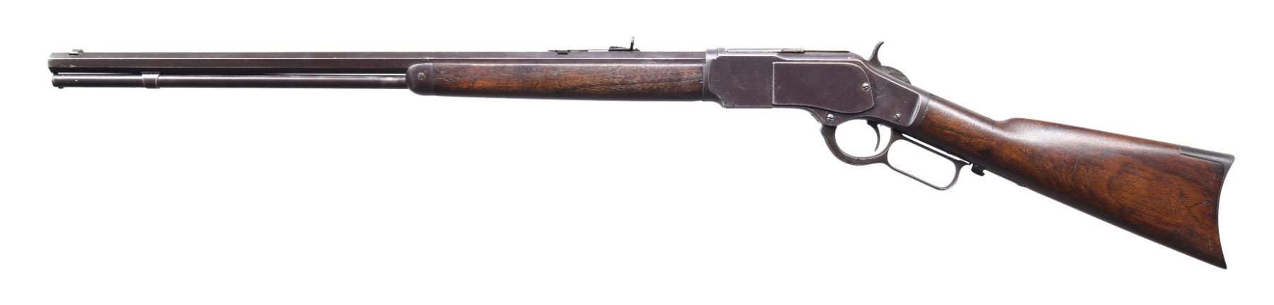 Cal. 32 WCF. S# 332810B. Bbl. 24" octagon w/ sporting sights. Full length mag. Walnut forearm & straight grip stock w/ crescent steel buttplate. Mfg. 1890. CONDITION: metal has faded to brown, showing light dents & marks. Forearm has dark worn appearance w/ dents & chips around action. Sanded & refinished stock shows scratches & marks. Good mechanics. Dark pitted bore w/ worn rifling. (01-26504/DS). ANTIQUE. $1,200-1,800.