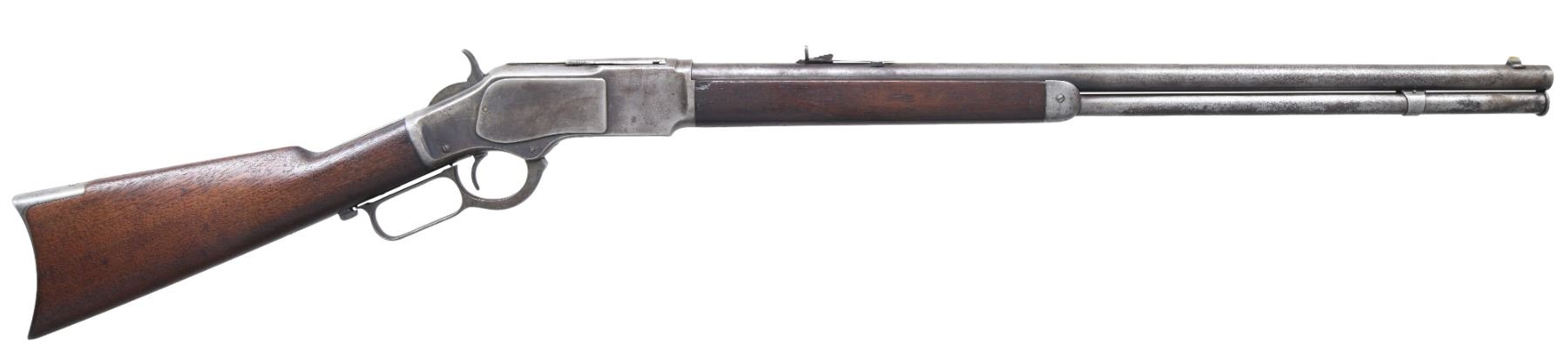 Cal. 22 Short RF. S# 372307B. Bbl. 24" round. Sporting sights. Full length tubular mag. Walnut forearm & straight grip stock w/ crescent steel buttplate. Mfg. 1891. CONDITION: metal has faded to gray w/ scattered areas of surface corrosion. Top of receiver & dust cover shows small dents. Forearm has small chip right of receiver. Inside mag. tube is intact. Dark pitted bore has little remaining rifling. (01-26505/DS). ANTIQUE. $1,800-2,500.
