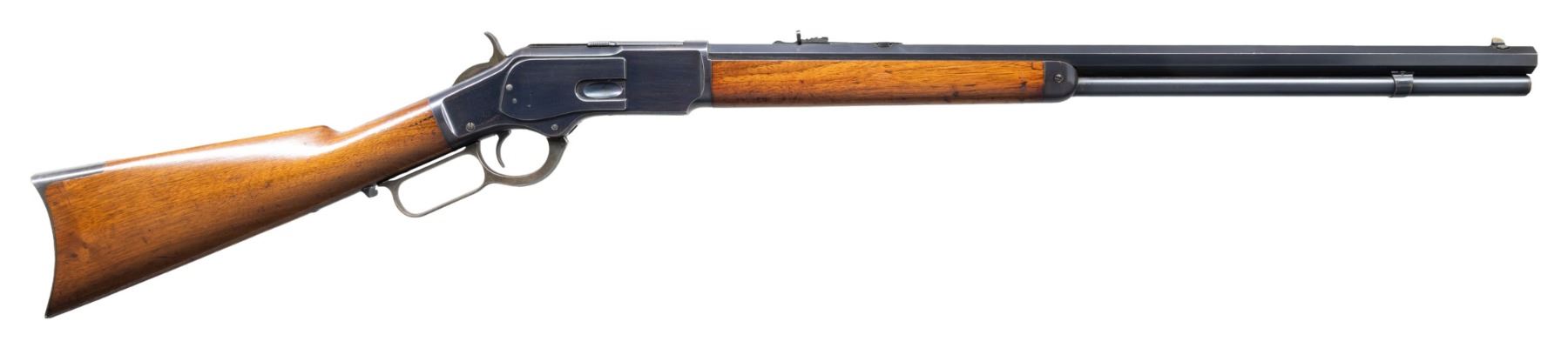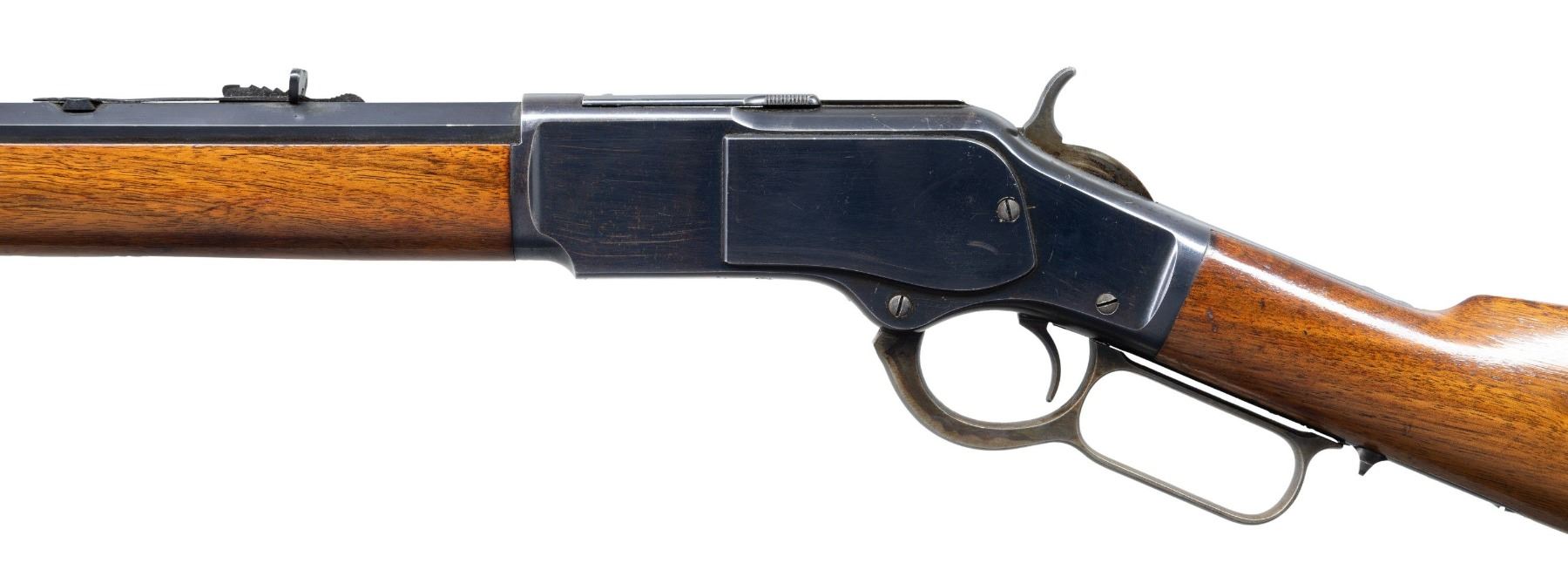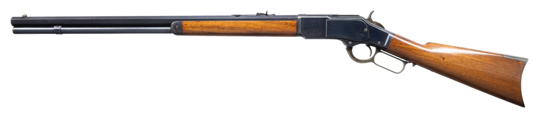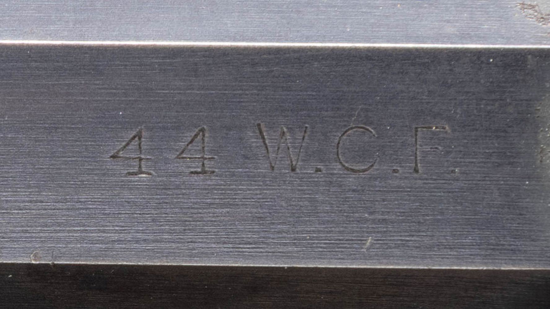 Cal. 44 WCF. S#. 272238B. Bbl. 24" octagon with original sporting sights. Full length tubular mag. Blue finish with case colored hammer, lever & crescent steel trapdoor buttplate. Walnut forend & straight grip walnut stock. Mfg. 1888. UNATTACHED ACCESORIES: 4 piece cleaning rod held in the stock compartment. CONDITION: fine, retaining over 90% bright original blue Action shows light carry & edge wear with scattered very light scratches. Hammer & lever retain 30% lightly visible case colors. Buttplate has faded gray appearance. Original wood finish shows scattered scratches & marks. Sound action. Very good bright bore. PROVENANCE: The Esteemed Norm Greenberg Collection. (01-27695/DS). ANTIQUE. $4,500-6,500.