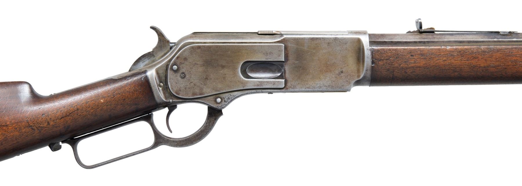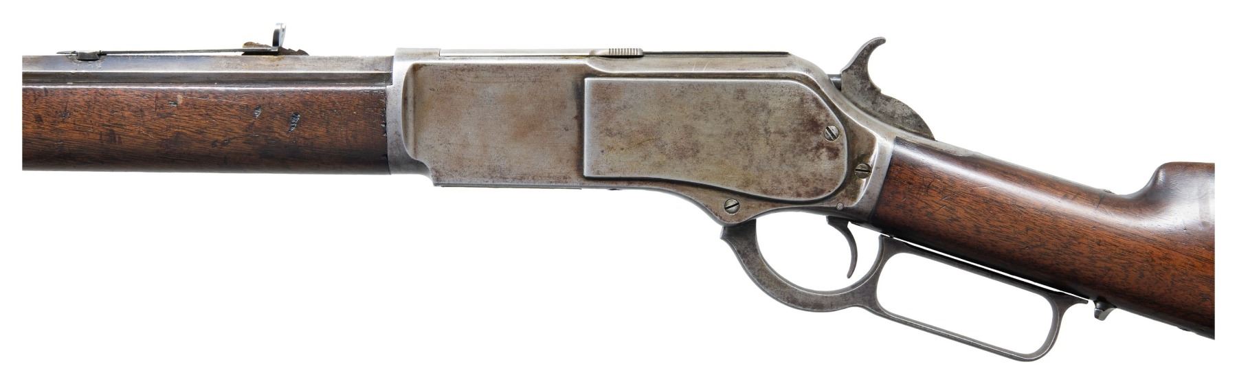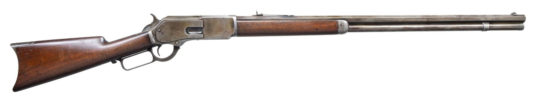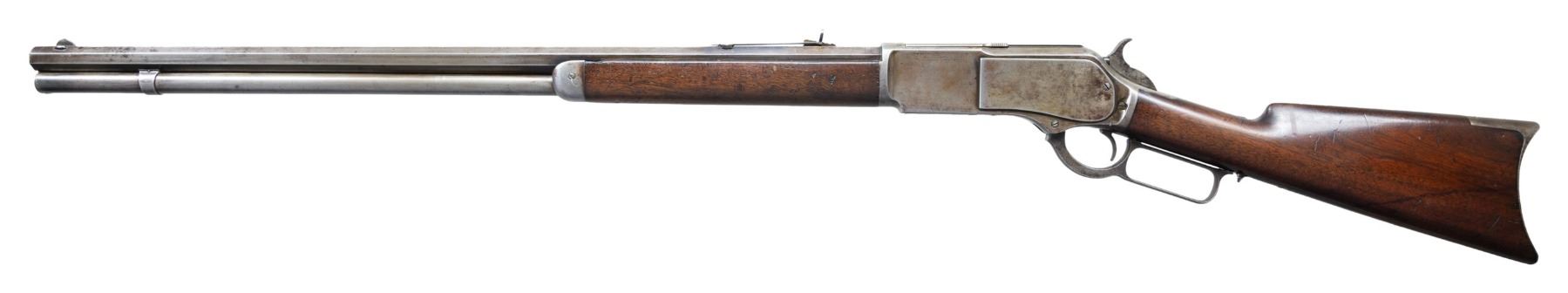 Cal. 45-60. S#. 38404. bbl. 28" octagon. Marbles No. 4 Hunting white bead front sight w/ elevator adj. sporting rear sight. Full length tubular mag. Walnut forend & straight stock w/ crescent steel trap door buttplate. Mfg. 1883. UNATTACHED ACEESORIES: the 2 center sections of a 4 piece cleaning rod held in the stock compartment. CONDITION: metal has faded gray appearance. wood has worn finish showing scratches, marks & small dents. Forend has small chips around the action. Sound mechanics. Lightly pitted bore retains intact rifling. (01-27806/DS). ANTIQUE. $2,500-4,000.