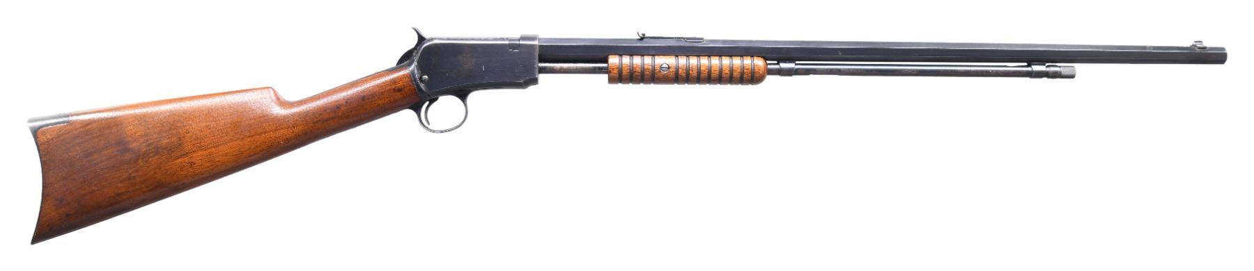 Cal. 22 Short. S# 509751. Bbl. 24" octagon w/ original sporting sights. Blue finish. Grooved slide handle & straight grip walnut stock w/ crescent steel buttplate. Mfg. 1914. CONDITION: over 80% original blue showing slide & carry wear w/ slide & handling marks showing freckling. Original wood finish shows scattered light marks. Bright bore retains strong rifling. (25-724/DS). CURIO. $2,500-3,500.