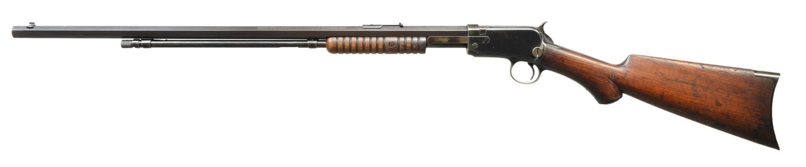 Cal. 22 LR. S# 610380A. Bbl. 24" octagon w/ model 90 sporting sights. Uncommon & desirable pistol grip walnut stock w/ small hard rubber grip cap & crescent steel buttplate. Mfg. 1919, the 22 LR chambering was added in 1918. CONDITION: 70% dull fading blue. Wood has heavily worn finish w/ dark spots, scratches marks. Stock has a hairline crack at toe. Bore has worn rifling w/ light pitting. (22-1877/DS). CURIO. $3,000-3,750.