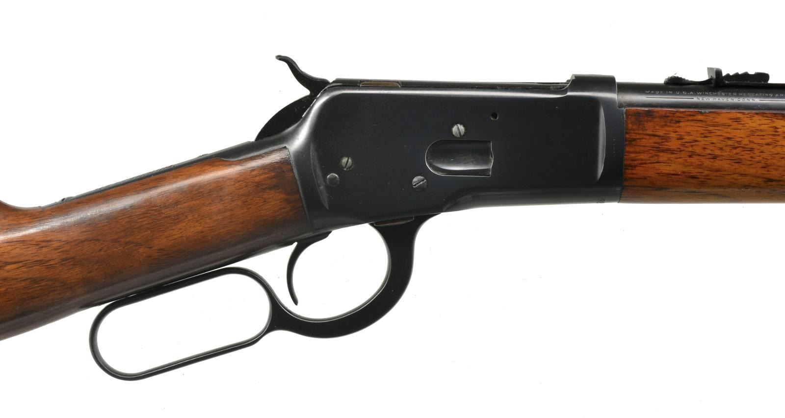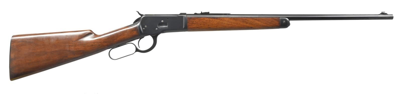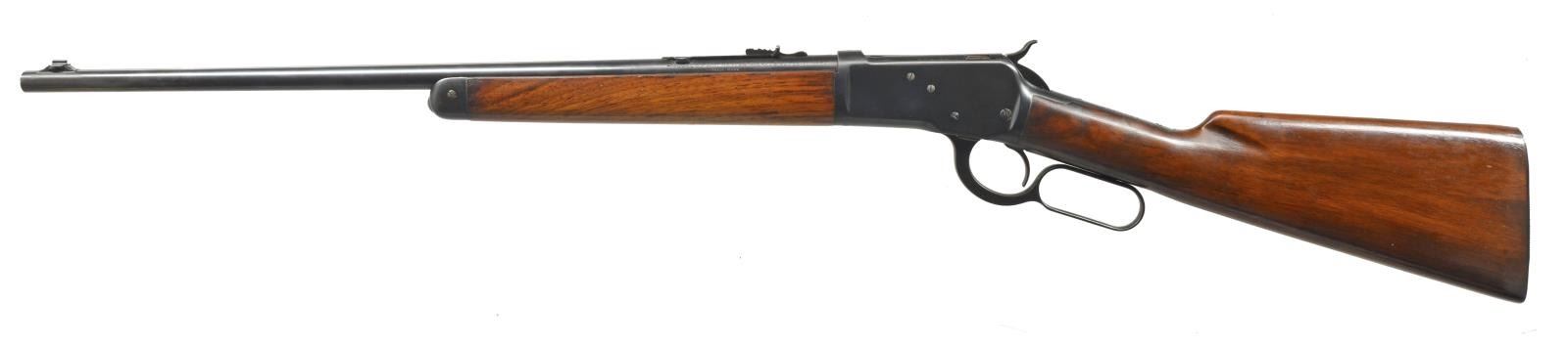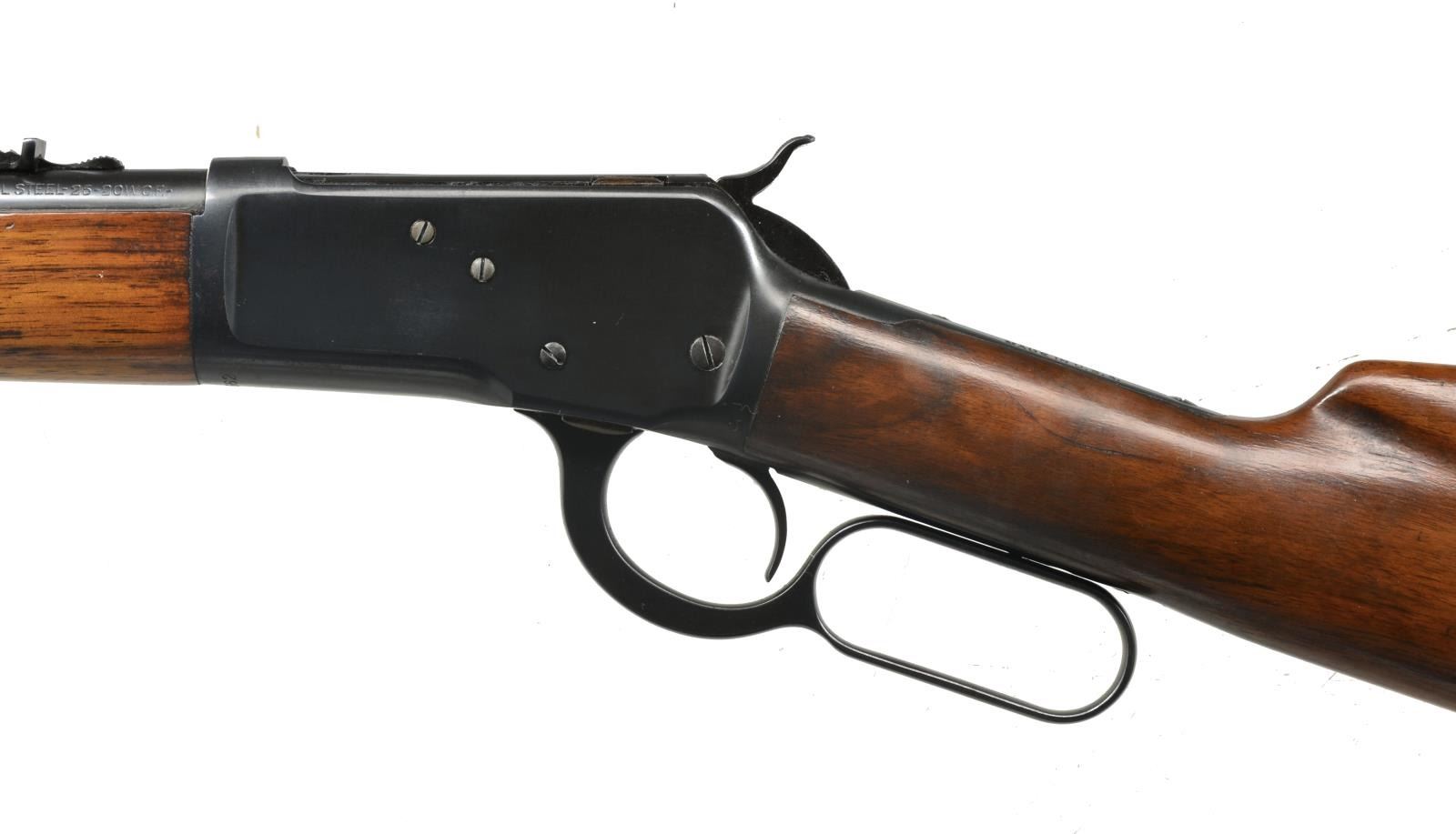 Cal. 25-20 WCF. S# 983662. Bbl. 22" rnd., short base front w/ dovetail bead sight. Dovetail adjustable rear. Button mag. Uncheckered forend. Uncheckered straight grip stock w/ serrated steel buttplate. CONDITION: bbl. retains most of its original blue w/ few spots of fine surface oxidation. Receiver retains original blue w/ a couple light handling marks. Buttstock has light coat of added finish w/ a couple minor scratches. Bore is bright. (20-3148/BT). CURIO. $500-900.