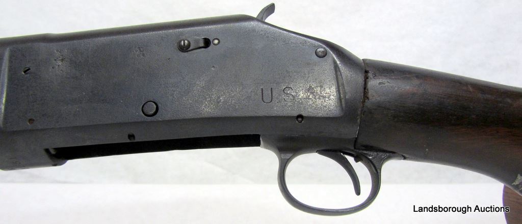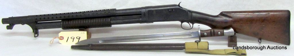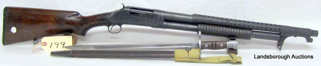 NON-RESTRICTED, PUMP ACTION, 12GA X 2 3/4", 21" BARREL WITH FIXED CYLINDER CHOKE, SN 941251. WOOD HAS NUMEROUS DENTS AND SOME GOUGES, CRACK AT BUTT, BLUING HAS LARGE PIT MARK ON LEFT SIDE RECEIVER, BORE HAS SOME PITTING. COMES WITH BAYONET AND LEATHER SCABBARD. STAMPED US ON LEFT RECEIVER AND BAYONET.