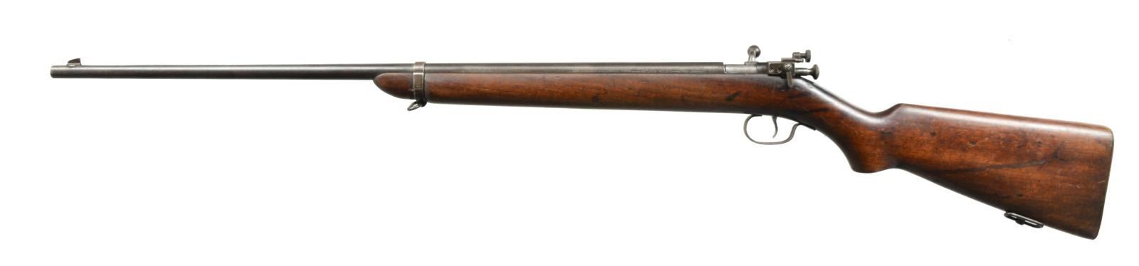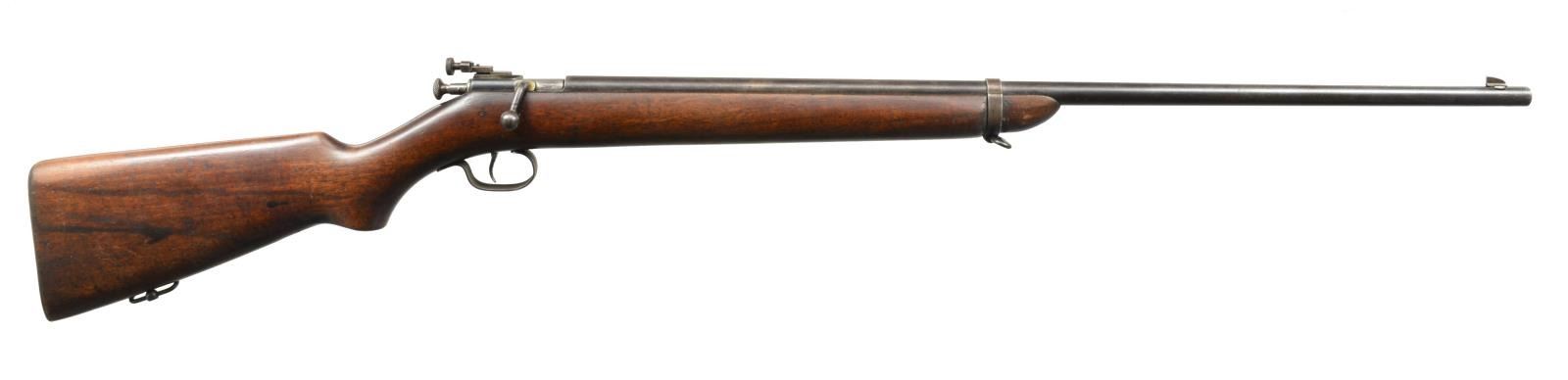 Cal. 22 LR. NSN. Bbl. 27" rnd. w/ original Win. 93A front sight & Lyman No. 55W receiver sight. Single shot manually cocked action w/ cocking window in bolt body. Band fastened pistol grip walnut stock w/ sling swivels & checkered steel buttplate. Scarce rifle, approx. 6,118 mfg. 1932-1939. CONDITION: bbl. finish is fading to mottled gray brown patina. Stock has dark worn appearance showing scratches & marks. Good mechanics. Bore is bright w/ sound rifling. (20-1985/DS). CURIO. $300-500.