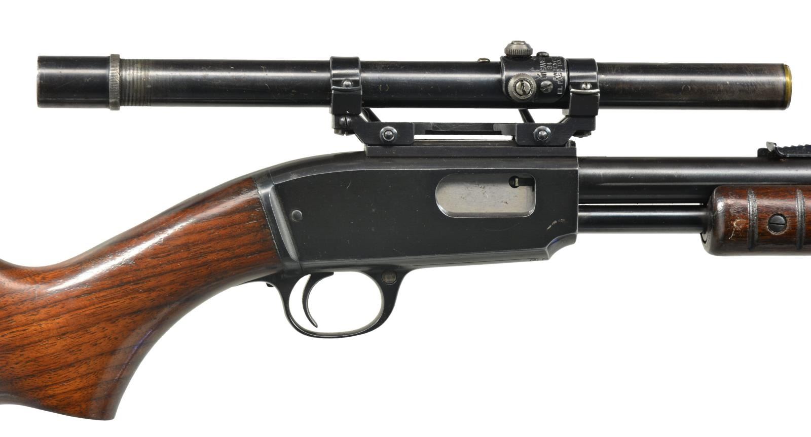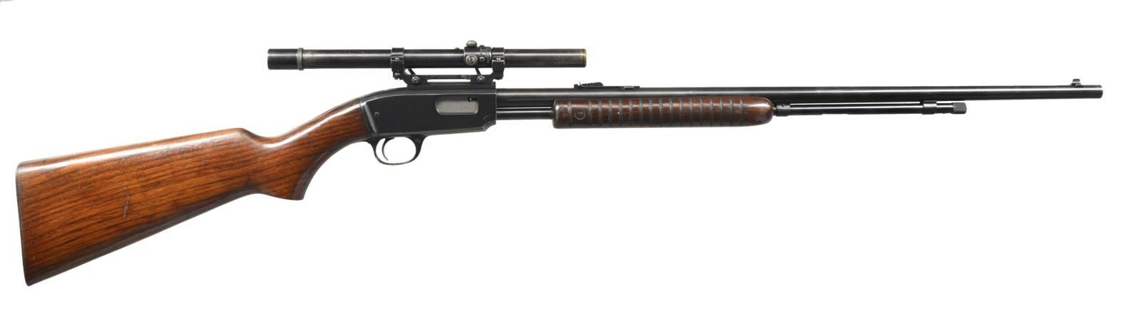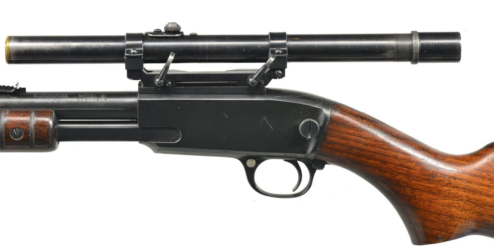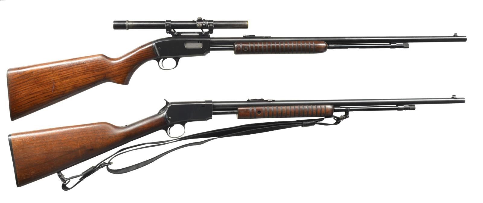 ALL: cal. 22 S, L, LR. Tubular mags. 1) MODEL 61. S# 200008. Bbl. 24" rnd. w/ sporting sights. Weaver G4 3/4" tube scope w/ crosshair reticle on a QD top mt. Flat bottom grooved forearm & pistol grip walnut stock w/ checkered steel buttplate. CONDITION: over 80% lightly faded blue showing sm. handling marks. Original stock finish shows scattered scratches & marks. Bore is bright w/ sharp rifling. Scope has clear optics. (20-3028/DS). 2) MODEL 62A. S# 359389. Bbl. 23" w/ sporting sights. Flat bottom grooved forearm & straight grip stock w/ plastic buttplate. Nylon sling on aftermarket QD swivels. CONDITION: over 80% lightly worn blue. Stock shows scattered scratches, marks & spots of finish loss. Bore is bright w/ sharp rifling. (20-3050/DS). ALL CURIO. $750-1,100.