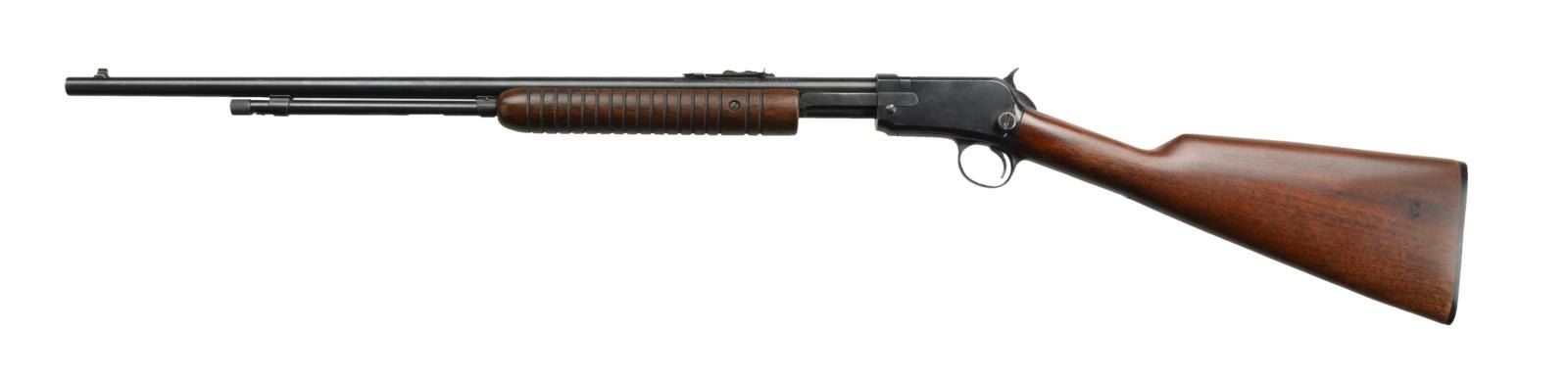 Cal. 22 S, L, LR. S# 228651 (1948). Bbl. 23" w/ sporting sights. Tubular mag. Walnut grooved forearm & straight grip stock w/ plastic buttplate. CONDITION: very good bbl. blue w/ 2 lg. areas of blue loss to silver w/ cycling wear, marks, & light fading. Very good forearm finish. Lightly sanded & refinished stock w/ wood erosion of both sides of stock near bottom tang corner, lg. gouge on right side of stock & handling marks. Very good bore. (22-2691/MD). CURIO. $600-900.