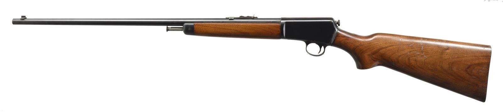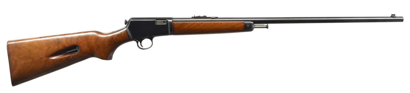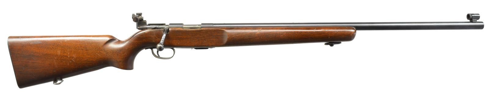 BOTH: cal. 22 LR. 1) WINCHESTER 63 AUTOLOADING. S# 35425A. Bbl. 23" w/ sporting sights. Tubular mag. that loads through stock. Walnut forearm & pistol grip stock. CONDITION: bbl. & action retain over 98% blue showing scattered spots of corrosion & handling marks. Original wood finish shows scratches, dents & marks. Toe of stock is chipped w/ added wood repair. Sound mechanics. Bore is bright w/ sound rifling. (20-1494/DS). 2) REMINGTON MODEL 513-T MATCHMASTER BOLT ACTION TARGET. S# 72566. Bbl. 27" of target weight. Redfield receiver sight w/ Redfield globe front sight. Walnut target stock w/ sling swivels & checkered steel buttplate. MAGS: 1-5 rd. detachable. CONDITION: bbl. & action retain 75% lightly faded blue. Stock has lightly worn finish showing scratches & handling marks. Sound mechanics. Bore is generally bright w/ lightly worn rifling. (20-1497/DS). BOTH CURIO. $600-900.