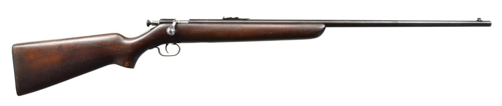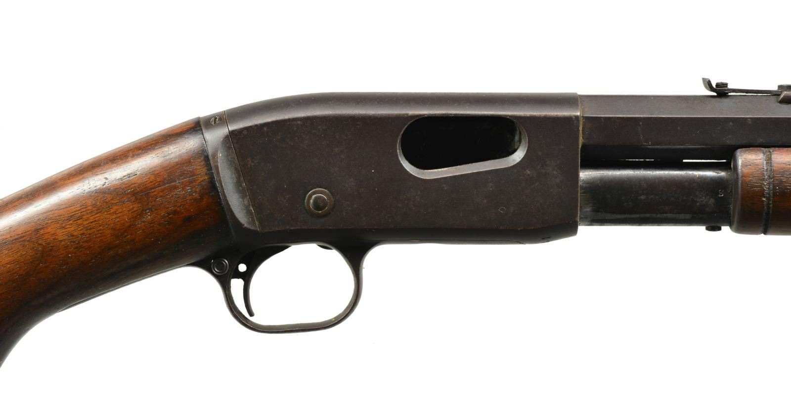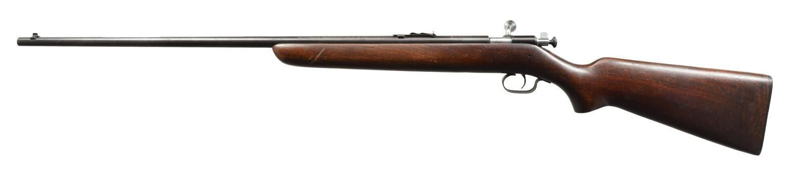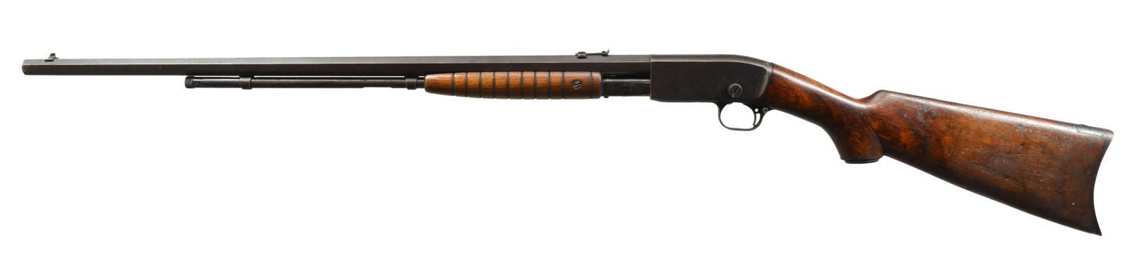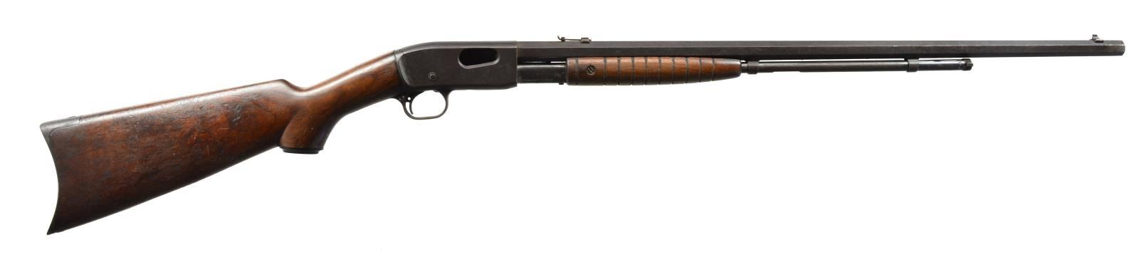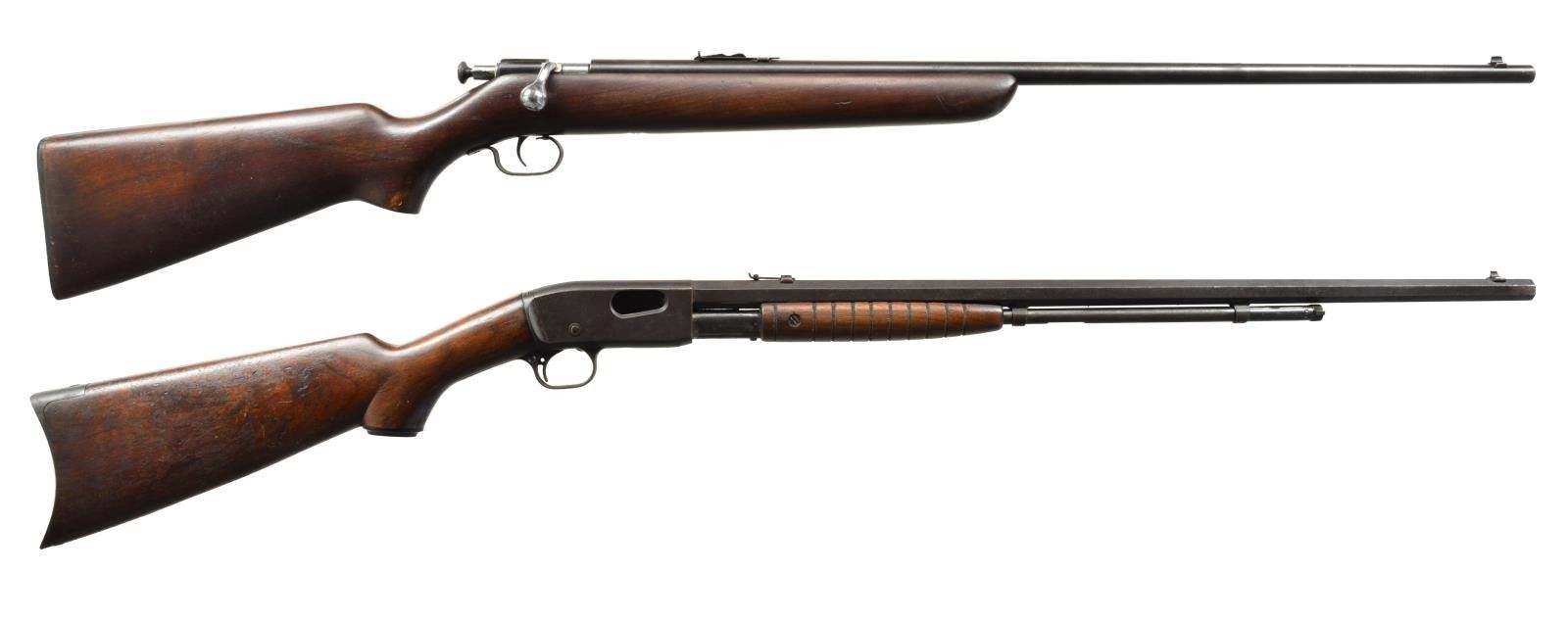 BOTH: 22 S, L, LR. 1) WINCHESTER 67 BOLT ACTION SINGLE SHOT. NSN. Bbl. 27" w/ sporting sights. Chrome plated bolt body. Walnut pistol grip stock has original buttplate. CONDITION: 70% thinning blue showing spots of corrosion. Stock has lightly worn finish showing scratches & marks. Sound mechanics. Bore is bright w/ sound rifling. (20-1780/DS). 2) REMINGTON 12C PUMP. S# 272092. Bbl. 24" oct. w/ sporting sights. Grooved walnut forearm & hard rubber capped pistol grip stock w/ crescent steel buttplate. CONDITION: incomplete rifle missing breech block. metal finish has faded to brown patina w/ scattered spots of pitting. Wood shows wear & handling marks. Forearm has full length crack down the center. Dark pitted bore. (20-1781/DS). BOTH CURIO. $300-400.