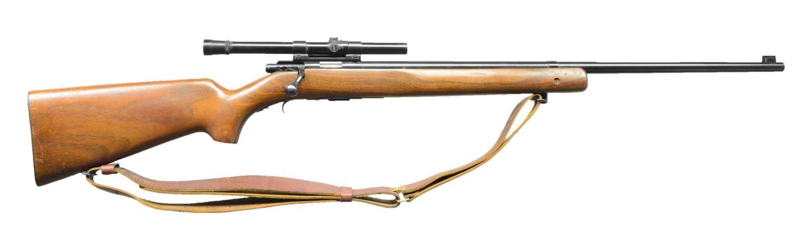 Cal. 22 LR. S#88070. Bbl. 28" tapered target weight w/ front sight base. Weaver B4 scope scope w/ tip off mts on grooved receiver. Walnut target stock has checkered steel butt plate & military style sling on original swivels. MAGS: 1 detachable 5 rd. CONDITION: Over 95% blue. Stock shows numerous scratches & marks. Very good bright bore. Scope has clear optics. (21-4106/DS). CURIO. $400-600.