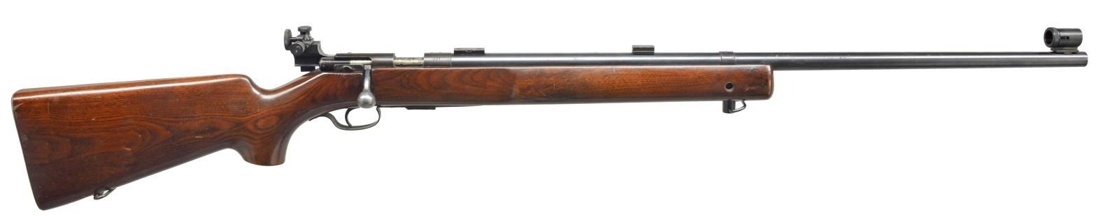 Cal. 22 LR. S# 337. Bbl. 28" rnd. w/ globe front sight, 2 target scope blocks & a Lyman adj. peep site. Left side receiver has 4 holes for side mounted scope, 2 w/ screws, w/ 2 vacant. Standard uncheckered target stock w/ sling swivels & checkered steel buttplate. MAGS: 1 Winchester marked 5 rd. CONDITION: bbl. has good original blue w/ minor muzzle wear, a few sm. spots of light surface oxidation. Receiver has good original blue w/ minor wear at sharp edges & sm. spot of minor oxidation. Trigger guard has original blue w/ wear on sharp edges. Stock has original finish w/ some light nicks & scratches. Bore is good w/ a few minor pits. (20-3182/BT). MODERN. $300-500.