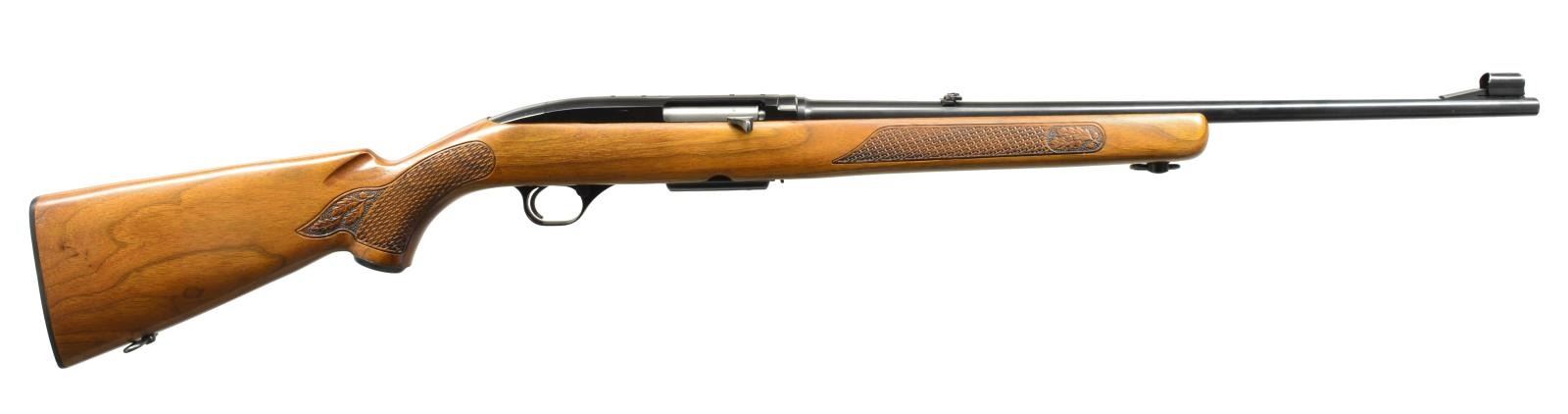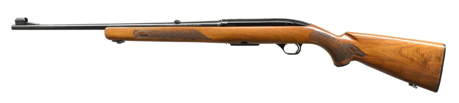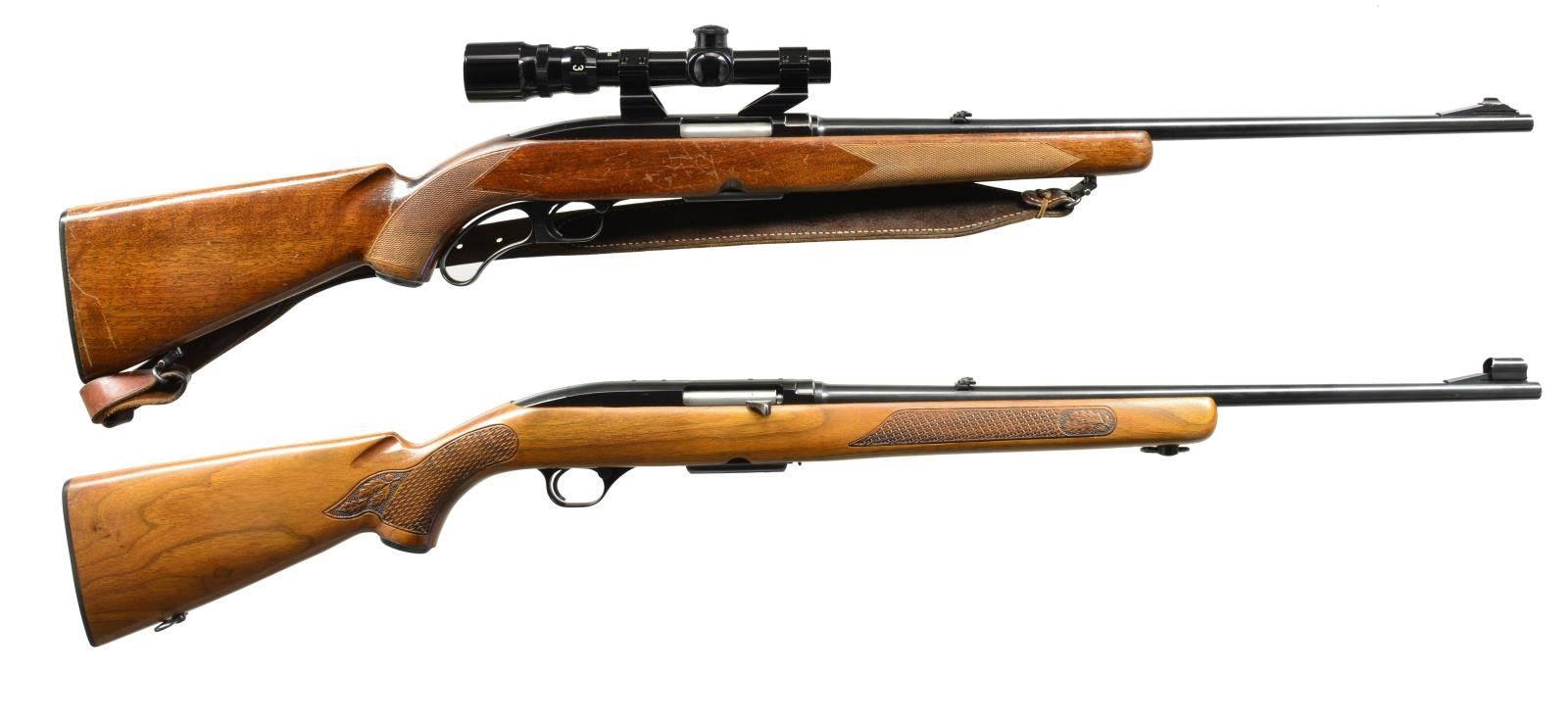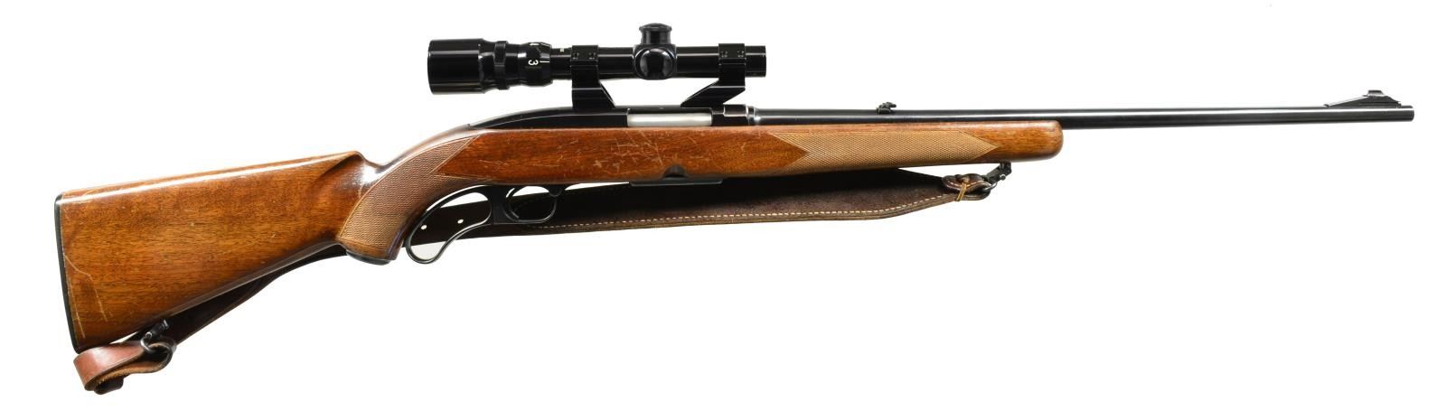 BOTH: cal. 308 Win. 1) PRE 64 MODEL 88 LEVER ACTION. S# 96391. Bbl. 22" w/ ramp mounted bead front sight & folding leaf rear sight. Bushnell Banner 1.75-4.5x20 gloss finished scope w/ duplex reticle on see through mts. Blued finish. Pre 64 mfg. w/ walnut sporter stock having hand cut checkering, steel grip cap & original plastic buttplate. Beavertail leather sling on QD swivels. 1960 Mfg. MAGS: 1 detachable 4 rd. CONDITION: 90% blue showing light edge wear. Original stock finish shows areas of peeling w/ numerous scratches & sm. handling marks. Good mechanics. Bore is bright w/ strong rifling. Scope has good optics. (20-2314/DS). 2) MODEL 100 SEMI AUTO. S# 150480. Bbl. 22" w/ hooded ramp bead front sight & folding leaf rear sight. 1967 Post 64 mfg. Walnut sporter stock w/ pressed checkering, red "W" steel grip cap, sling swivels & original plastic buttplate. MAGS: 1 detachable 4 rd. CONDITION: over 95% blue w/ spot of pitting at muzzle. Original stock finish shows a few marks & light scratches. Sound mechanics. Bright bore w/ sharp rifling. (20-2316/DS). BOTH CURIO. $950-1,300.