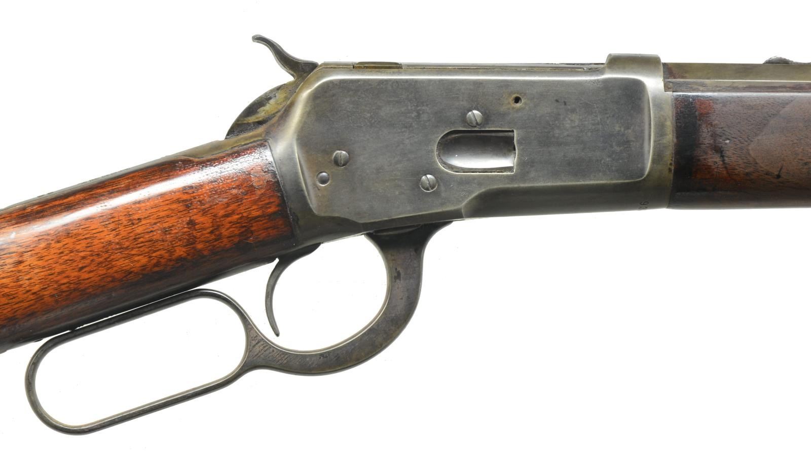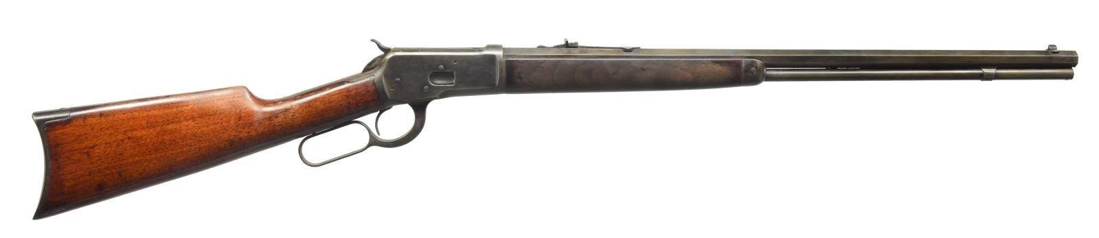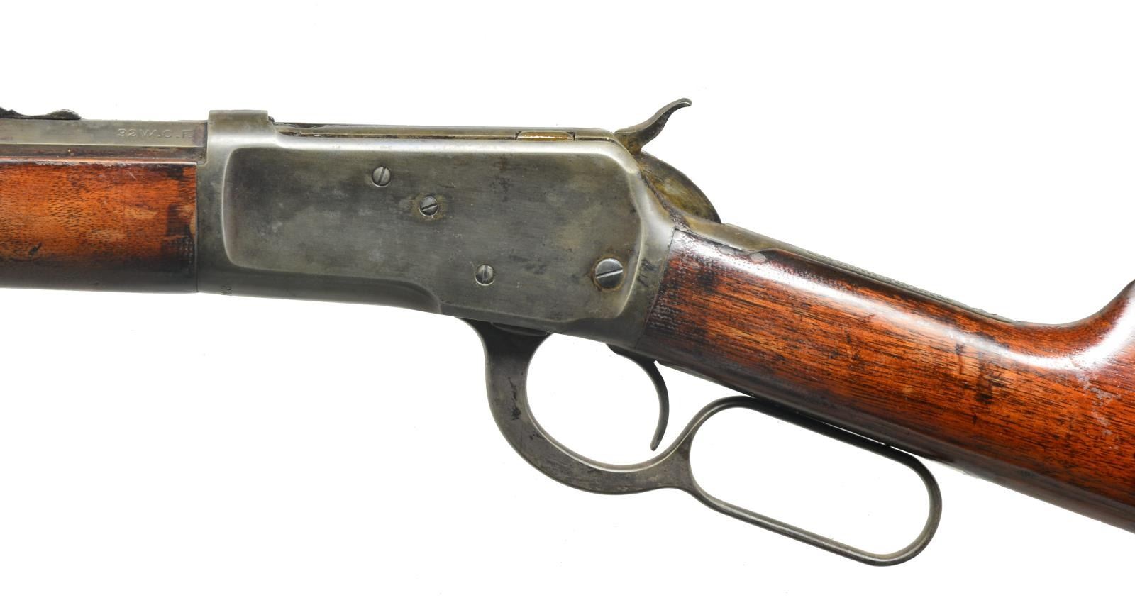 Cal. 32 WCF (32-20). S# 930048. Bbl. 24" oct. w/ sporting rear sight & flat top elevator adj. rear sight. Full length mag. Walnut forearm & straight grip sock w/ crescent steel buttplate. 1924 Mfg. CONDITION: metal has gray brown appearance from cold blue application. Wood has added finish over dents, scratches & marks. Bore retains sound rifling showing sm. spots of very light pitting. (20-3594/DS). CURIO. $700-1,000.