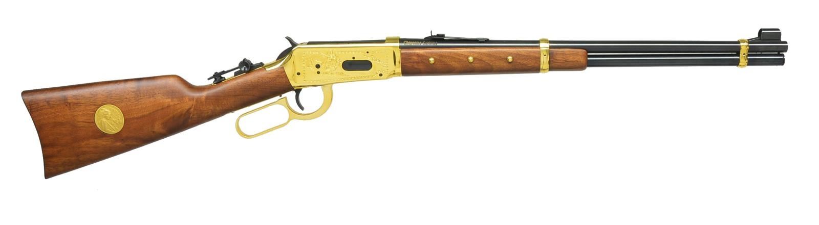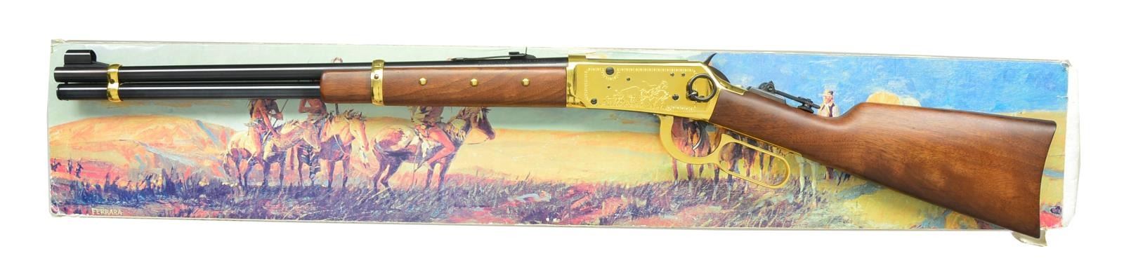 CARBINE. Cal. 44-40. S# CH04502. Bbl. 20". Action & bbl. bands are gold finished featuring saddle ring on left side & a vernier peep sight on top tang. Left side features Indian & buffalo scene. Right side features Cheyenne Chief on horseback. Right side of bbl. has gold letters "Cheyenne Carbine". Walnut forearm has brass tack ornamentation. Right side of walnut stock has gold finished Cheyenne medallion. Limited Edition of 3,000 mfg. 1977. UNATTACHED ACCESSORIES: foam lined box w/ decorative sleeve containing service center paper. Box has hand written labels. Sleeve shows some tearing. CONDITION: near new retaining 99% wood & metal finish showing slight levering wear. Near excellent bore. (20-3959/DS). MODERN. $600-900.