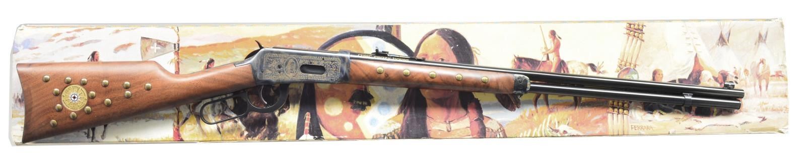 RIFLE. Cal. 38-55. S# CCH4180. Bbl. 24" tapered rnd. w/ sporting sights. Designed to pay tribute to Sioux Chief Crazy Horse, only 19,999 were issued in 1983. Case colored action w/ special engraving featuring Indian & buffalo chase scene on left side w/ portrait of Chief Crazy Horse on right. Bright blued bbl. has "CHIEF CRAZY HORSE" on right in gold filled letters. Satin finished walnut semi beavertail forearm & straight grip stock w/ crescent steel buttplate. Forearm & stock have brass tack ornamentation w/ medallion on right side marked "Chief Crazy Horse / United Sioux Tribes". UNATTACHED ACCESSORIES: foam lined box w/ decorative sleeve containing instruction manual & hang tag. Sleeve shows some tattering. CONDITION: near new in box. Near excellent bore. (20-3955/DS). CURIO. $800-1,100.