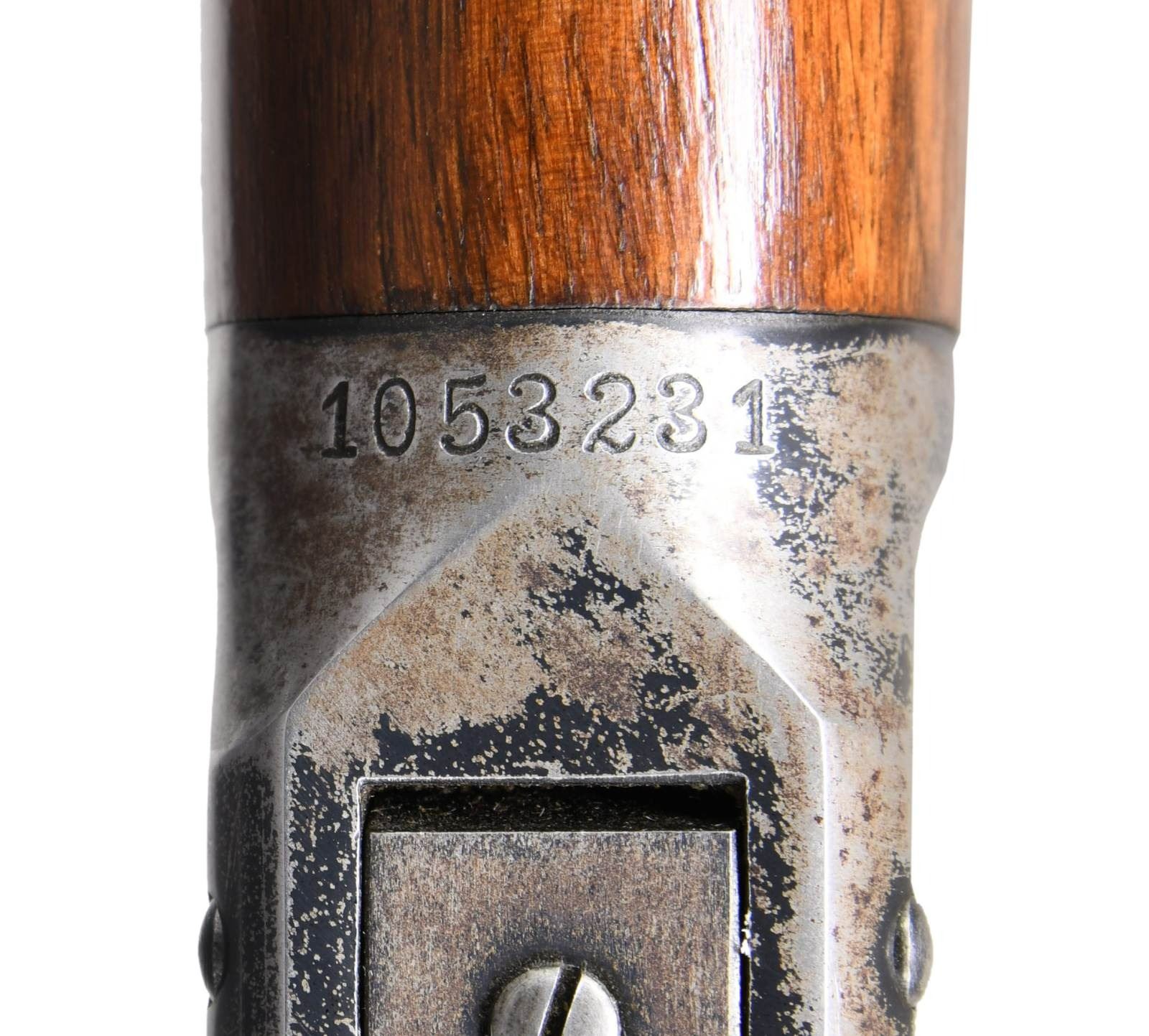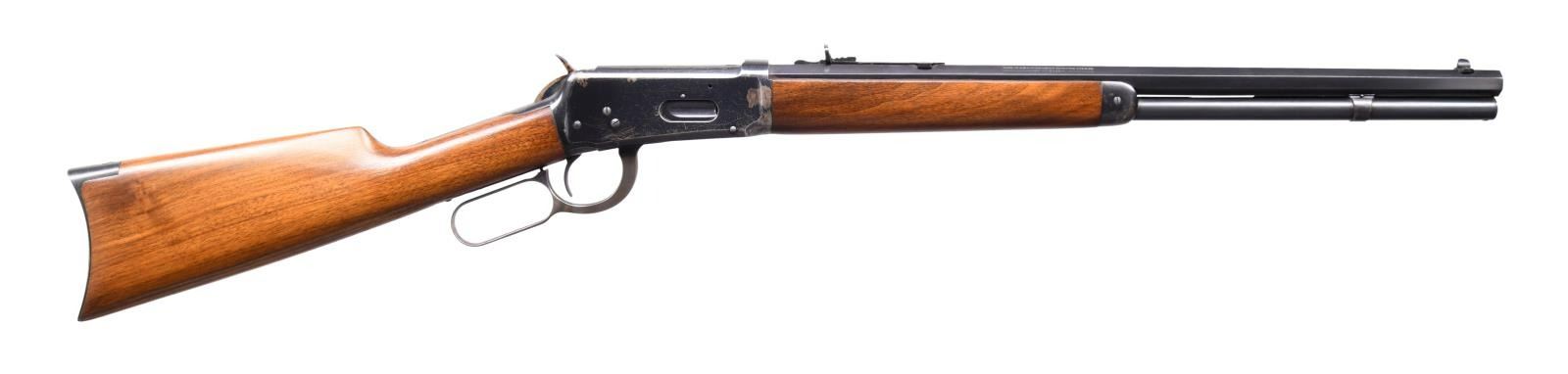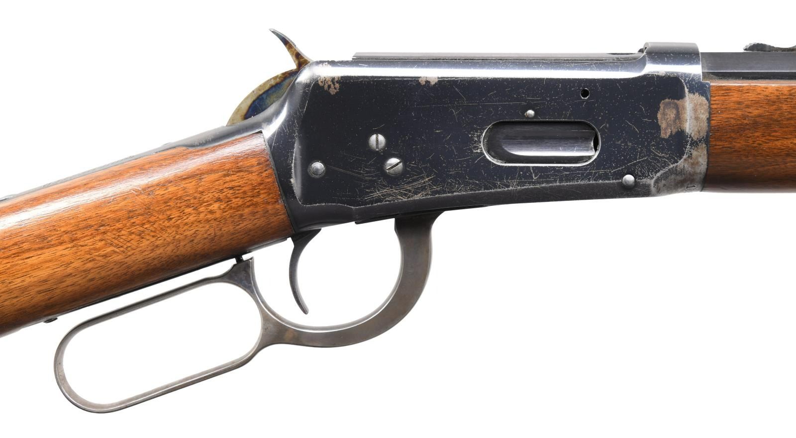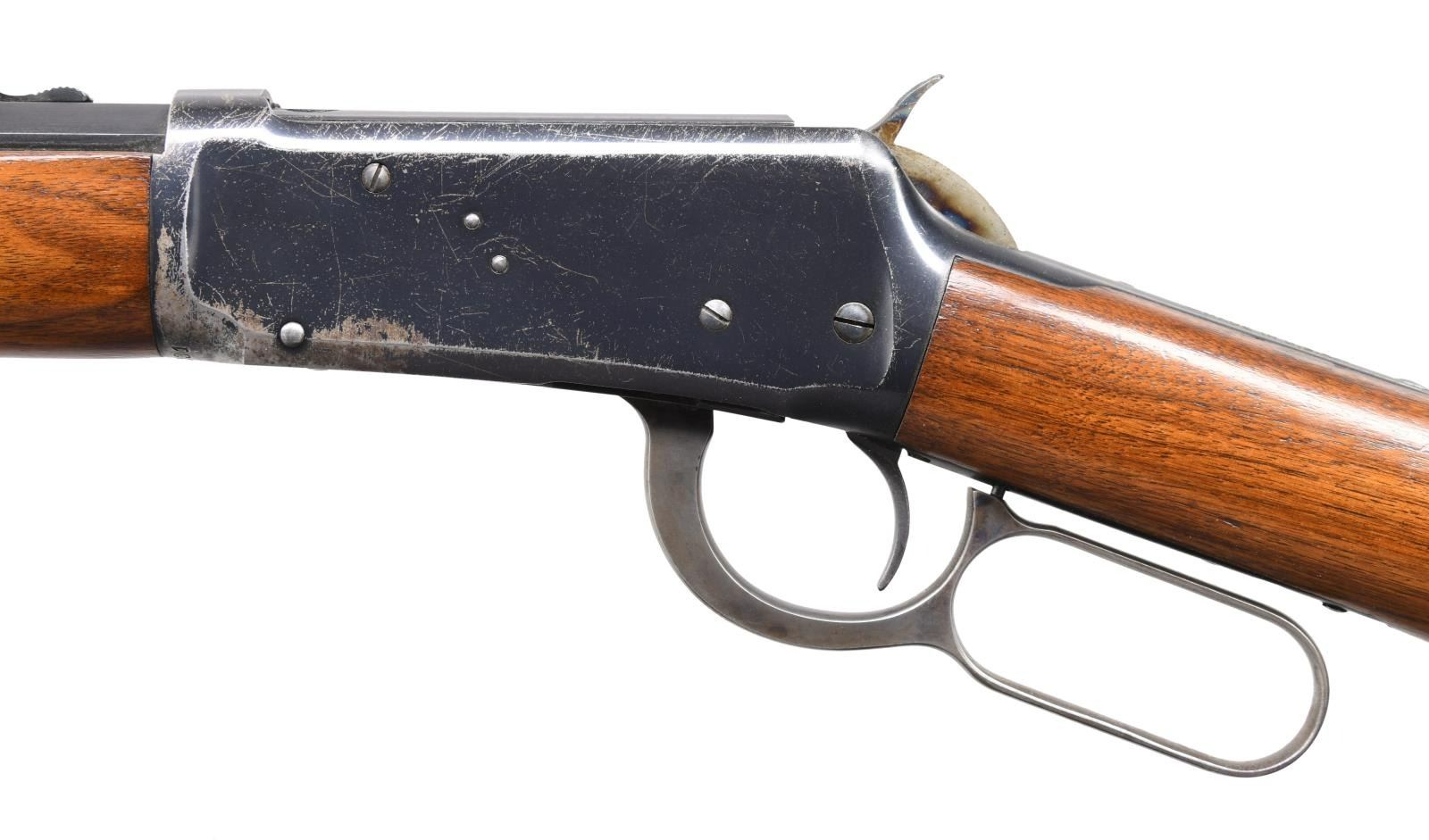 Cal. 30 WCF. S# 1053231. Bbl. 20" octagon of Nickel Steel, 6" shorter than standard. Sporting sights. Full length mag. Blue finish w/ case colored hammer. Forearm measures 8 3/8" between action & mag. cap, 1" shorter than standard 26" rifles. Straight grip walnut stock w/ crescent steel trapdoor buttplate. UNATTACHED ACCESSORIES: 4 piece cleaning rod held in stock compartment. Cody Firearms Museum Records Check listing the following information, "Serial number applied on August 27, 1929 / Configuration records not available". CONDITION: over 80% original blue showing light carry wear w/ flaking on portions of the receiver. Hammer retains 70% case colors. Lightly worn original wood finish shows scattered scratches & marks. PROVENANCE: formerly of the extraordinary Wes Adams collection. (24-1182/DS). CURIO. $3,000-5,000.