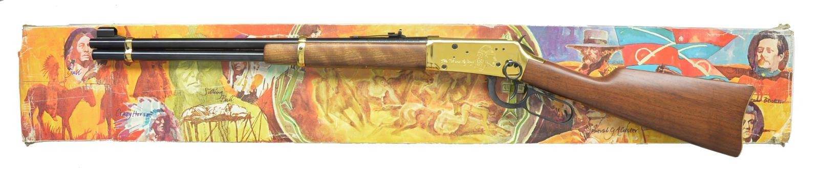 ACTION RIFLE. Cal. 44-40. S# LBH08319. Bbl. 20". Action, bbl. bands & carbine buttplate are gold finished. Ornamentation consists of Crazy Horse portrait on left side w/ marking "The 7th And The Sioux". Right side shows a cavalry flag & bugle w/ dates "June 25-26, 1876". Top tang marked "CAL. 44 W.C.F." Right side of bbl. marked in gold "LITTLE BIG HORN CENTENNIAL". Satin finished walnut carbine stocks. Right side has 7th Cavalry brand consisting of "7" over crossed swords followed by a gold centennial medallion. Limited Edition of 11,000 mfg. in 1976 for Canadian sales in conjunction w/ the Sioux Carbine. Bottom of receiver import marked "GUNS BE / LINCOLNSHIRE, IL". UNATTACHED ACCESSORIES: original foam lined box w/ decorative sheath having 7th Cavalry & Indian scenes. Box contains instruction manual, service center paper & hang tag. Sleeve is tattered w/ torn ends. CONDITION: retains over 99% wood & metal finish showing slight levering wear w/ sm. marks on left side of action. Near excellent bore. (20-3956/DS). CURIO. $600-900.