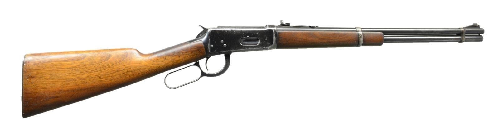Cal. 32 Win Special. S# 1308706. Bbl. 20". Ramp mtd. bead front & elevator adj. rear sight. Full length mag. Long wood walnt forearm & straight grip stock w/ grooved steel butt plate. CONDITION: 70% fading bbl & mag blue. Action has 40% blue fading to gray & showing light corrosion. Sanded & refinished wood shows wear w/ scratches & marks. Very good bore. (21-4082/DS). CURIO. S400-600.