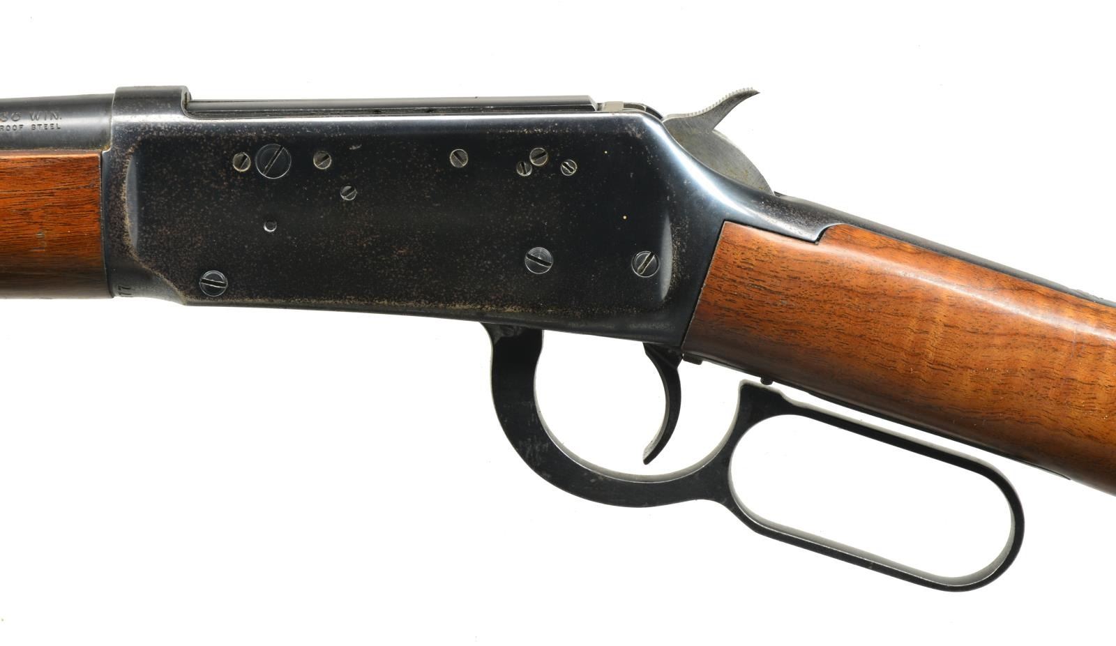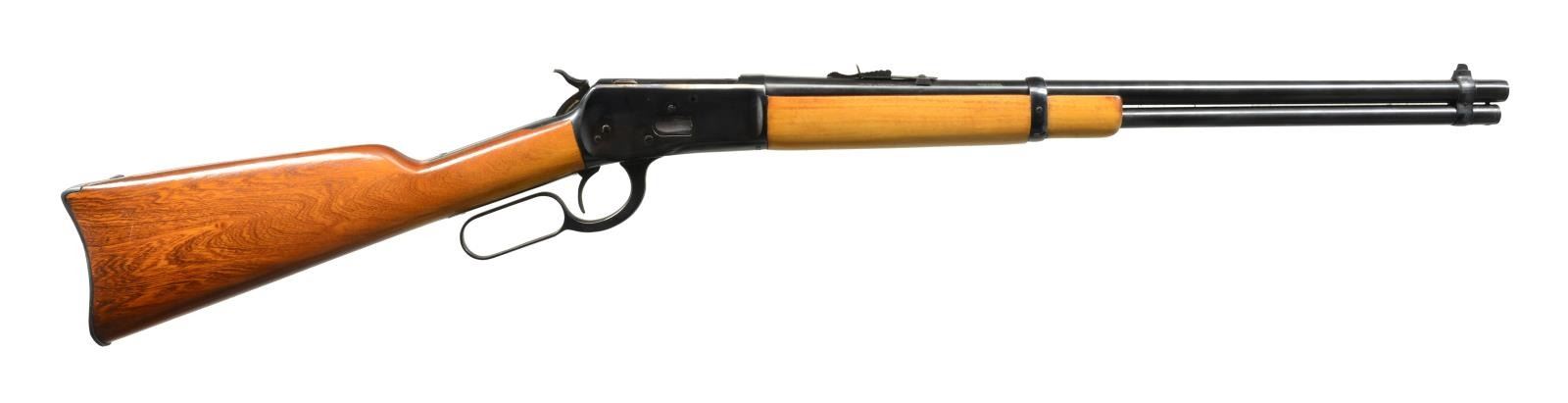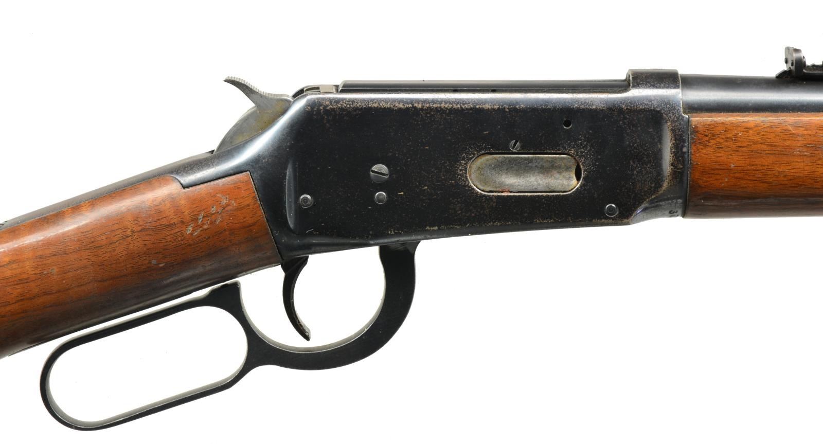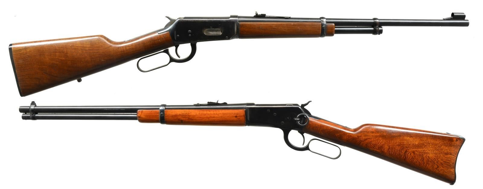1) WINCHESTER POST 64 MODEL 94. Cal. 30-30. S# 3732677. Bbl. 20" w/ hooded ramp bead front sight & sporting rear sight. Mag. tube shortened to 2/3 length. Left side of receiver has 4 added holes w/ plug screws for scope attachment. Short wood carbine forend & straight grip walnut stock w/ original buttplate & added swivel base. 1972 Mfg. CONDITION: 80% blue showing spots of corrosion. Wood has moderately worn finish showing scratches & marks. Bright bore w/ strong rifling. (20-2832/DS). 2) ROSSI 92. Cal. 38 Spl. / 357 Mag. S# K016194. Bbl. 20". Band mounted blade front sight & elevator adj. sporting rear sight. Full length mag. Left side of action has saddle ring & staple. Long wood forearm & straight grip hardwood stock w/ steel carbine buttplate. CONDITION: 97% blue w/ spots of surface corrosion. Wood has lightly worn finish showing a few very sm. marks. Bright bore w/ strong rifling. (20-2861/DS). ALL MODERN. $400-600.
