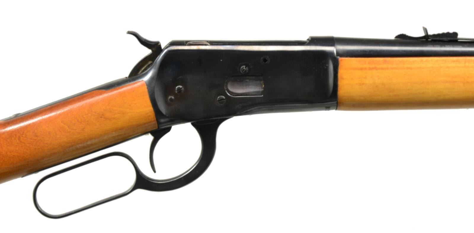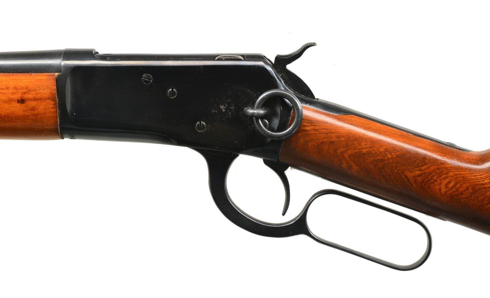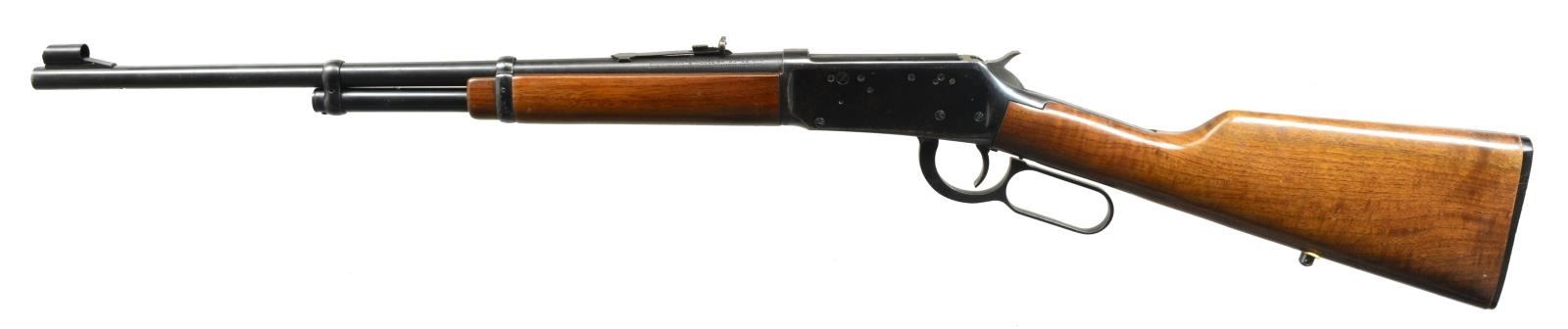 1) WINCHESTER POST 64 MODEL 94. Cal. 30-30. S# 3732677. Bbl. 20" w/ hooded ramp bead front sight & sporting rear sight. Mag. tube shortened to 2/3 length. Left side of receiver has 4 added holes w/ plug screws for scope attachment. Short wood carbine forend & straight grip walnut stock w/ original buttplate & added swivel base. 1972 Mfg. CONDITION: 80% blue showing spots of corrosion. Wood has moderately worn finish showing scratches & marks. Bright bore w/ strong rifling. (20-2832/DS). 2) ROSSI 92. Cal. 38 Spl. / 357 Mag. S# K016194. Bbl. 20". Band mounted blade front sight & elevator adj. sporting rear sight. Full length mag. Left side of action has saddle ring & staple. Long wood forearm & straight grip hardwood stock w/ steel carbine buttplate. CONDITION: 97% blue w/ spots of surface corrosion. Wood has lightly worn finish showing a few very sm. marks. Bright bore w/ strong rifling. (20-2861/DS). ALL MODERN. $400-600.