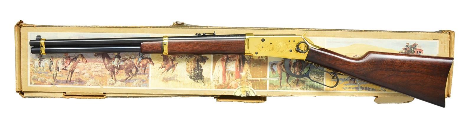 CARBINE. Cal. 30-30. S# YB3983. Bbl. 20". Right side of bbl. has gold marking "YELLOW BOY INDIAN CARBINE". Gold finished bbl. bands, crescent steel buttplate & action. Left side of action has Indian Chief portrait surrounded by open scroll highlights & saddle ring. Right side of action has open scroll engraved highlights. Steel bead blade front sight w/ folding leaf carbine rear sight. Long wood carbine forearm & rifle stock of satin finished black walnut. Limited Edition of 4,903 were produced at Winchester's plant in Cobourg, Ontario in 1972. This is the first commemorative produced specifically for the Western European market. UNATTACHED ACCESSORIES: original box w/ Indian & cavalry scenes on lid. Box contains instructions & warranty papers. Box shows light wear. CONDITION: retains over metal 99% finish. Stock shows scattered sm. marks w/ a dent on left side of wrist. (20-3961/DS). CURIO. $600-900.