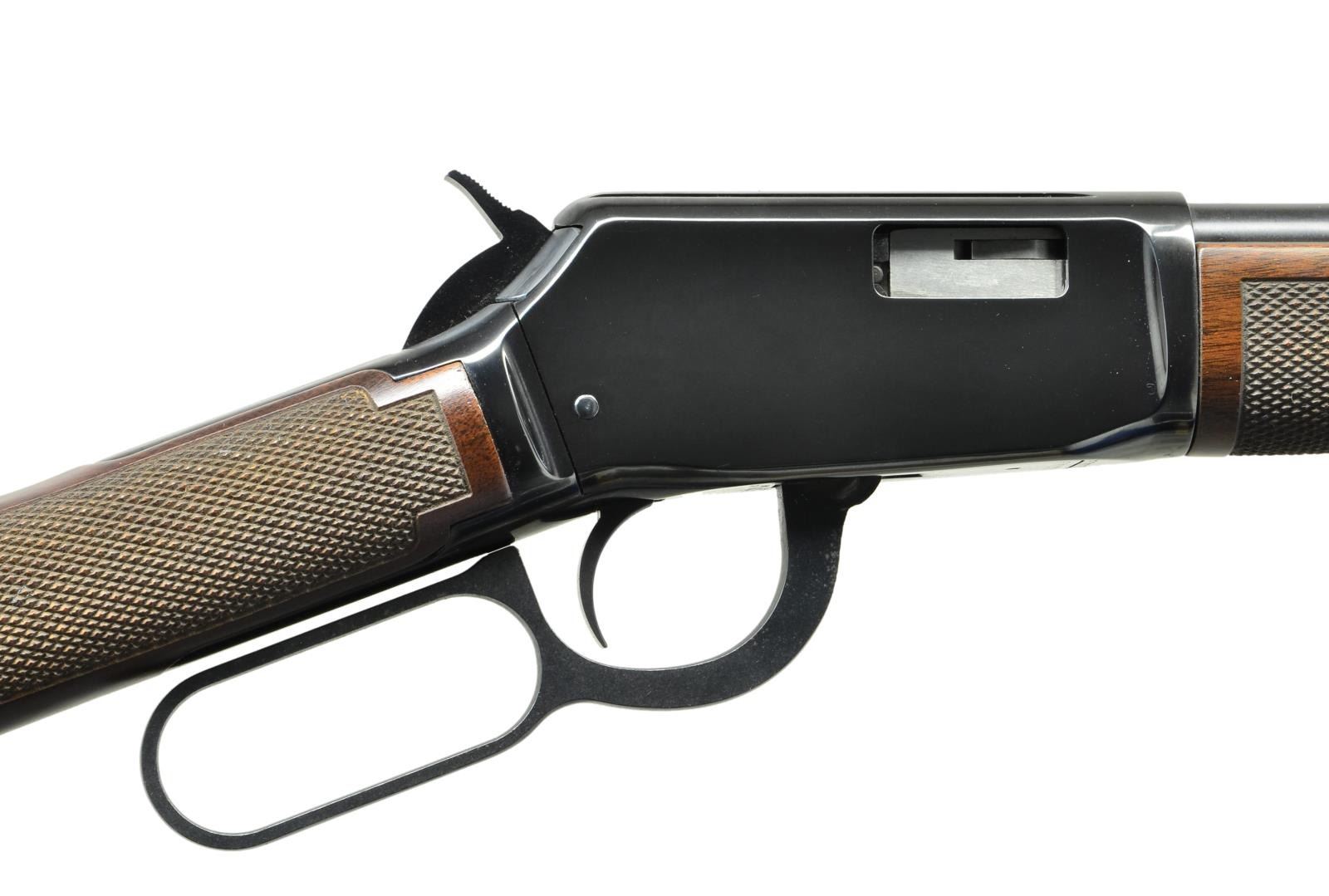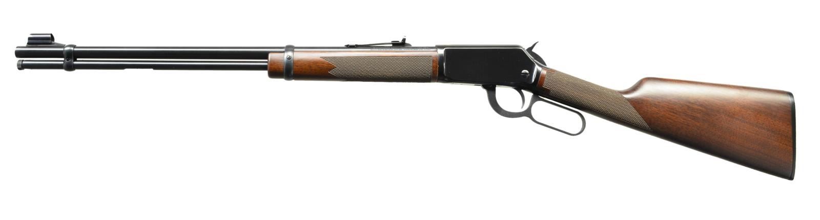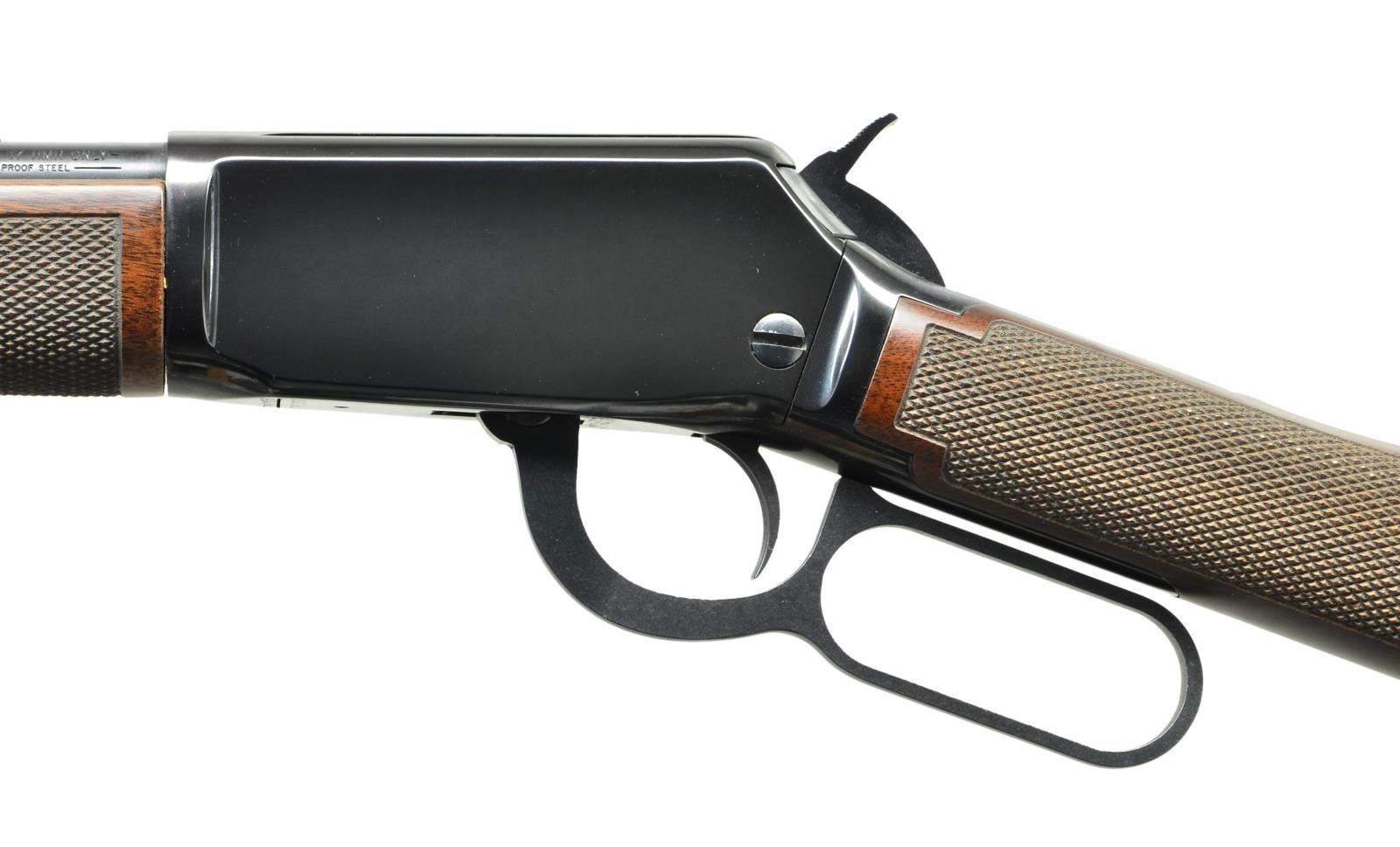 Cal. 17 HMR. S# F761333. Bbl. 20" Hooded ramp bead front sight w/ elevator adj. rear sight. Grooved receiver. Satin finished walnut forearm & straight grip stock have cut checkering. & original butt plate. UNATTACHED ACCESSORIES: Original box containing,owner's manual, hang tag,repair center list, NRA ad & trigger lock. CONDITION: Near new w/ box showing slight blue wear at lever pivot point. (21-4131/DS). MODERN. $1,000-1,500.
