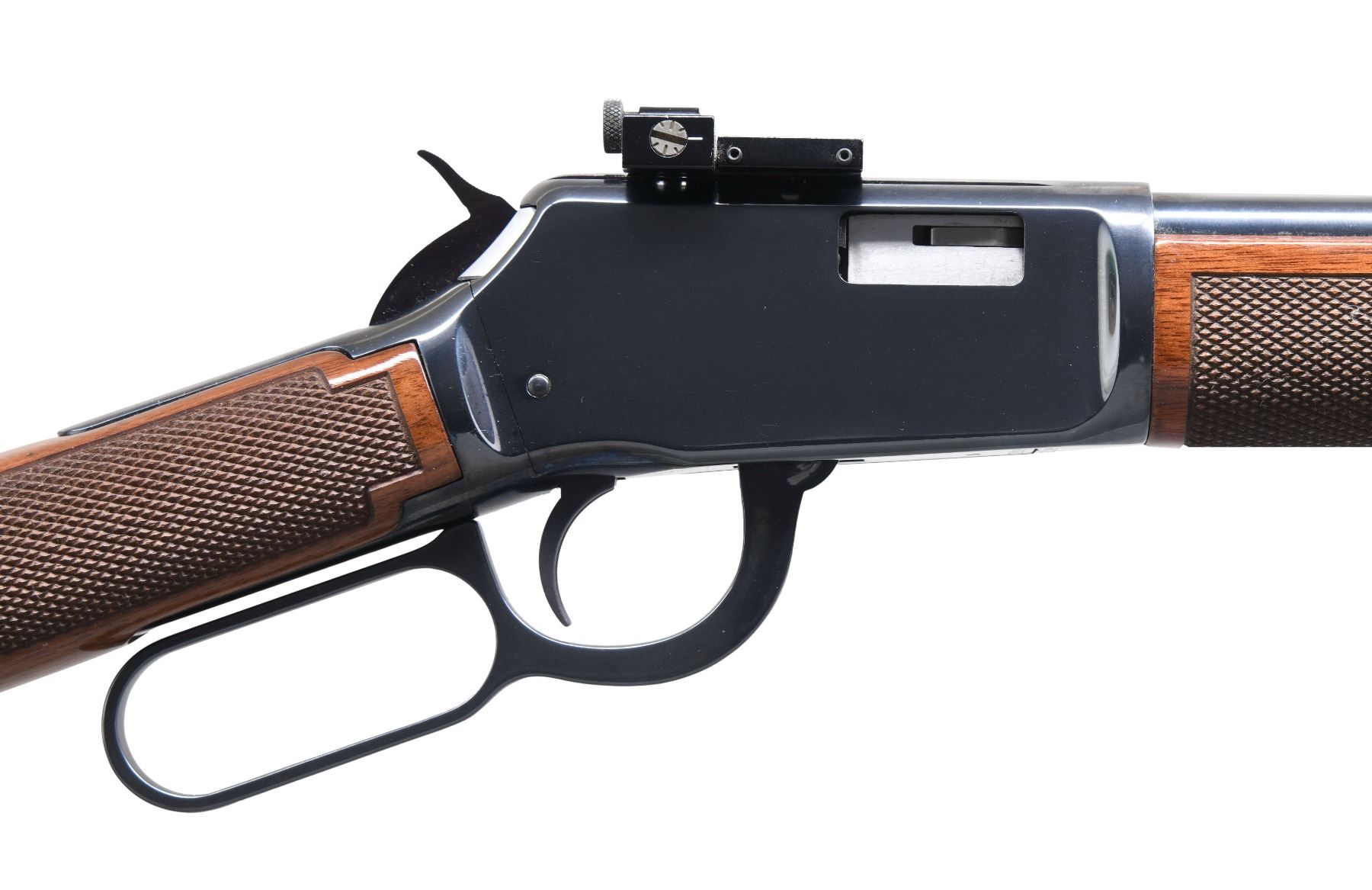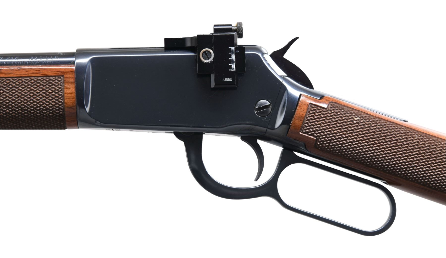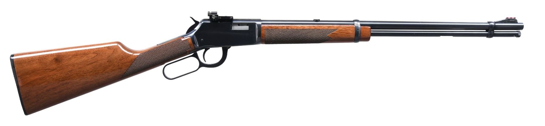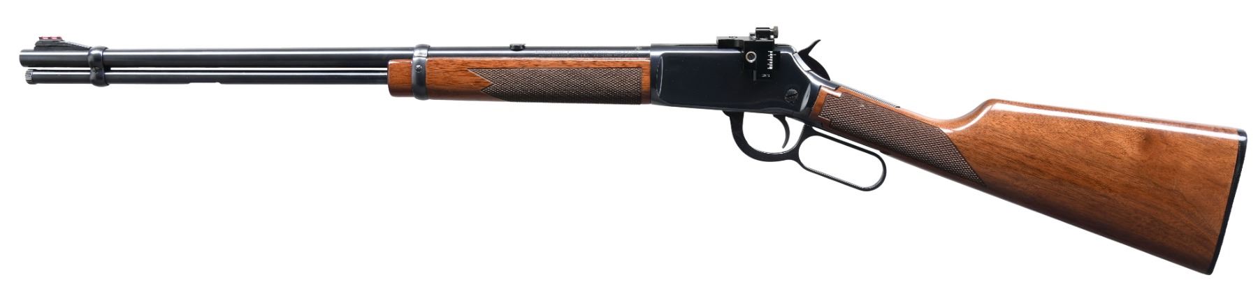 Cal. 22 LR. S# F473522. Bbl. 20 1/2" round. Ramp mounted red fiber optic replacement front sight, filler in rear dovetail w/ Williams receiver sight. Full length tubular mag. Blue finish. Walnut forearm & straight grip stock of gloss finished walnut w/ cut checkering & original buttplate. UNATTACHED ACCESSORIES: original sporting sights. CONDITION: over 98% wood & metal finish showing light scratches. Bright near excellent bore. (24-6617/DS). MODERN. $600-900.
