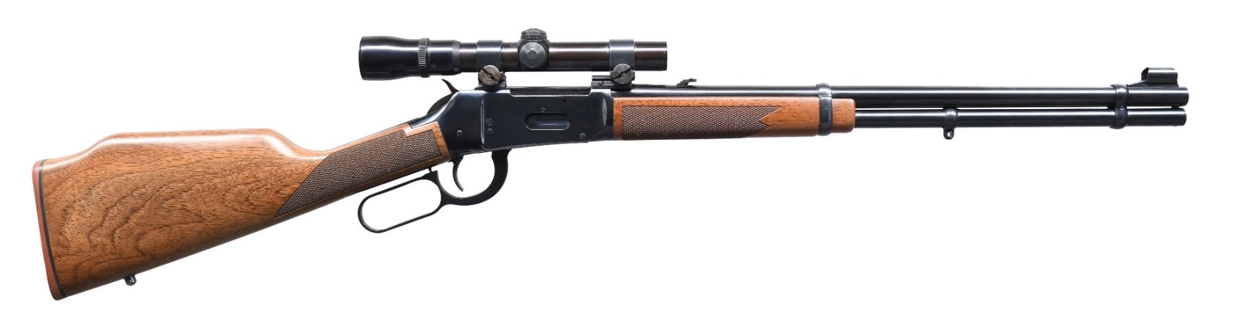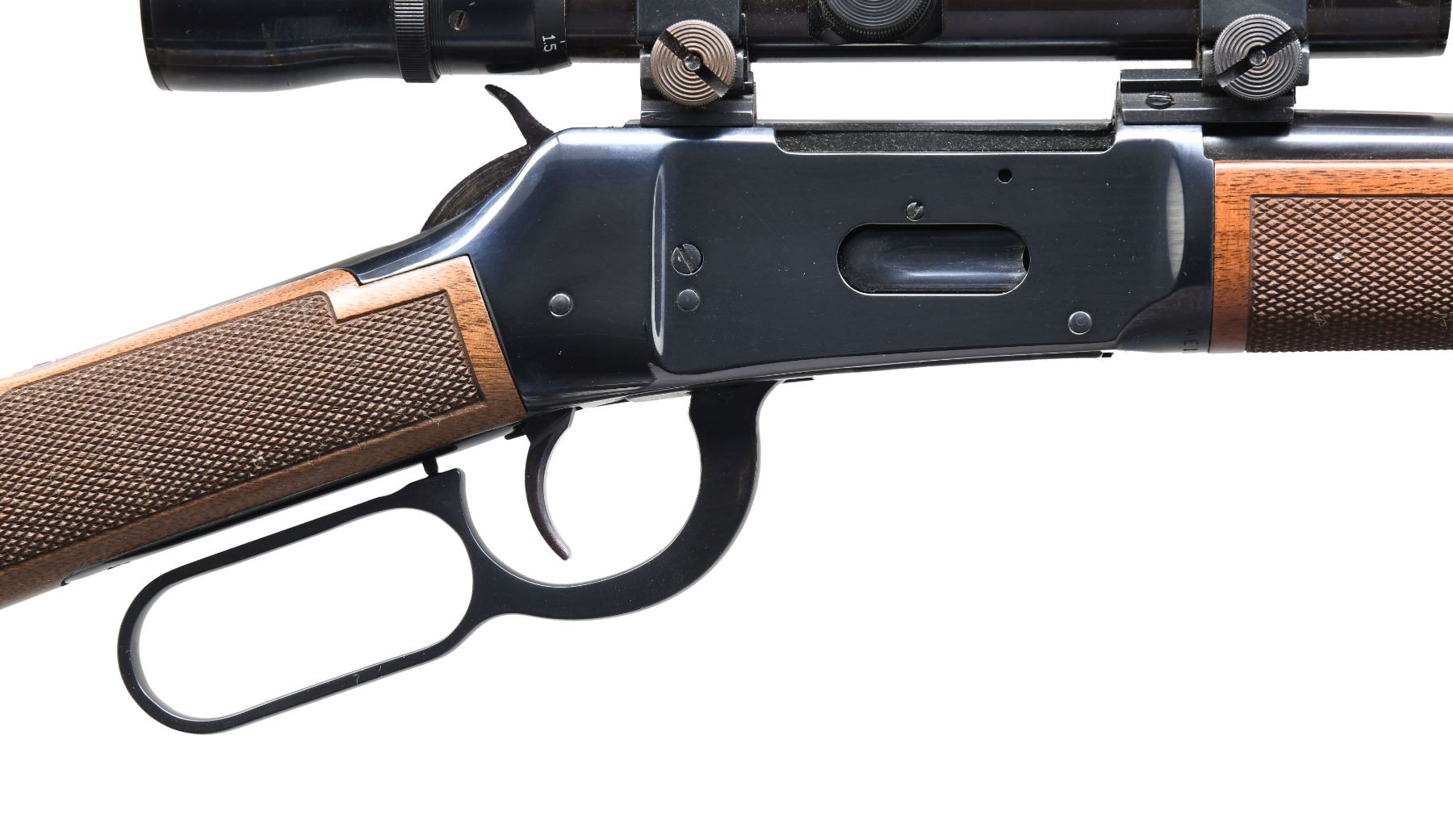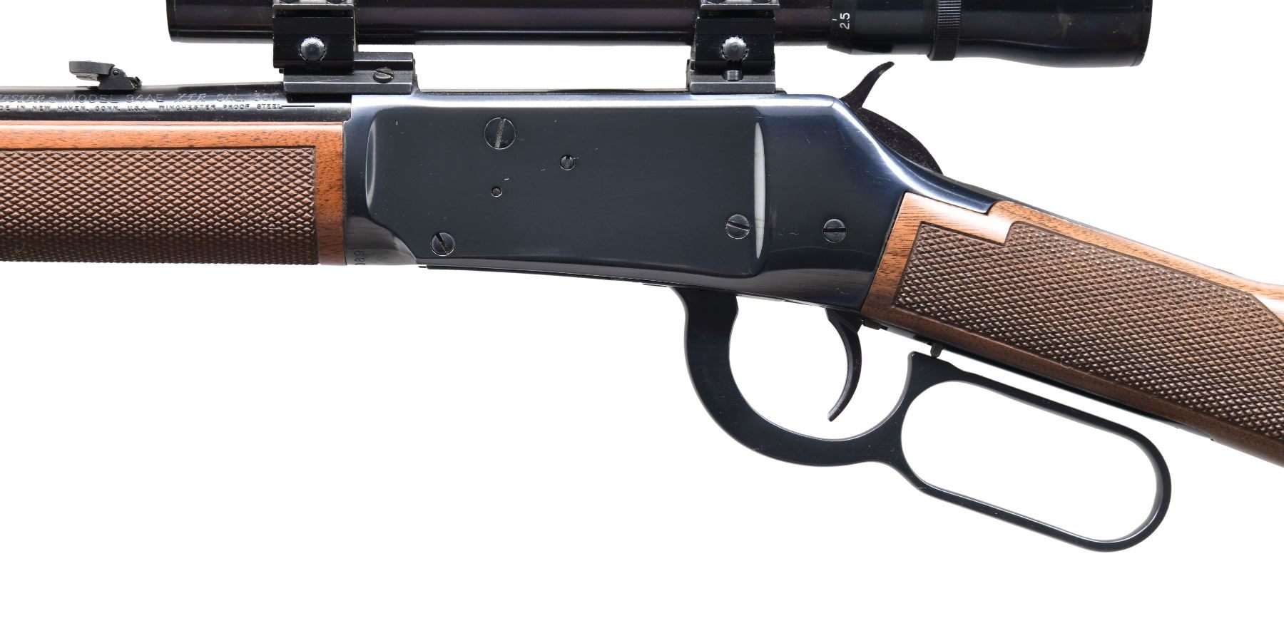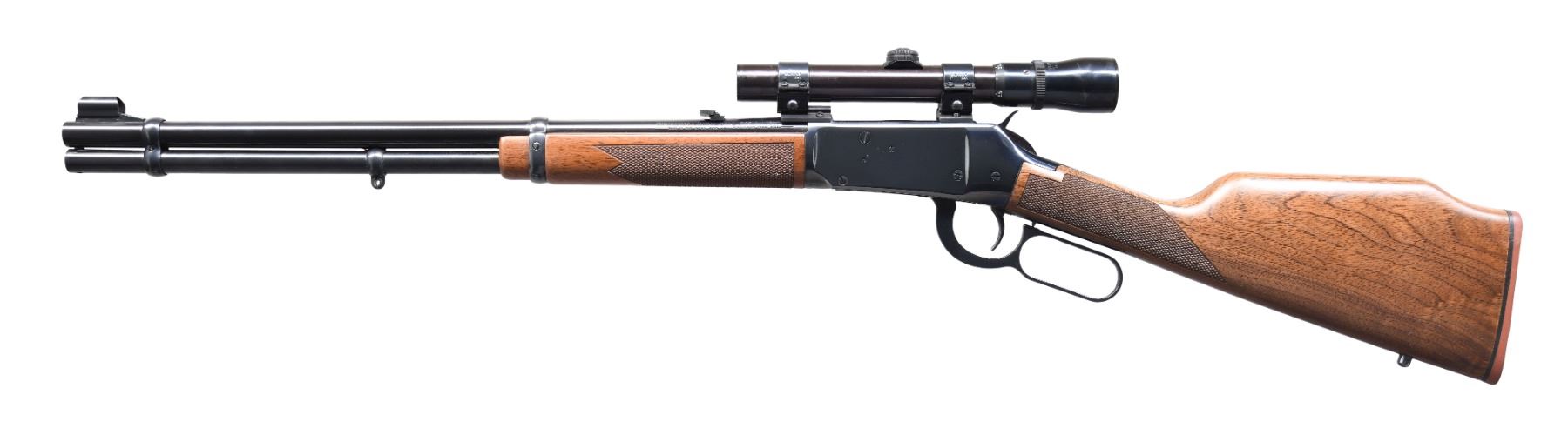 Cal. 307 Win. S# AE11089. Bbl. 20" round. Hooded ramp bead front sight w/ folding leaf rear sight. Weaver V 4.5 gloss finished scope w/ standard crosshairs on Weaver mounts. Full length tubular mag. Band fastened forearm & Monte Carlo walnut stock w/ cut checkering & thin red pad. Added sling swivels. CONDITION: near excellent retaining nearly all original finish. Bright near excellent bore. Scope has clear optics. (24-6313/DS). MODERN. $1,000-1,400.