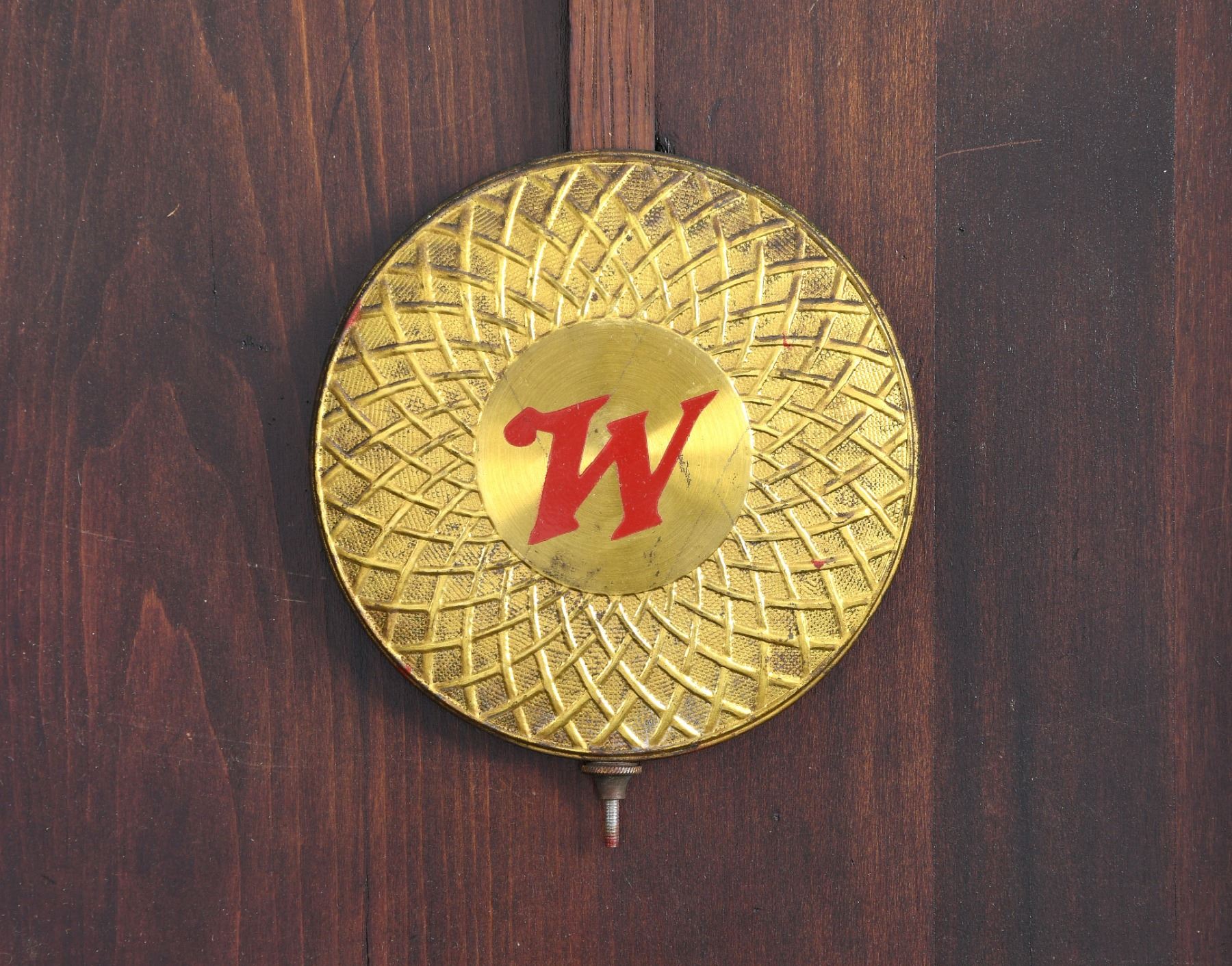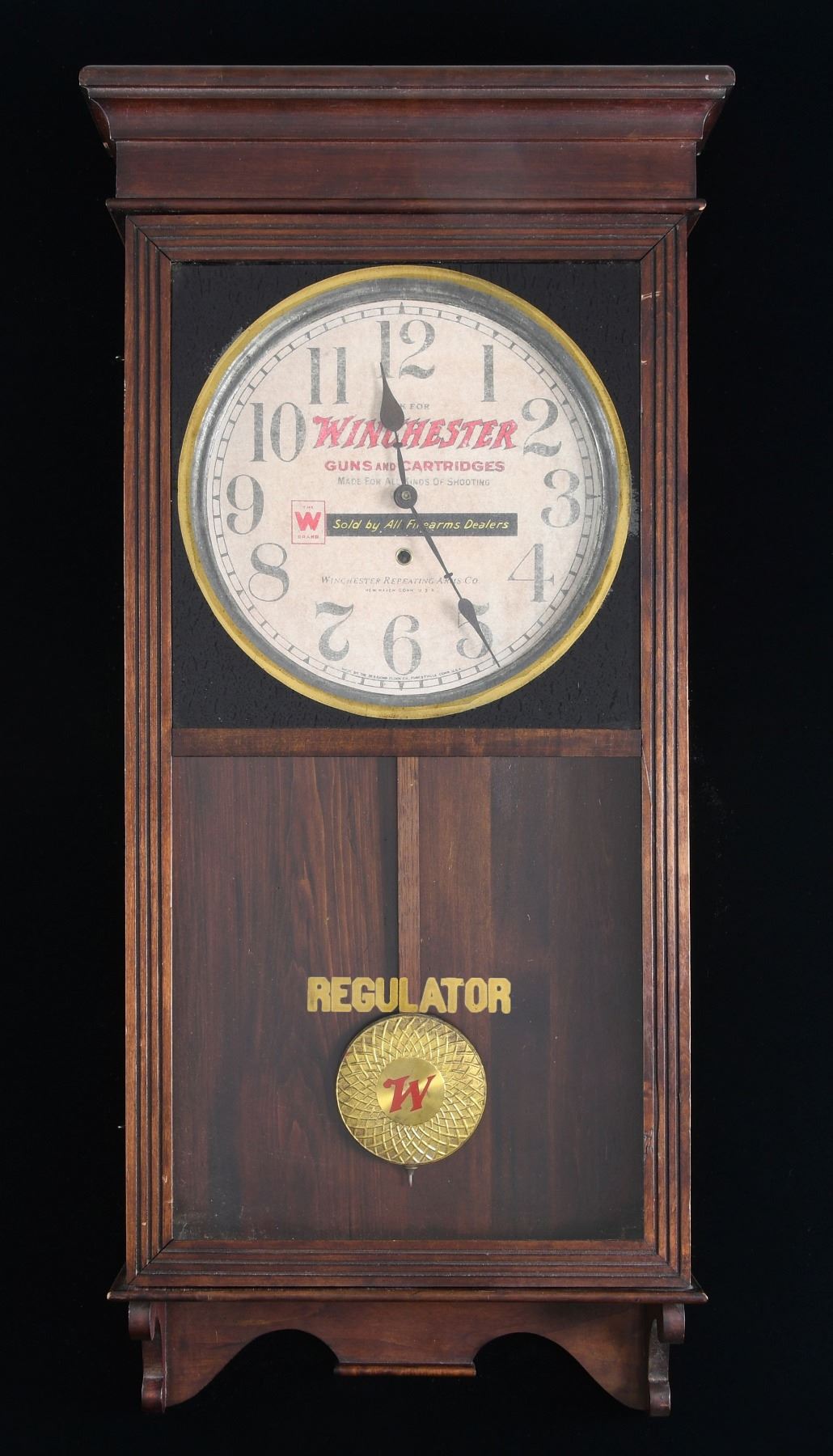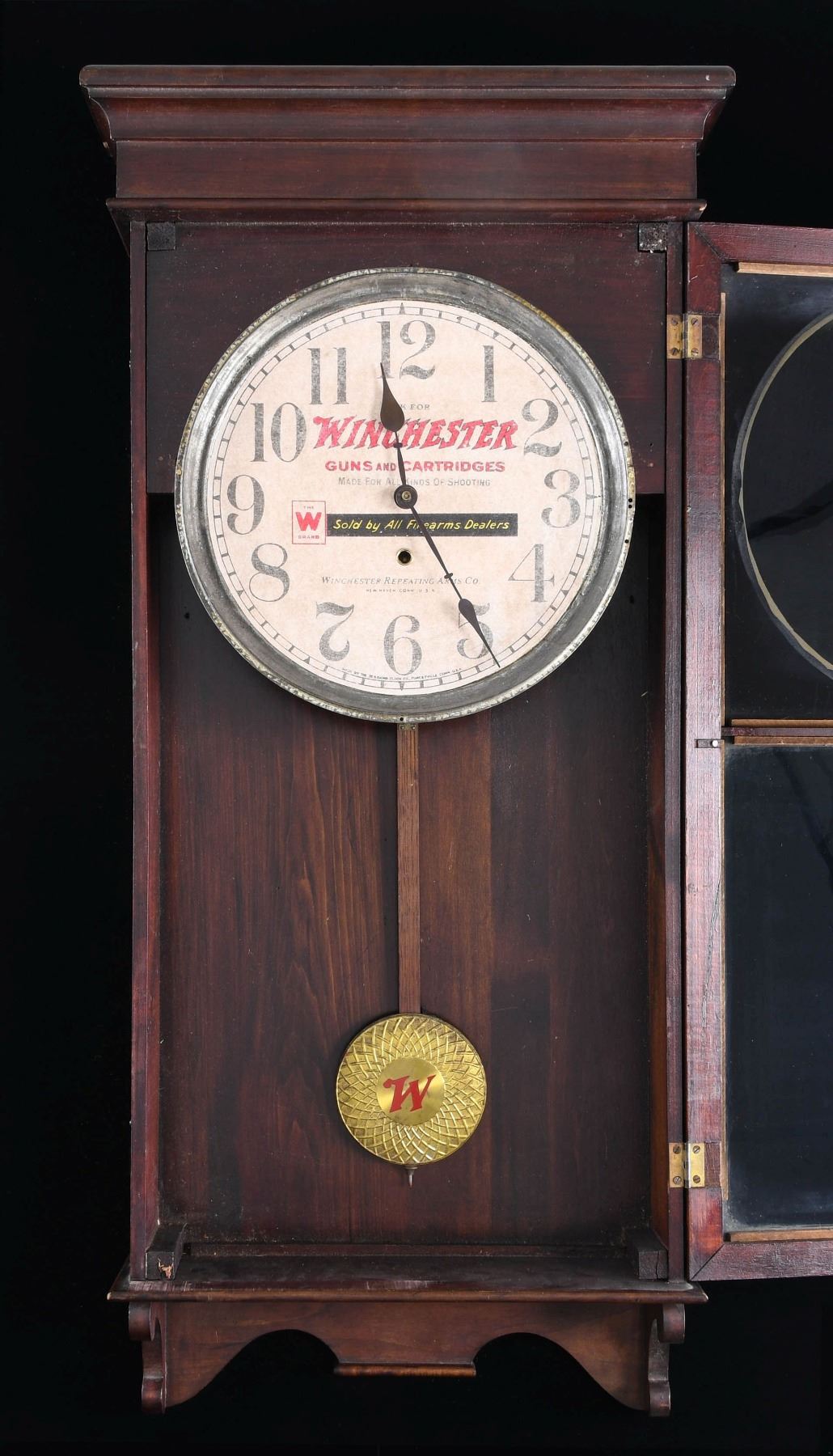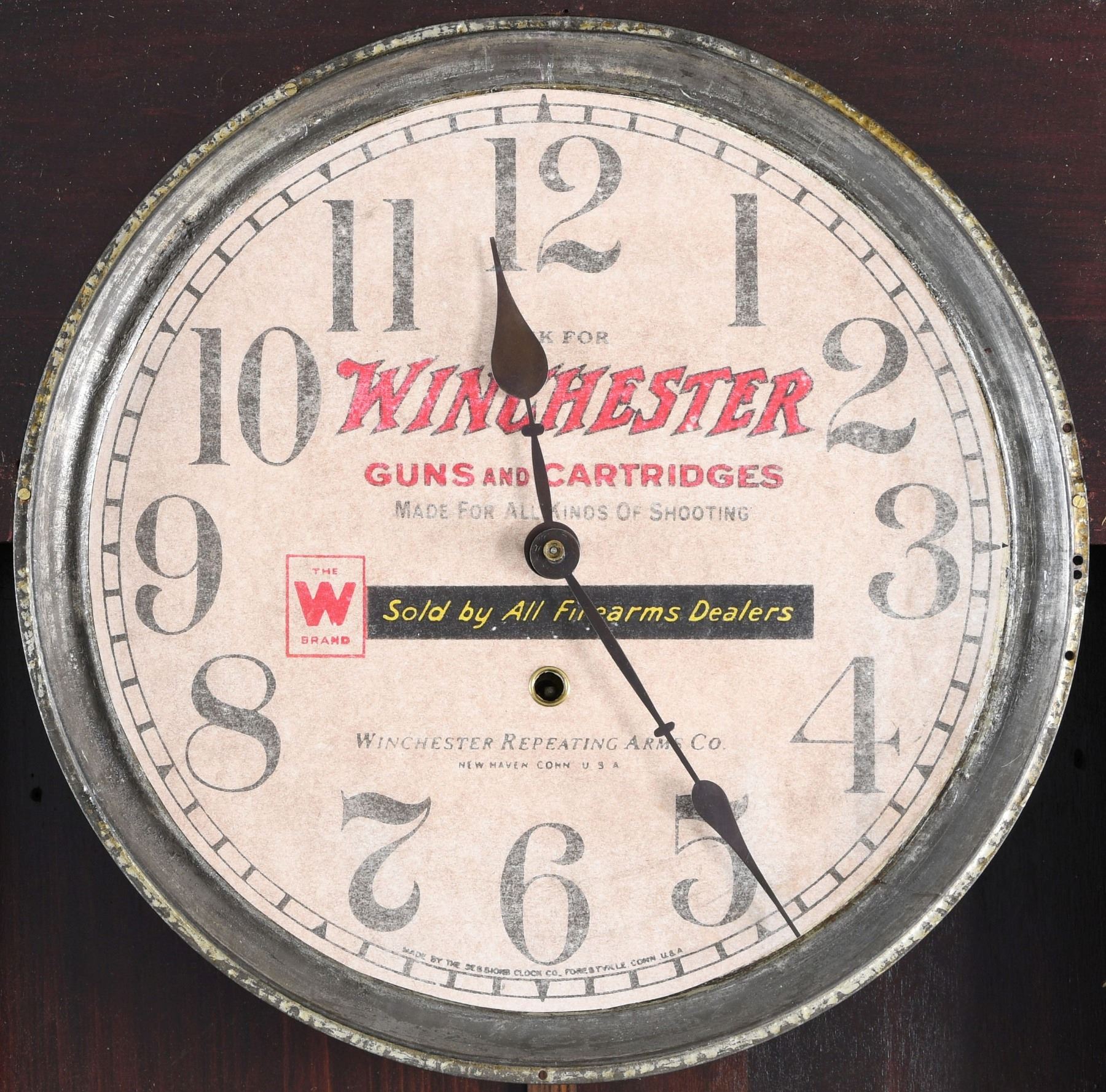 From one of the finest private clock collections in the United States we offer this Winchester Advertising Clock. According to the 1908 Sessions catalog this model was called Regulator # 2. The flawless mahogany stained case measures 38-1/2" tall, 16" wide, with a brilliant 12" original Winchester advertising dial. CONDITION: The clock is 100% original. The eight day movement is stamped sessions and has recently been serviced assuring decades of accurate use. Both glasses are old and wavy. The hands are original as is the pendulum that portrays the "W" logo. All the hardware, hooks and hinges are original. When hanging in your gun room it will attract fellow gun collectors to admire and gravitate to it upon entering the room. (02-24007). $1,500-2,000.