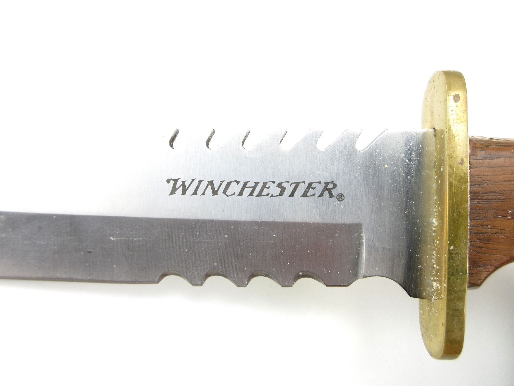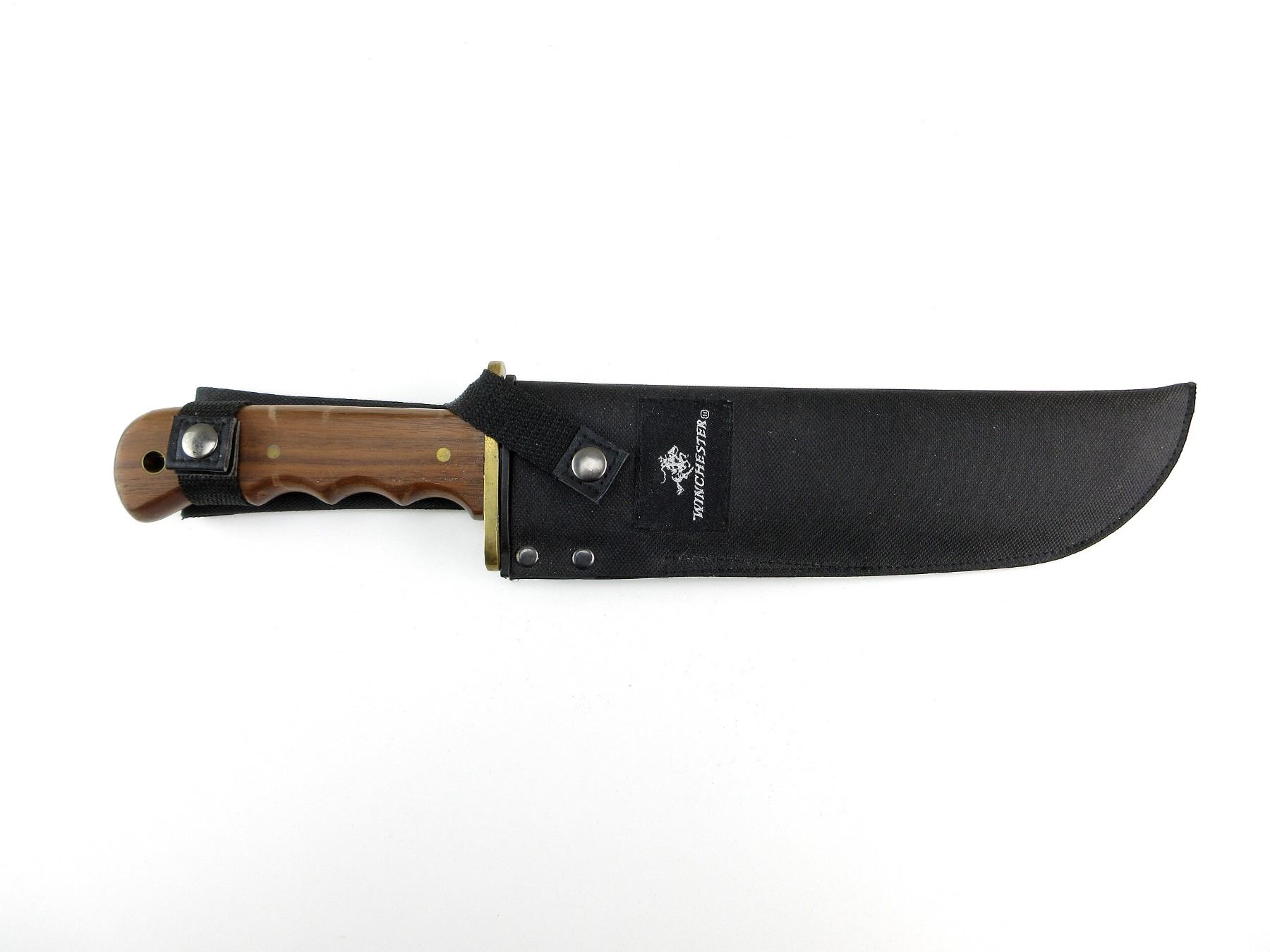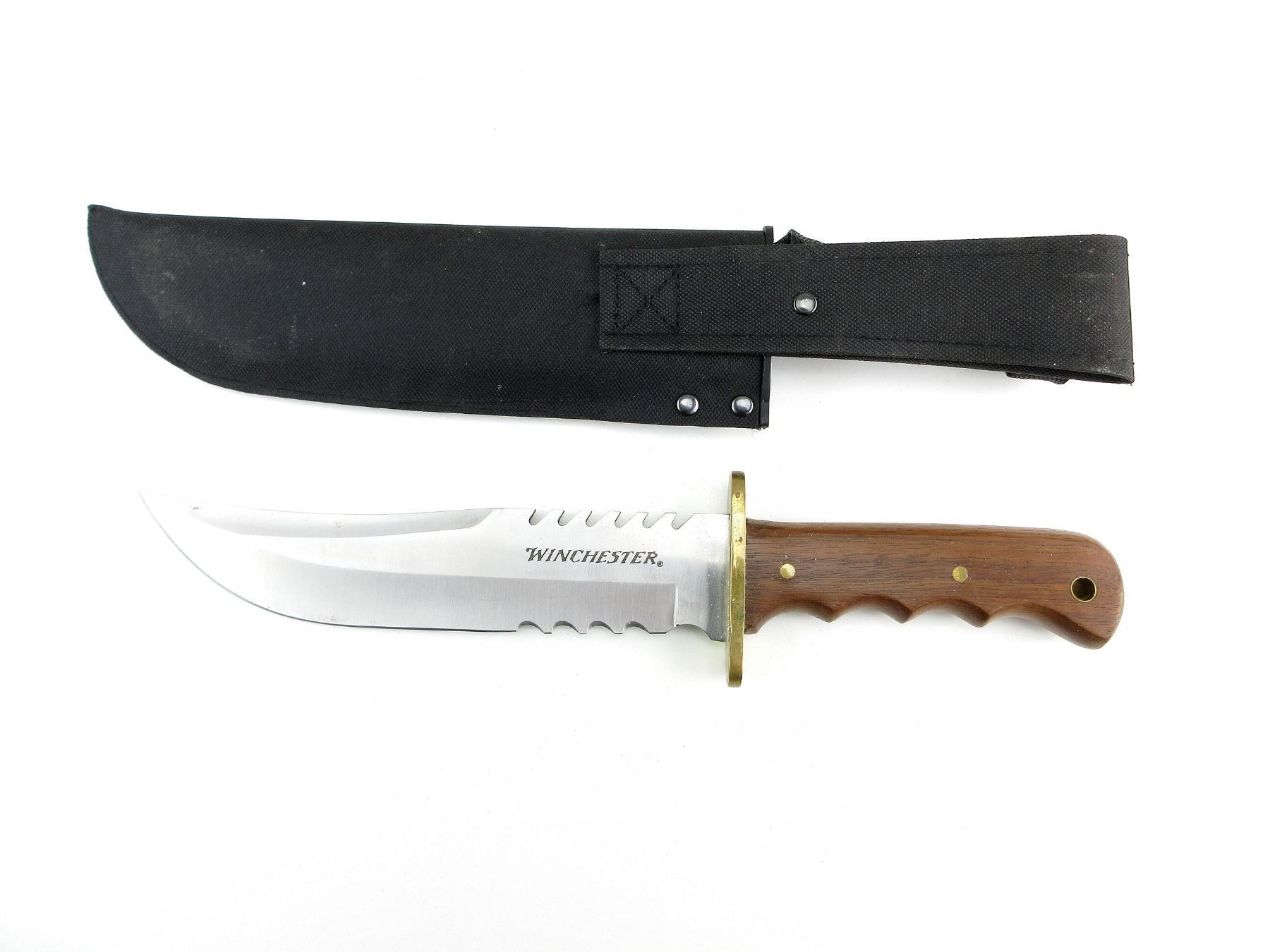 (1) FIXED BLADE KNIFE, STEEL SHARPENED BLADE, MARKED: "WINCHESTER", OTHER-SIDE MARKED: "4660715A", WOODEN HANDLE, BLACK NYLON SHEATH MARKED: "WINCHESTER", OAL APPROX. 8 3/8". SEE PHOTOS.