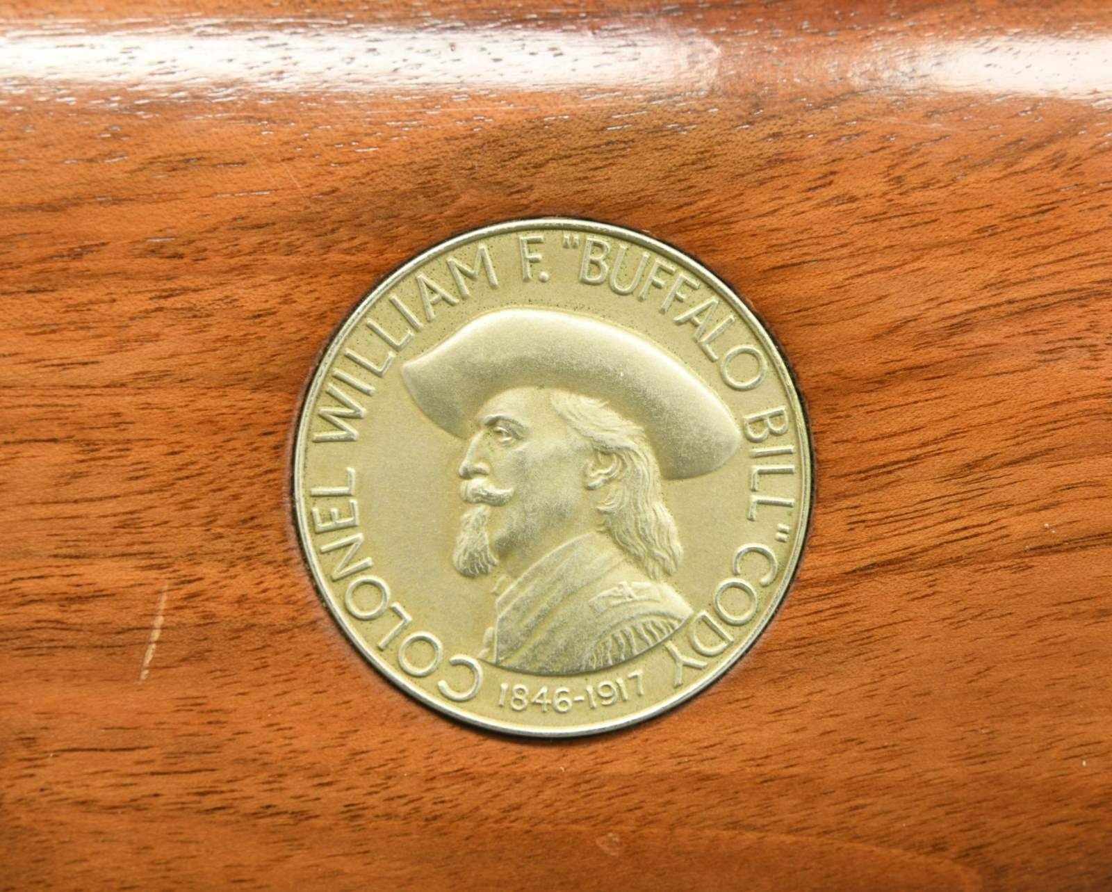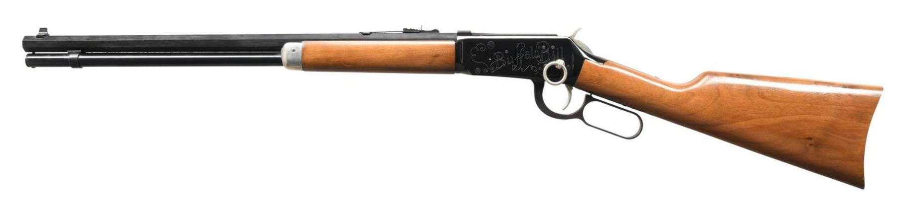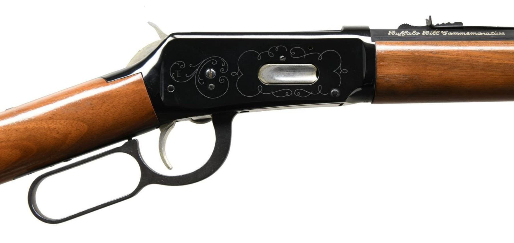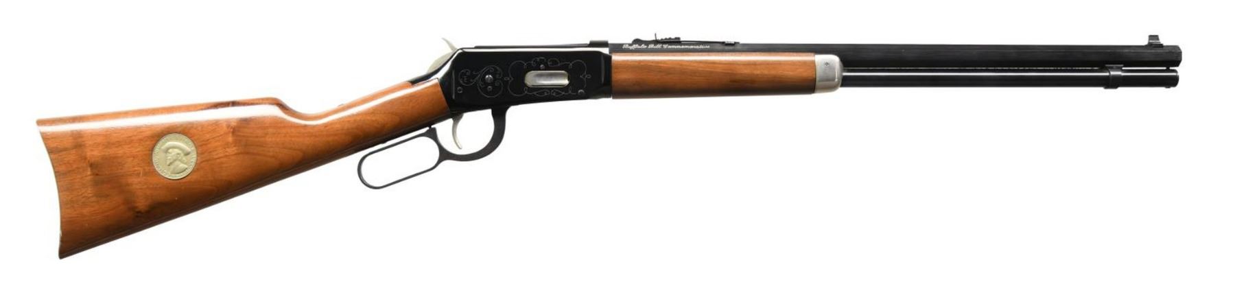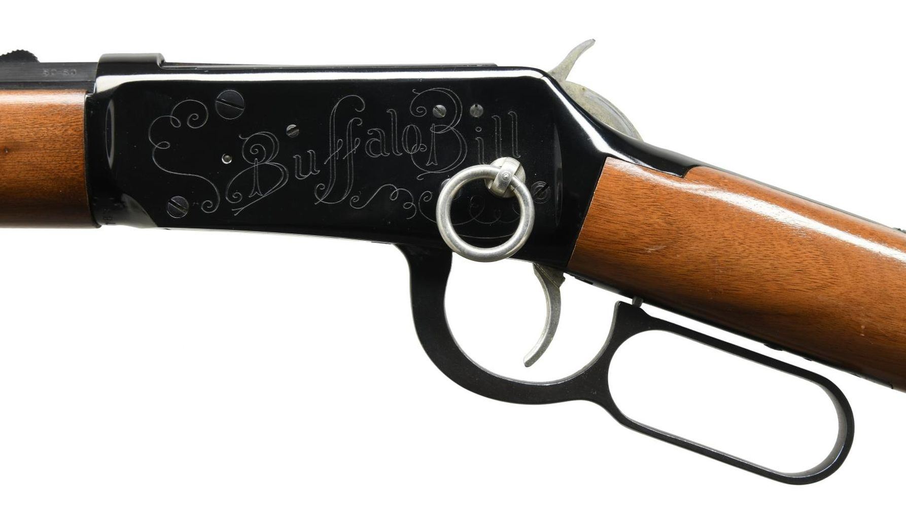Cal. 30-30. S# WC55789. Bbl. 20" oct. Bead front sight. Adjustable sporting rear sight. Right side of bbl. marked "BUFFALO BILL COMMEMORATIVE". Upper tang marked "W.C. CODY CHIEF OF SCOUTS". Left side of receiver marked "BUFFALO BILL". Both sides of receiver have floral engraving. Blued finish. Silver nosecap, saddle ring, hammer, trigger & loading gate. Walnut stock & forend. Right side of stock has coin w/ a picture of Buffalo Bill. CONDITION: stock set shows some handling wear & light dings. Metal shows some sparse oxidation specks & light handling wear. Very good bore. (23-2554/MJC). CURIO. $500-800.