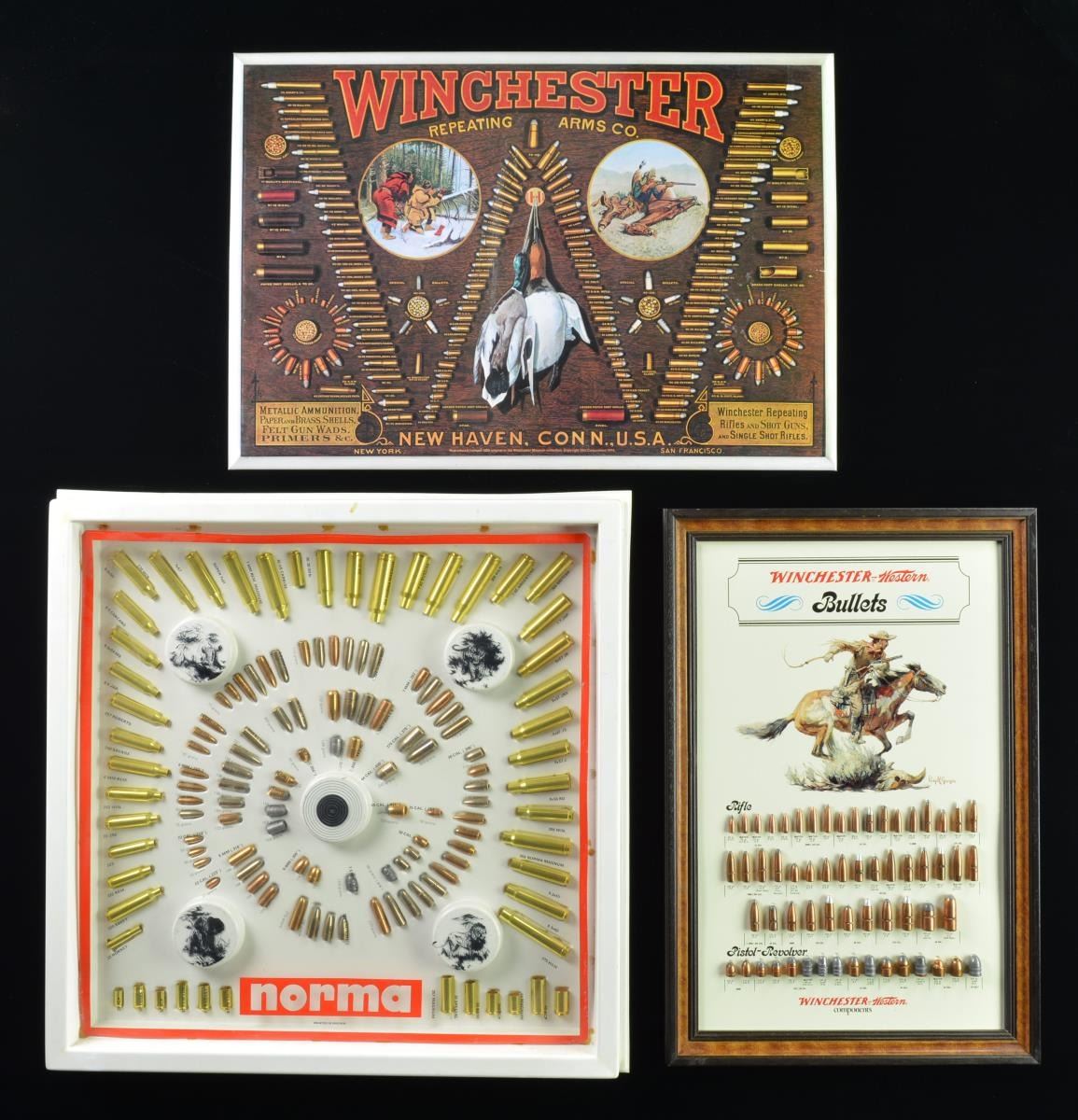 3) 1974 PRinted metal sign of 1894 Winchester bullet board. Approx. 23" x 16". CONDITION: very good overall w/ light wear. (02-16825-5/MD). $300-500.