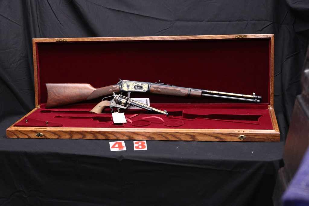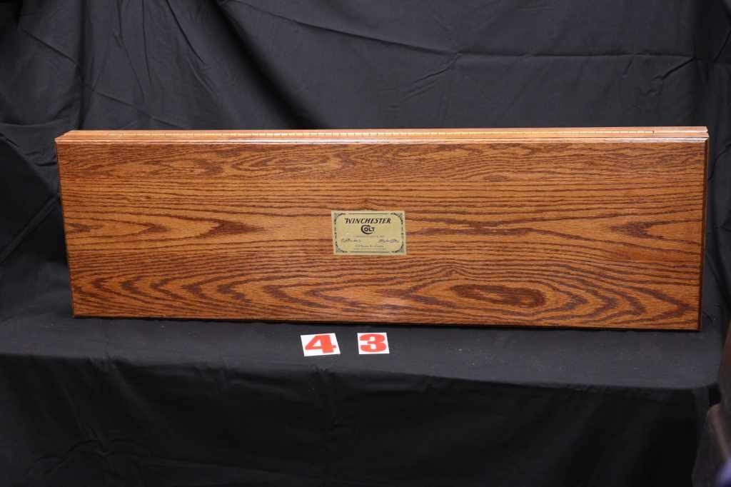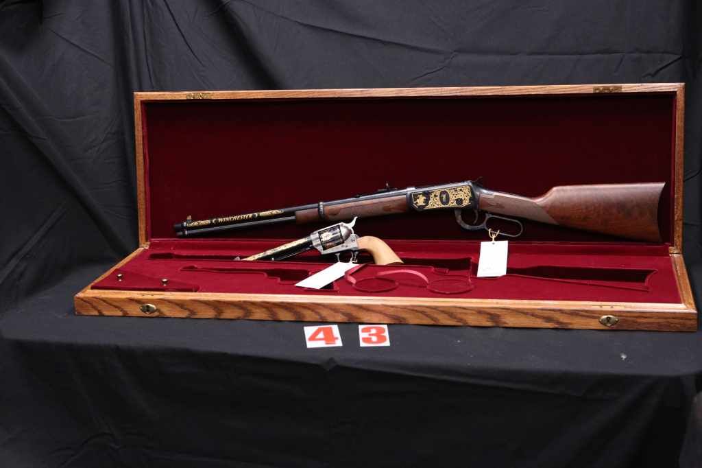 WINCHESTER/COLT, COWBOY COMMEMORATIVE. THIS SET COMES WITH A MODEL 94 WINCHESTER AND COLT SAA BOTH WITH SAME SERIAL NUMBER. BOTH GOLD EMBOSSED AND BOTH IN 44-40 IN A LARGE OAK CASE. ALL LOOK TO BE UNOPENED, NEW IN BOXES. FANTASTIC COLLECTION,