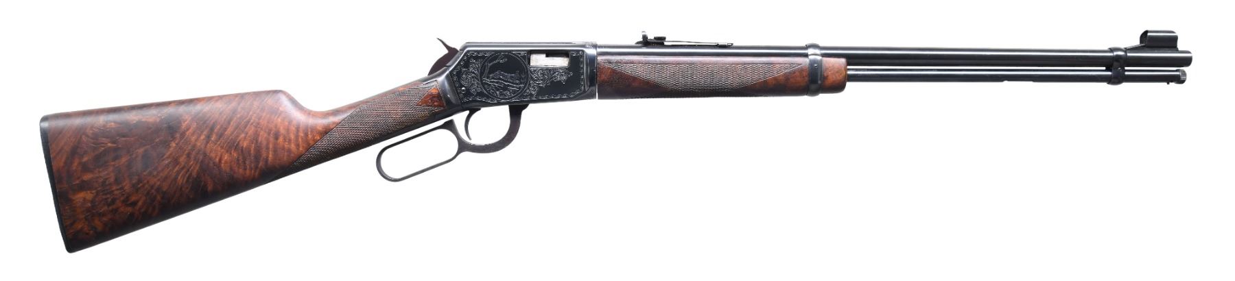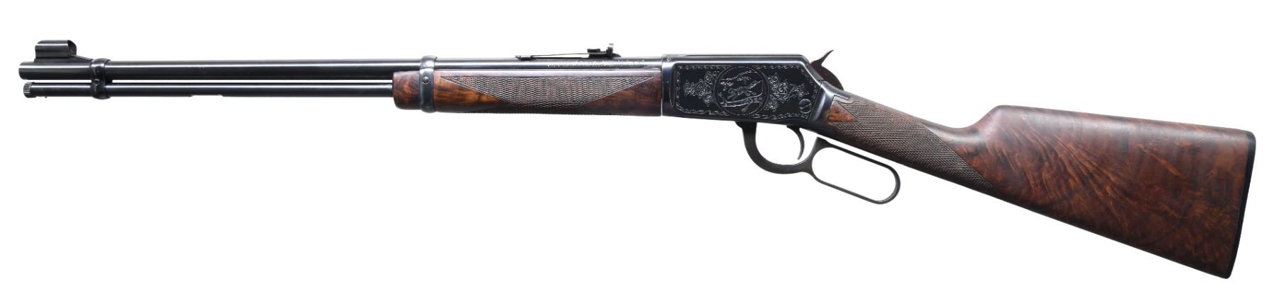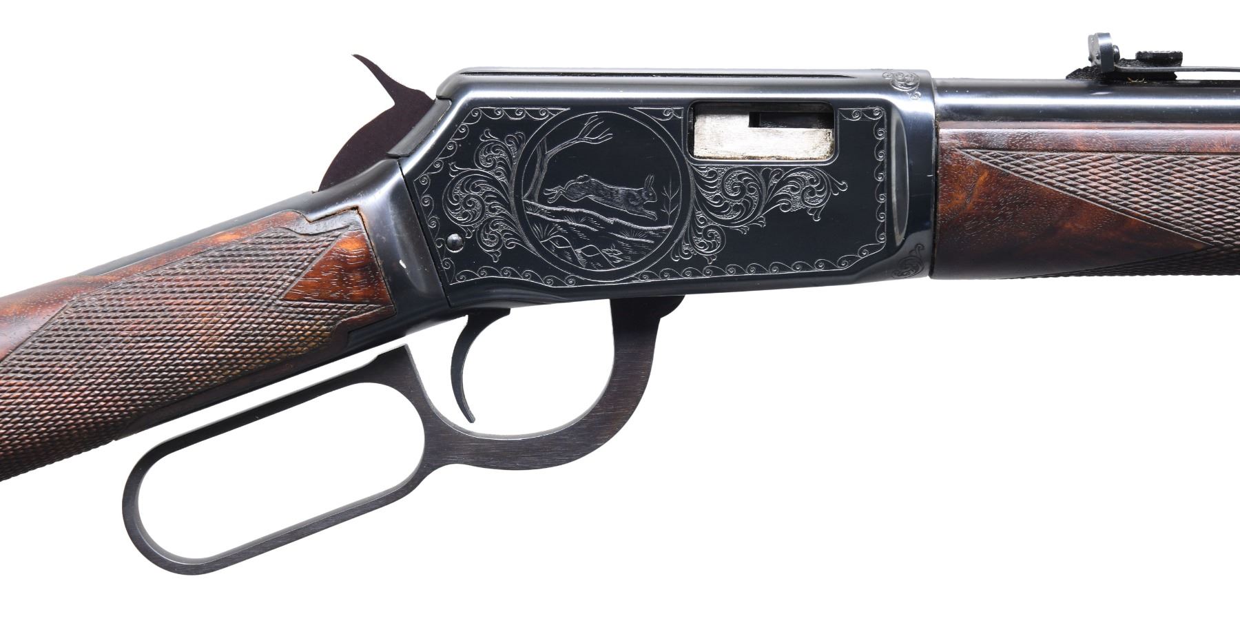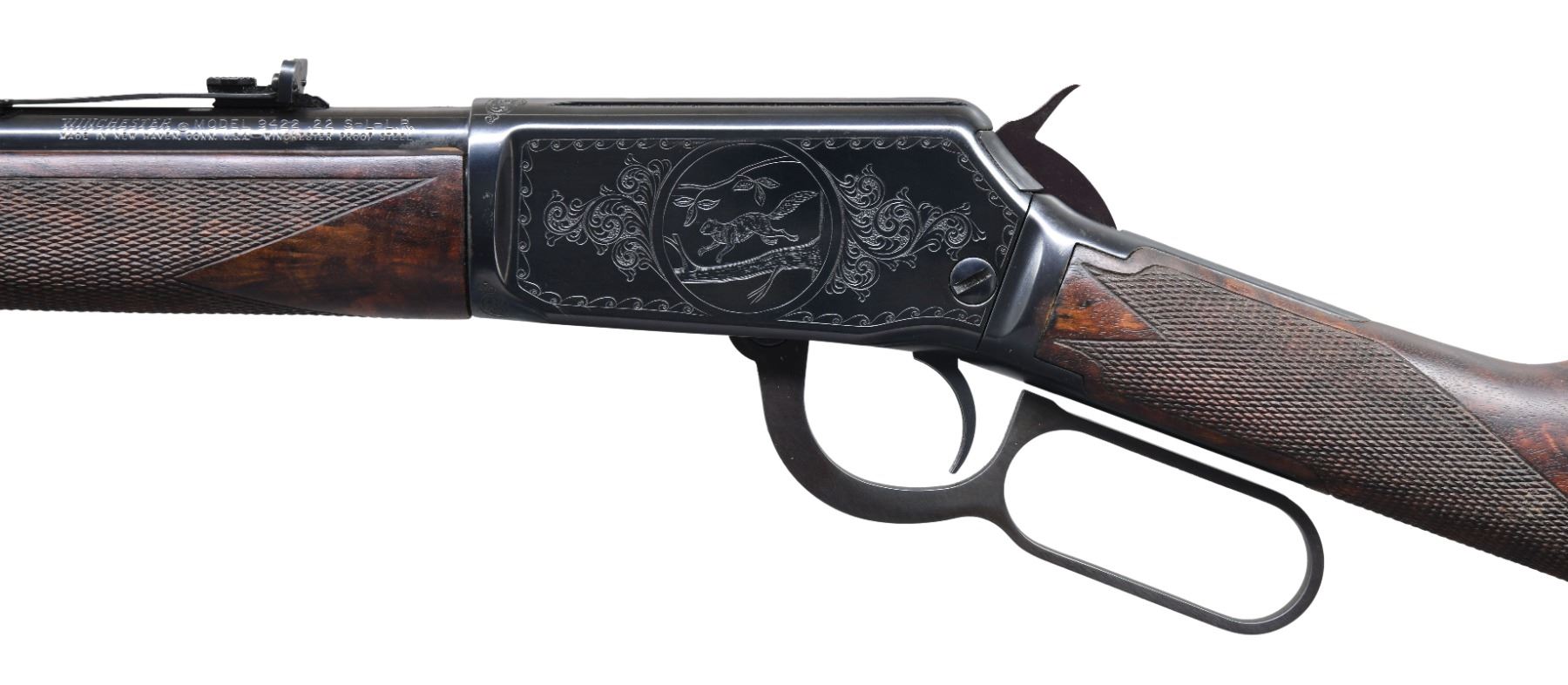 RIFLE. Cal. 22 S, L, LR. S# F291624. Bbl. 20" round w/ hooded ramp front sight & pre-64 style sporting rear sight. Full length mag. Action has unsigned hand engraving in factory style 10. Right side vignette shows a running rabbit. Left side shows a squirrel on a limb. Scenes are surrounded by vine type foliate scroll w/ punch dot backgrounds & curled borders. The scroll work continues to upper & lower receiver areas. Forearm & straight grip custom aftermarket stocks of very fancy black walnut having burl figure & dark tones. Borderless wraparound hand checkering. Original style plastic buttplate. CONDITION: beautifully upgraded gun, retaining over 95% reblued metal finish having small spots of corrosion w/ areas of rust where the stock meets the receiver. Wood has a good satin finish showing scattered small marks. Bright near excellent bore. (25-210/DS). MODERN. $1,000-2,000.