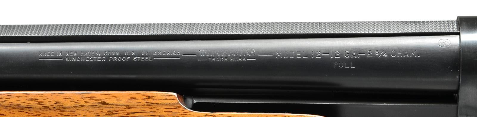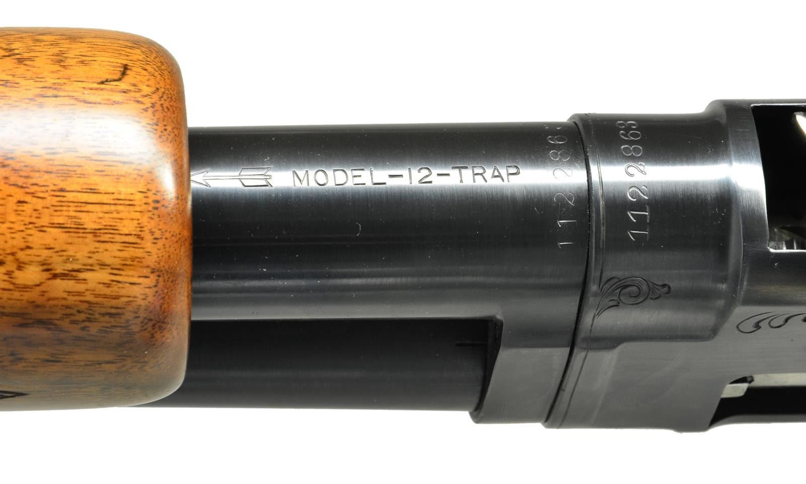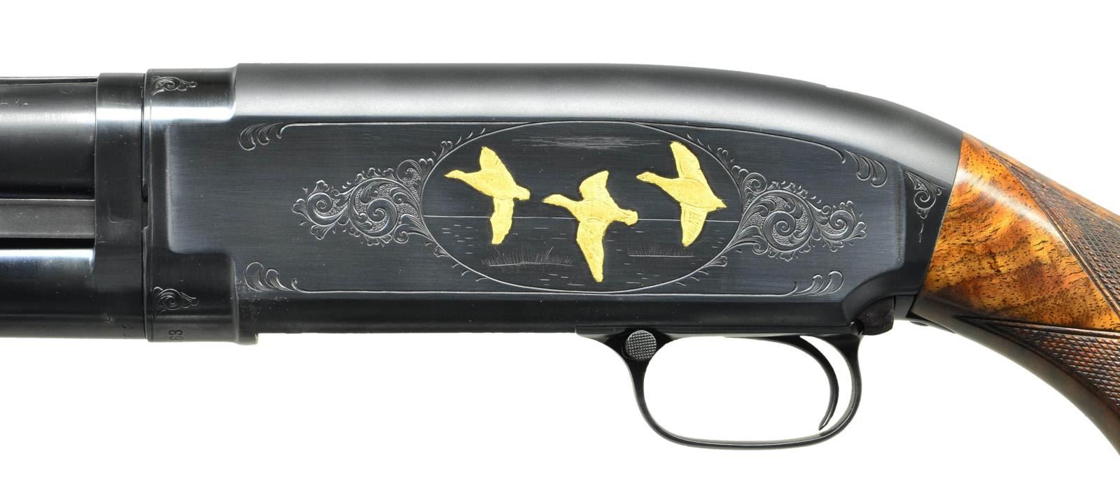 SHOTGUN. Cal. 12 Ga., 2 3/4". S# 1122863. Bbl. 30" w/ solid rib, fixed full choke & steel bead. Action has finely executed unsigned custom engraving in factory 12-3 pattern. Right side vignette features a gold inlaid pointing dog. Left side features 3 gold inlaid flying geese. Scenes are surrounded by highlights of vine type foliate scroll that extend to front portion of action. Receiver extension is marked "MODEL-12-TRAP". Factory beavertail forearm & hard rubber capped pistol grip straight comb trap stock of fancy walnut w/ target pattern checkering. LOP: 14 1/8" over solid red Winchester pad. Mfg. 1948. CONDITION: over 98% nicely reblued metal finish. Wood has very good refinish w/ freshened checkering. Sound action. Left side of receiver extension has a dent over the slide bar area. Very good bore. (21-2034/DS). CURIO. $1,700-2,200.