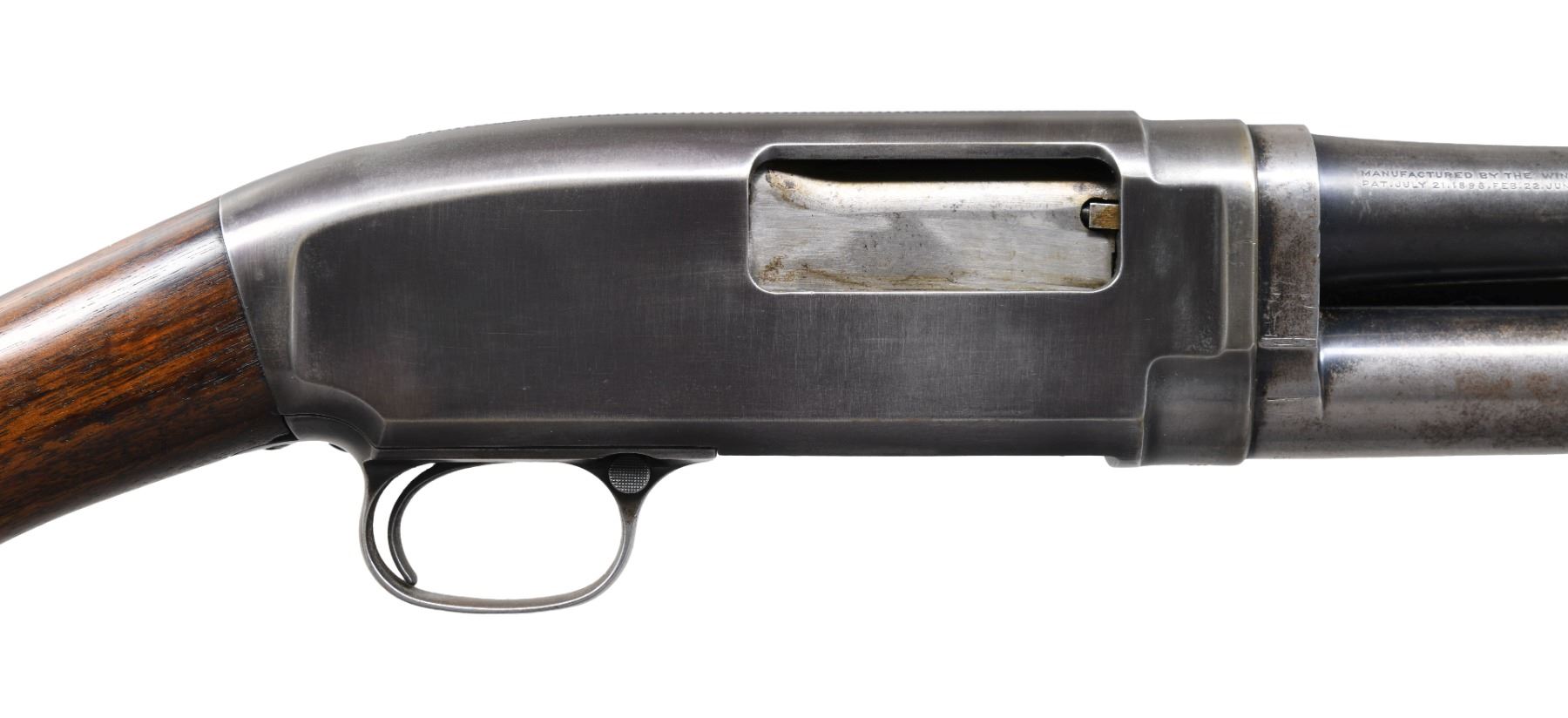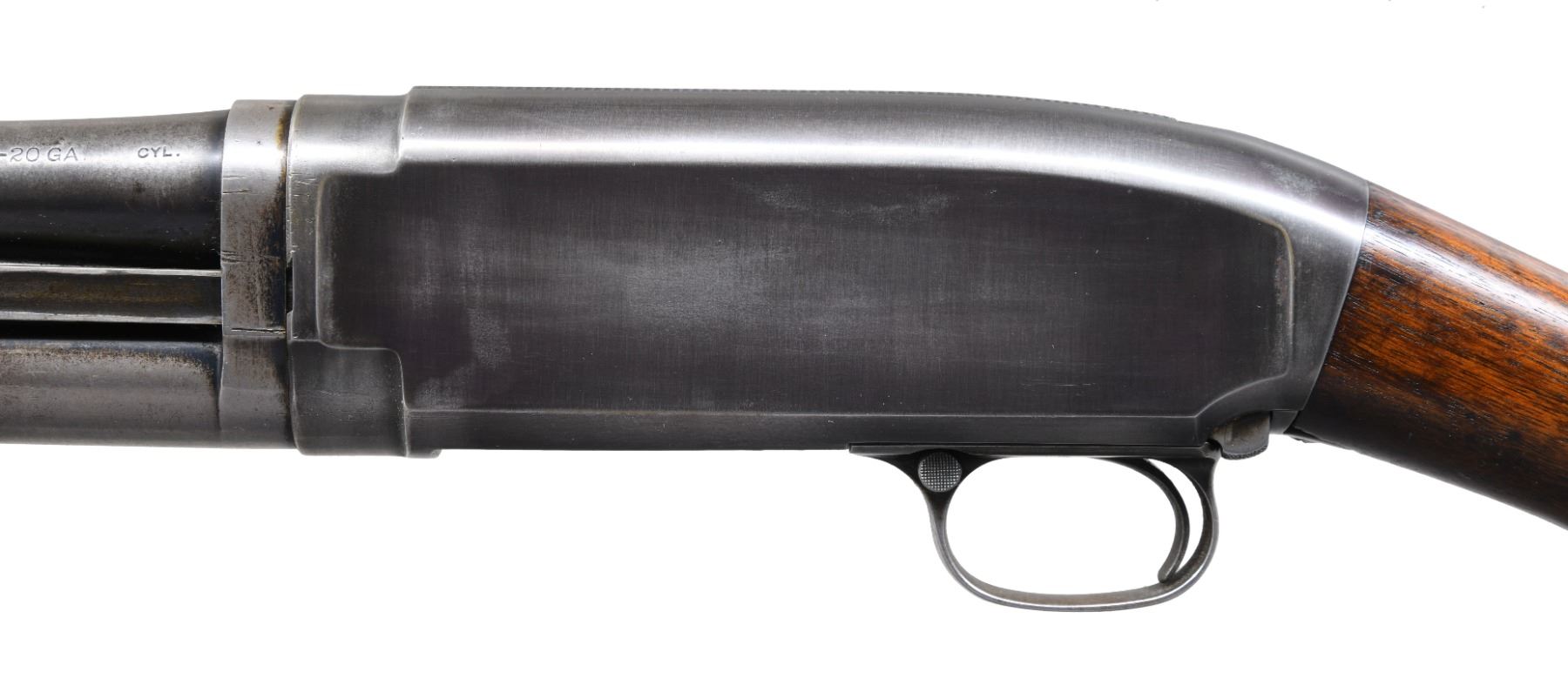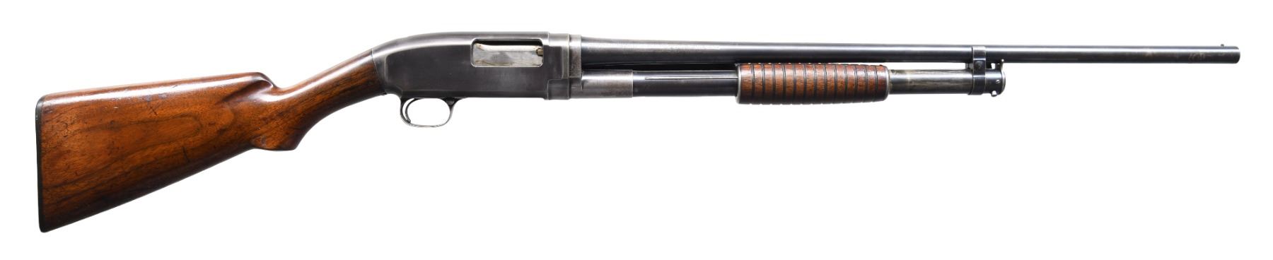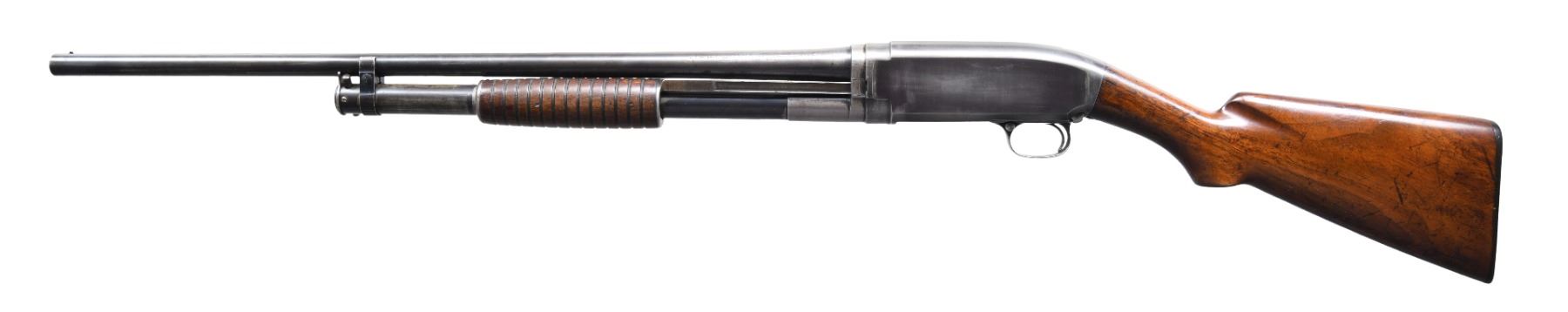 PUMP SHOTGUN. Cal. 20 ga. S# 552. Bbl. 25" of Nickel Steel w/ fixed CYL. choke. Brass bead. Small round grooved forearm & early style pistol grip walnut stock. LOP: 13" over original buttplate. Very early first year of production shotgun. CONDITION: bbl. assembly retains 50% fading blue. Receiver has 50% dull fading reblued finish. Wood show wear w/ scattered scratches & marks. Stock has chips & hairline crack around trigger guard tang. Sound action. Very good bore. PROVENANCE: The estate collection of Don "Duck" Combs. (24-2511/DS). CURIO. $1,000-1,500.