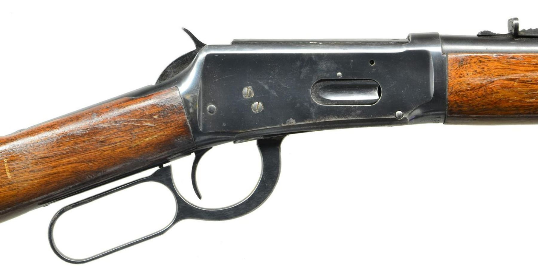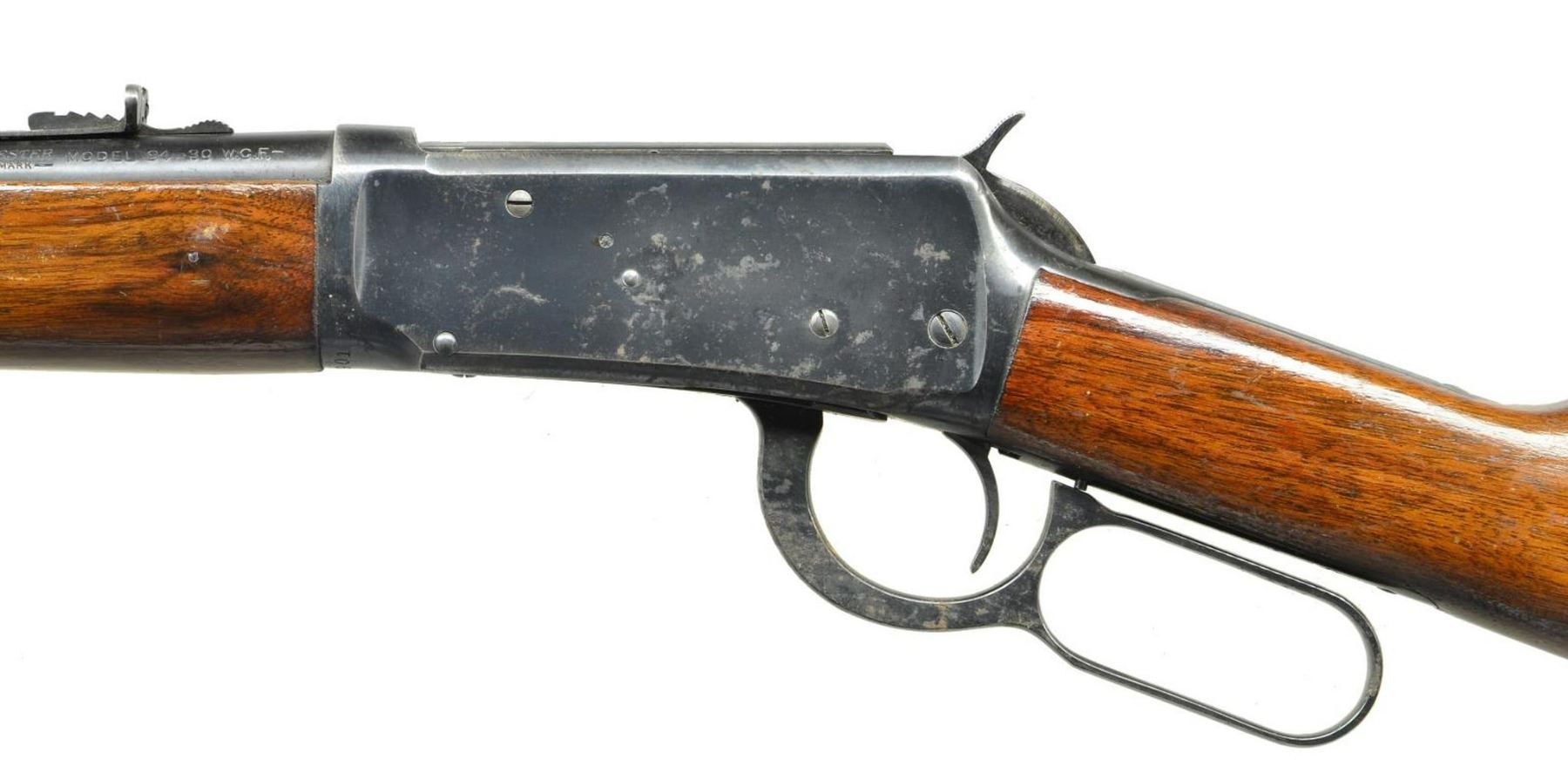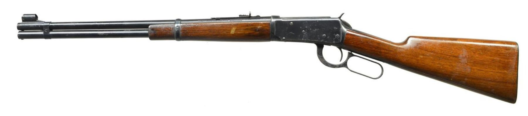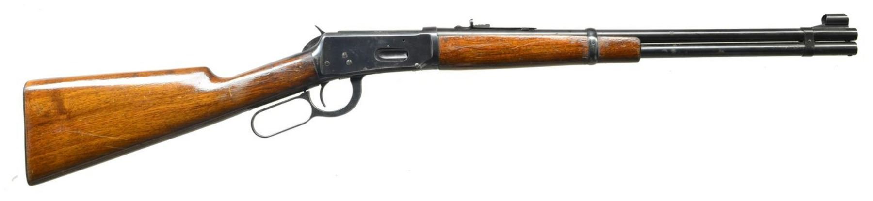 (30-30). S#. 1414901. Bbl. 20" with hooded ramp front & sporting rear sights. Full mag. flat bbl. band as associated with WWII mfg. Long wood forend & straight grip walnut stock with checkered steel buttplate. CONDNTION: 70% blue showing scattered surface corrosion. Wood has heavy coat of added finish over scratches & marks. Bore has strong rifling. (22-4596/DS). CURIO. $300-500.