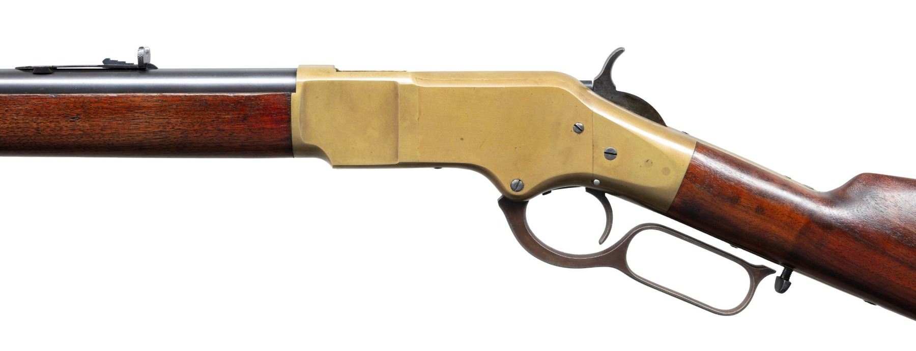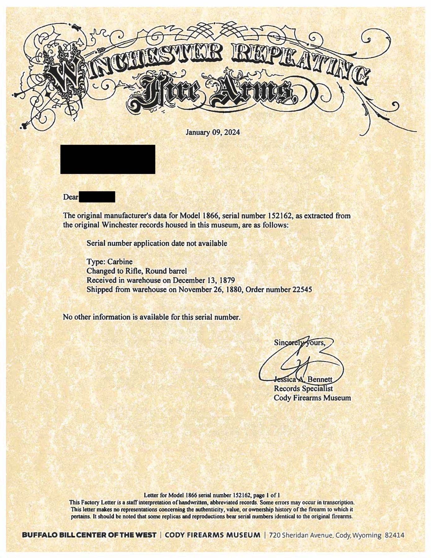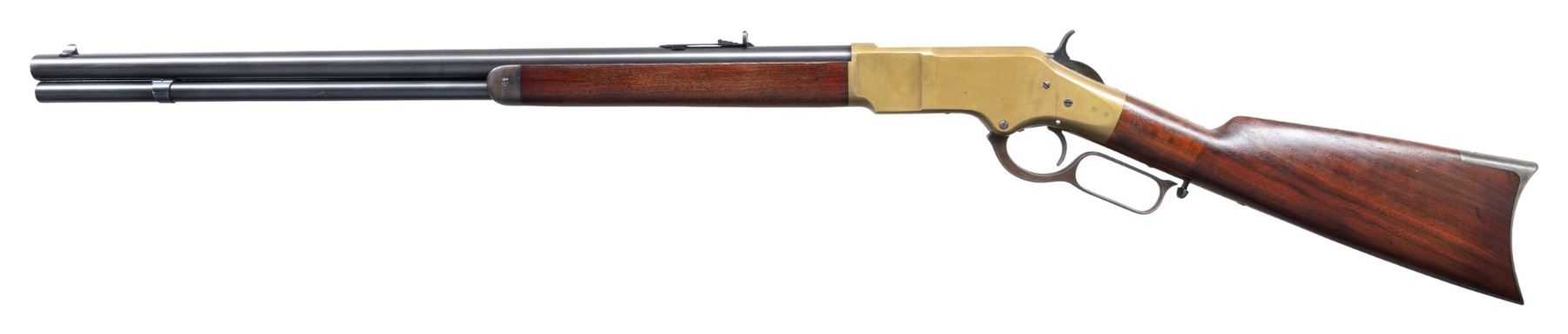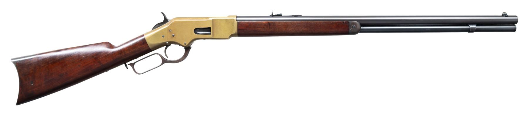 Cal. 44 HRF. S# 152162. Bbl. 24" rnd. with original blade front sight and elevator adj. rear sight. Full length mag. Brass action was originally carbine style. Left side has brass plugs in holes for saddle ring staple. Walnut forearm and straight grip stock with crescent steel trapdoor buttplate. UNATTACHED ACCESSORIES: Cody Firearms Museum letter and records check stating: "Type: Carbine/ Changed to Rifle, Round barrel/ Received in warehouse on December 13, 1879/ Shipped from warehouse on November 26, 1880, Order number 22545". CONDITION: fine, retaining over 90% bbl. and mag. tube blue showing small handling marks. Brass action exhibits a pleasing uncleaned mellow patina appearance. Original wood finish shows a few marks and small dents. Sound action. Exceptionally nice bore retains strong rifling. (01-27967/DS). ANTIQUE. $8,000-12,000.