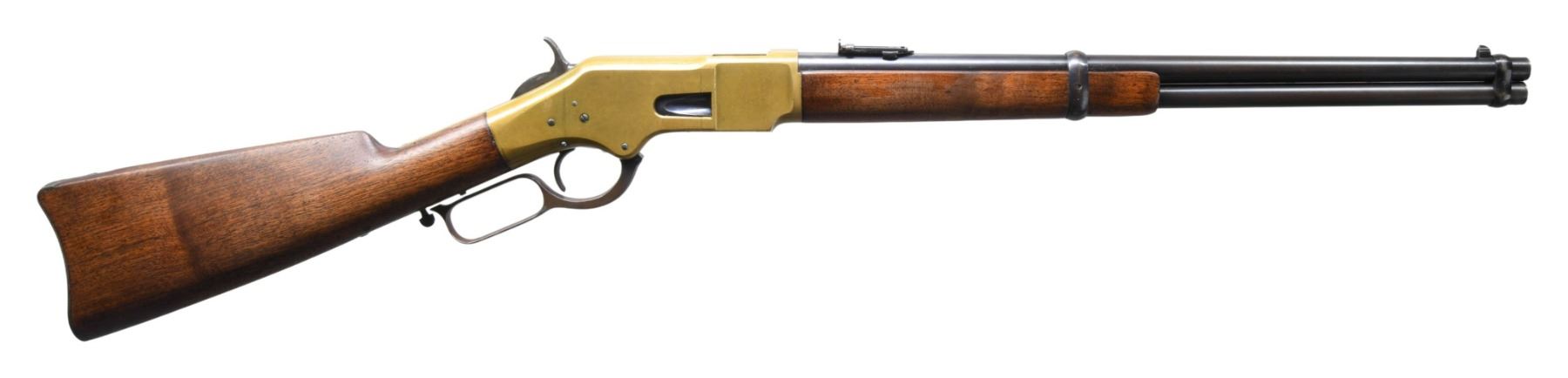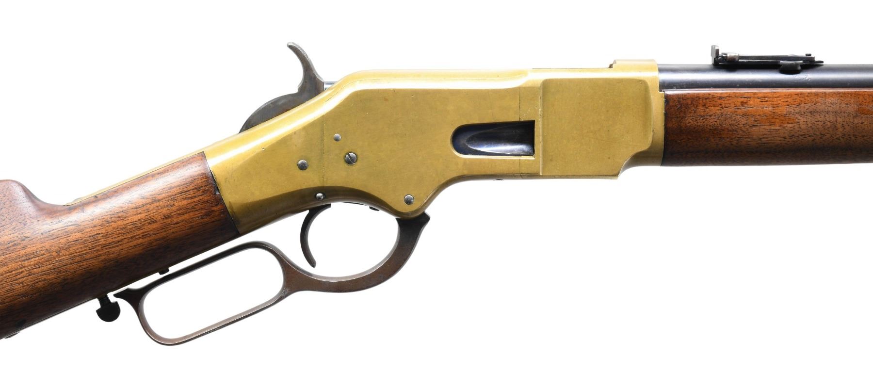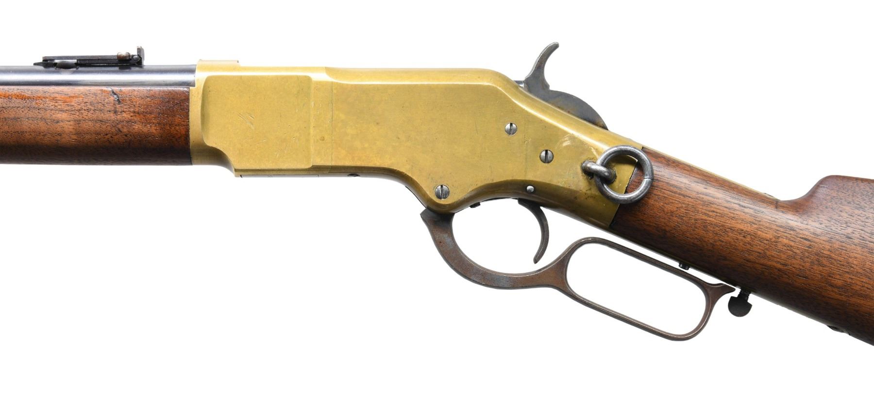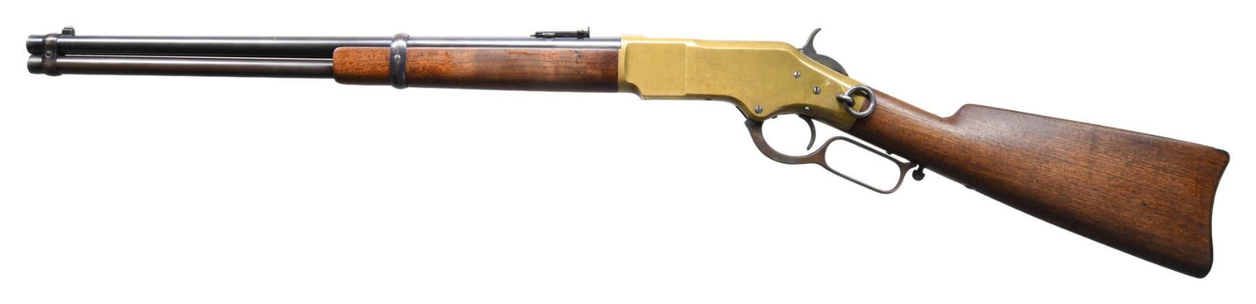 RING CARBINE. Cal. 44 HRF. S# 169022. Bbl. 20" rnd. carbine style. Fixed front sight with carbine leaf rear sight. Full length mag. Brass action with saddle ring on left side. Walnut forearm and straight grip stock with trapdoor carbine buttplate. Very late production carbine, S# indicates 1898 mfg. UNATTACHED ACCESSORIES: 4th model 3-piece cleaning rod held in the stock compartment. CONDITION: bbl. and mag. tube retain over 90% lightly faded blue showing slight carry wear. Brass receiver has a natural appearing mild patina showing scratches and marks. Sides of hammer and lever retain some visible case colors. Lightly sanded and refinished wood show a few remaining handling marks. Buttplate has touched up finish. Sound action. Bore retains sound rifling showing a slightly roughened appearance. (01-28022/DS). ANTIQUE. $10,000-15,000.